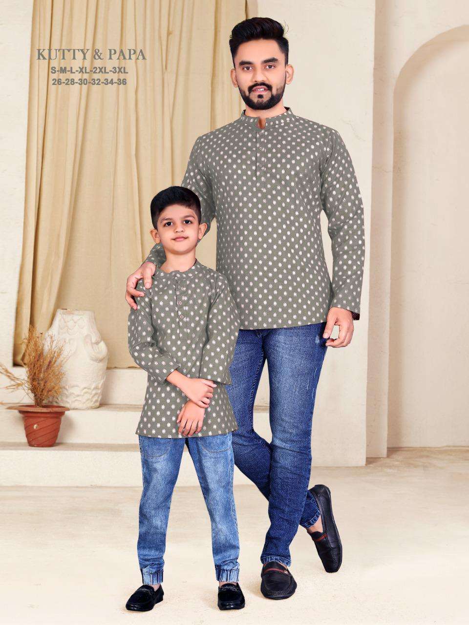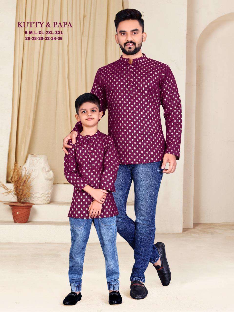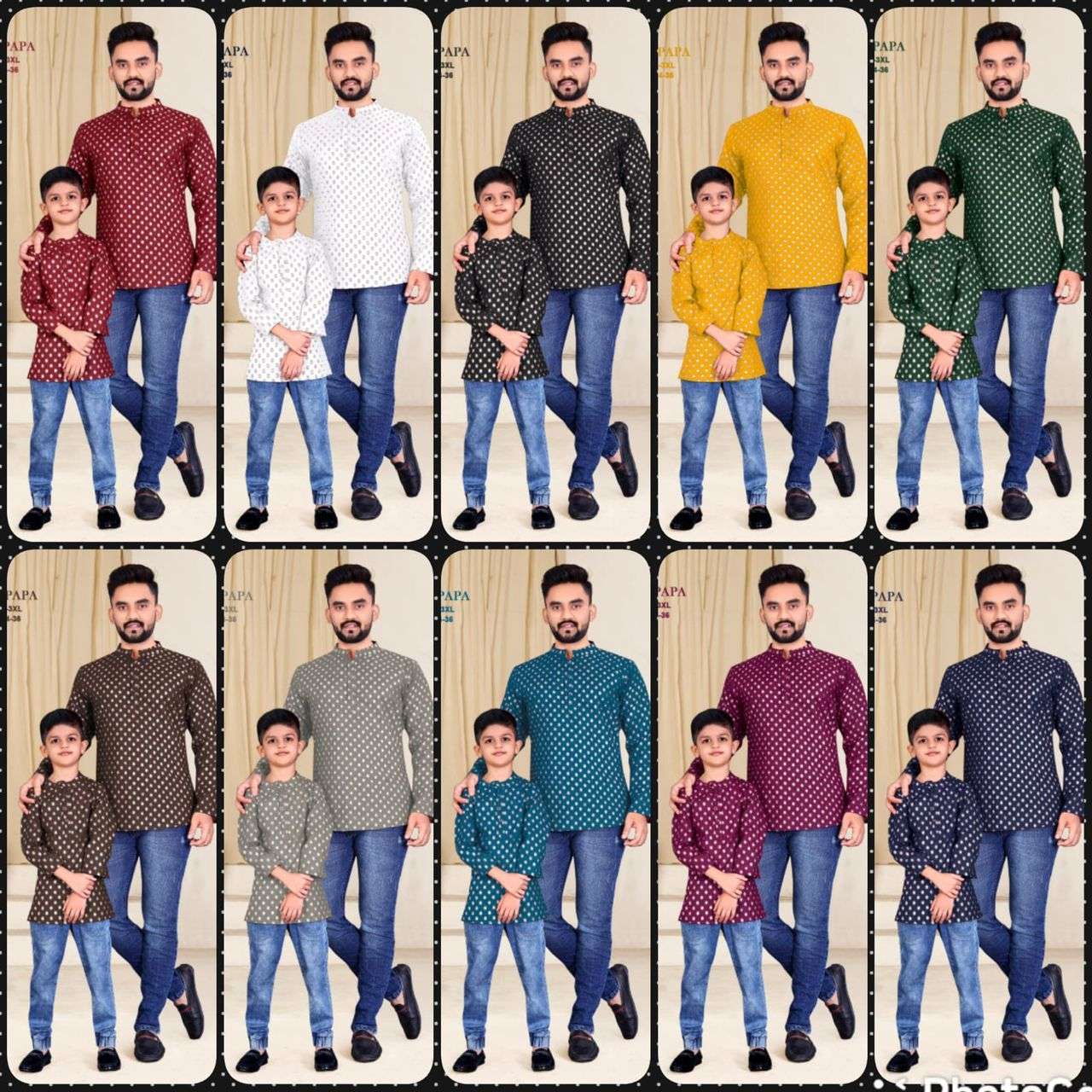 Adult and Kid's Short Kurta Name:- KUTTY & PAPA Fabric :- Cotton Slub with Foil Print Butti Color :- 10 color Size :- Price :- |