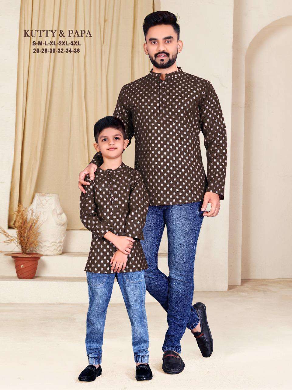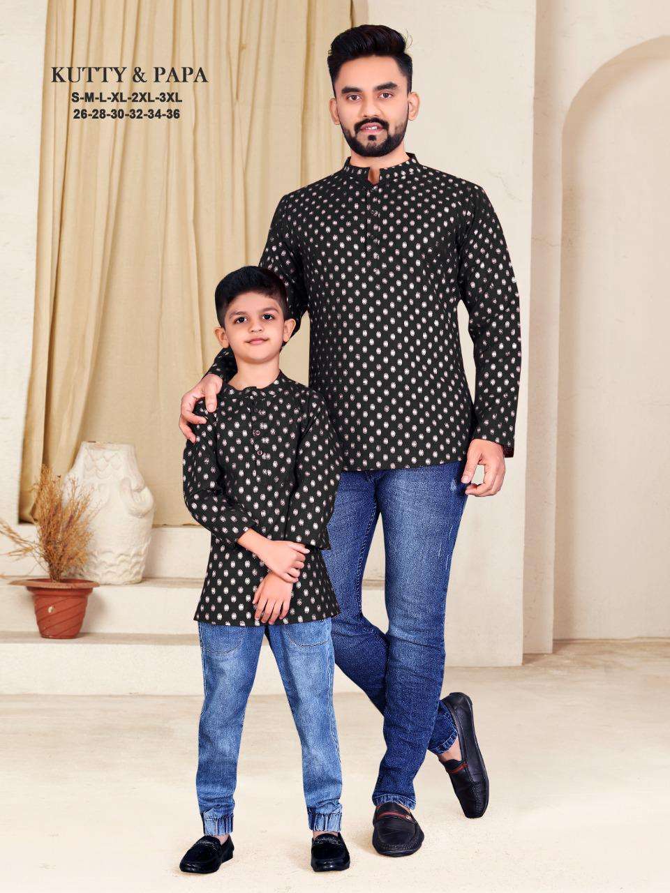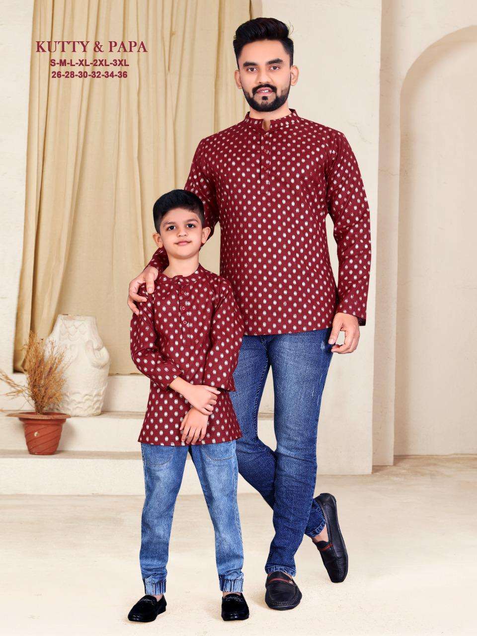 Adult and Kid's Short Kurta Name:- KUTTY & PAPA Fabric :- Cotton Slub with Foil Print Butti Color :- 10 color Size :- Price :- |