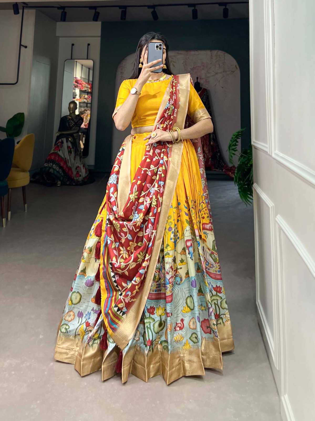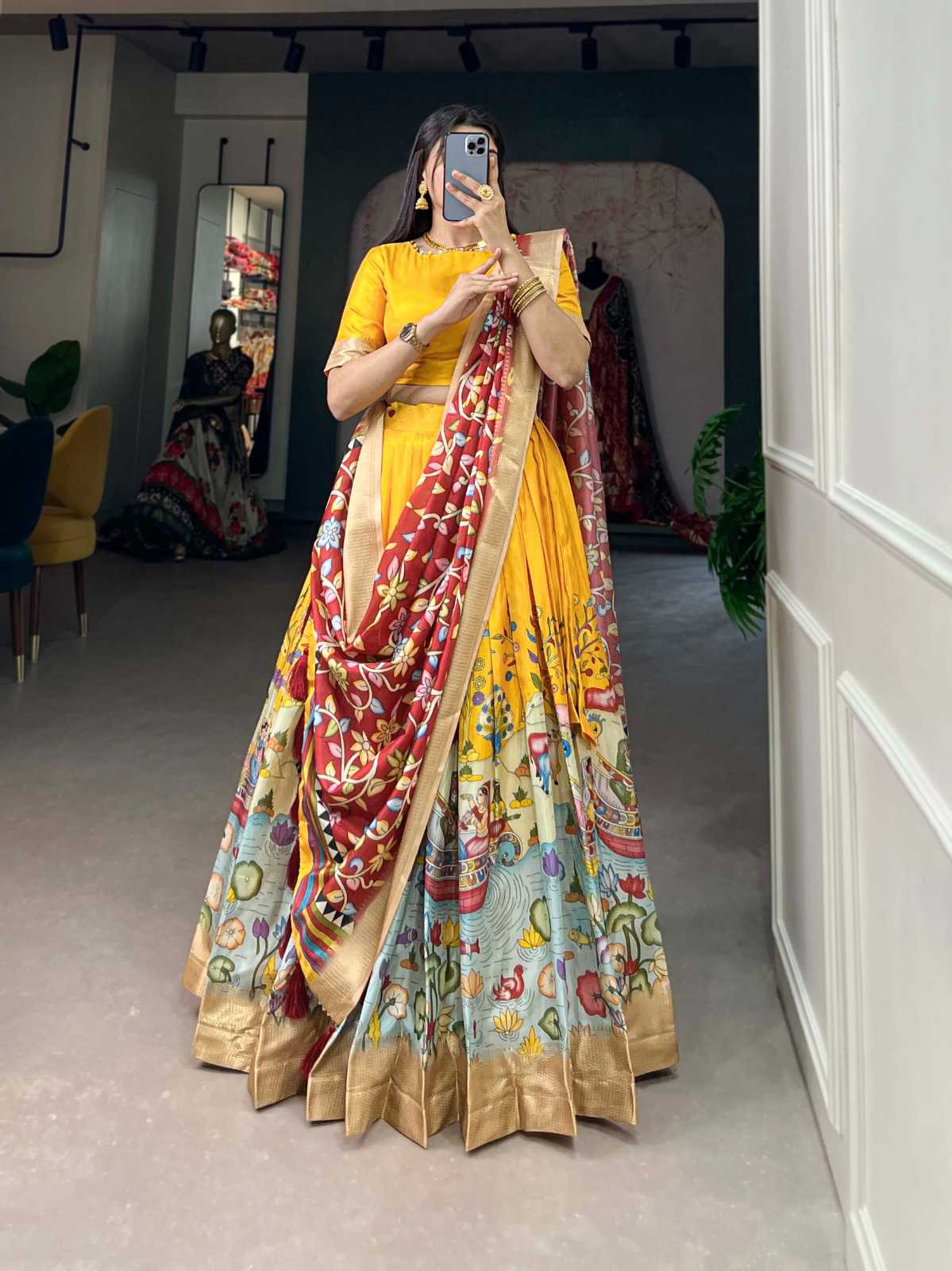 pr lnb1019 kalamkari print function style weaving border stitch lehenga unstitch choli