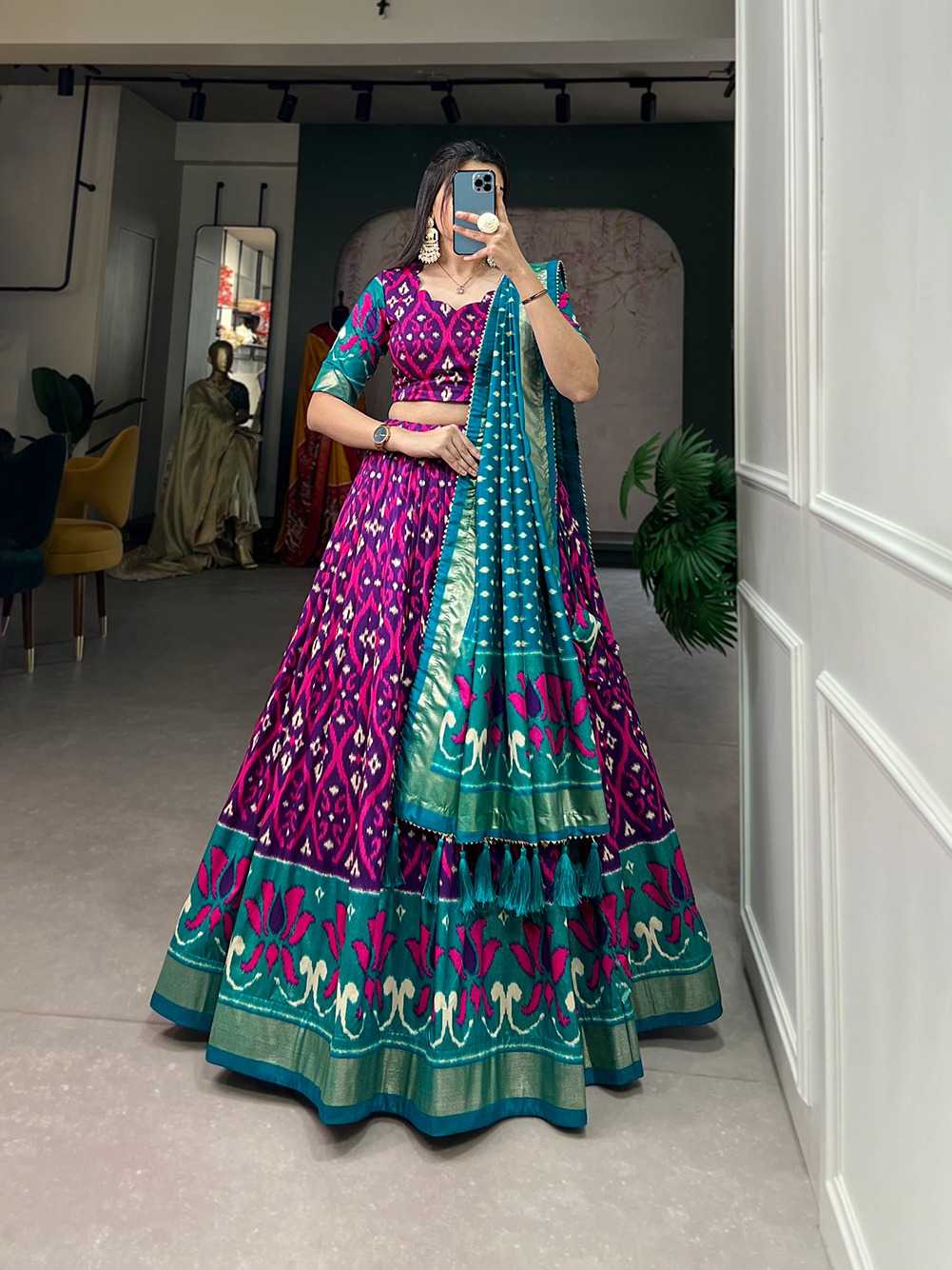 🌷Lehenga Choli🌷 A exquisite dola Silk Lehenga Set with Perfect print design to make you feel utterly divine🤩. LNB1615WIN Lehenga(Stitched) Blouse(Unstitched) Dupatta Package Contain : Lehenga, Blouse, Dupatta, Drawstring with Zip, Tassels Weight : 1.250 KG Rate : 1400 |