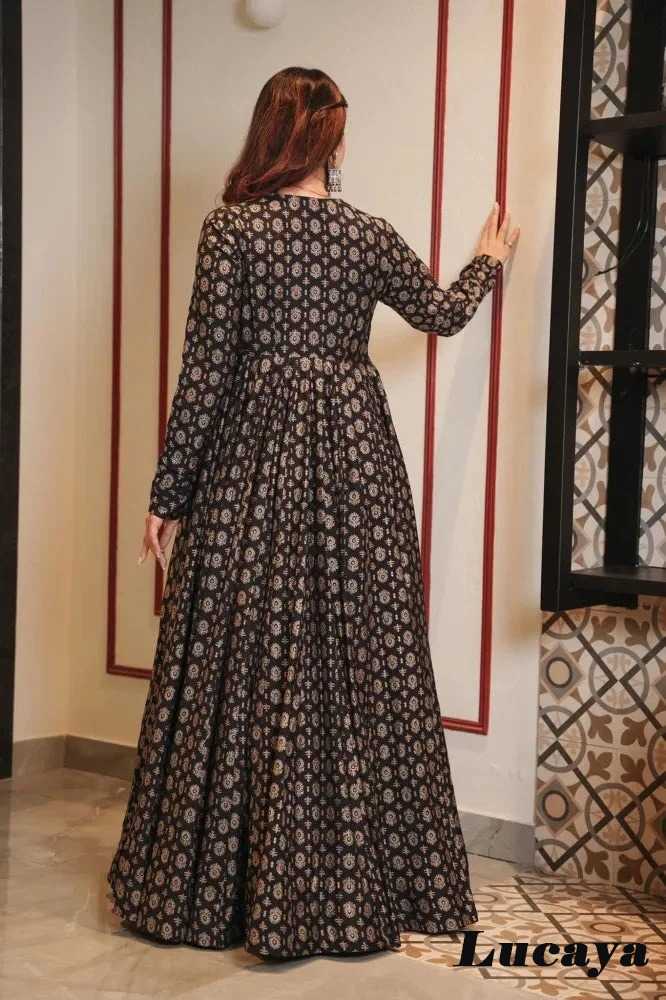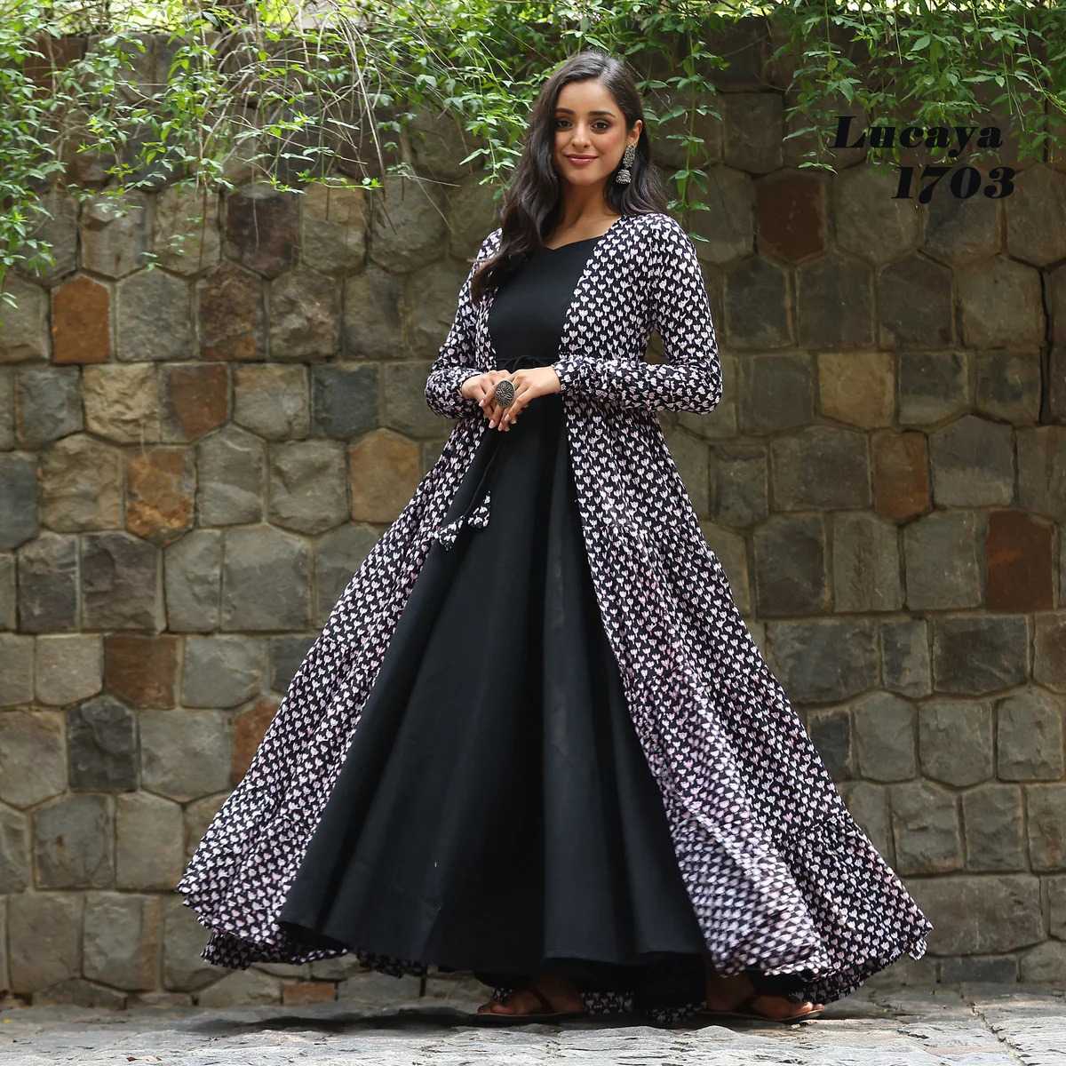 Brand - Lucaya Universal fashion presents this stunning fancy 2pcs beautiful printed shrug with gown Collection (set of 3 beautiful design 1701 to 1703) Product details Design no :- 1701 to 1702 Shrug Fabric : - Pure Maslin with heavy digital print Design no :- 1703 Shrug Fabric : - Pure Maslin with heavy digital print Inner :– Heavy Crepe Colour :- coal black, maroon, black Size :- XS(34),S(36),M(38),L(40),XL(42),XXL(44),3XL(46),4XL(48),5XL(50),6XL(52) Stitched type:- Full stitched , fully flared Style :- Festival Wear, Function, Ceremonial, Wedding Wear, Party Wear Rate – 1199/- per pcs GST – 5% Disclaimer: Colour Of The Garment May Differ From The Picture By 10-12% |