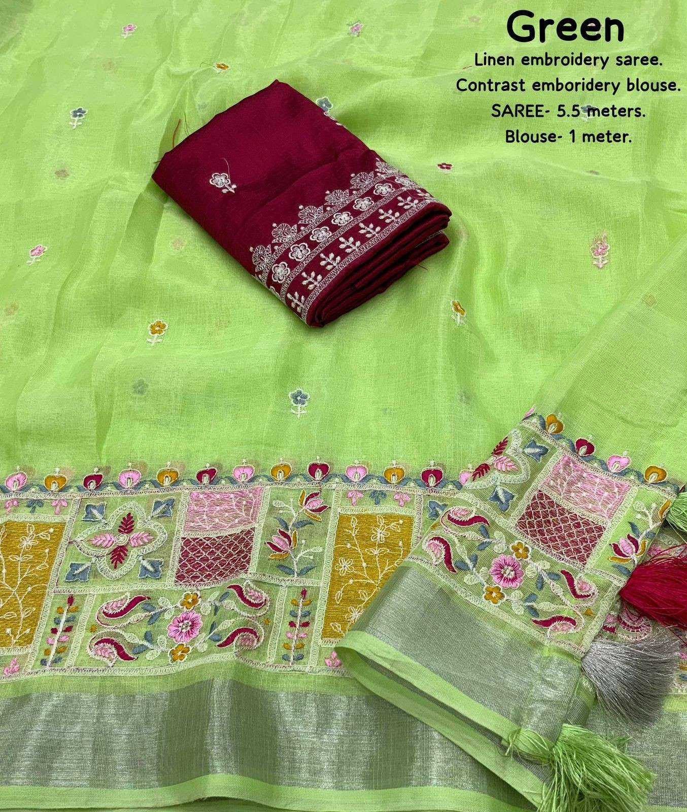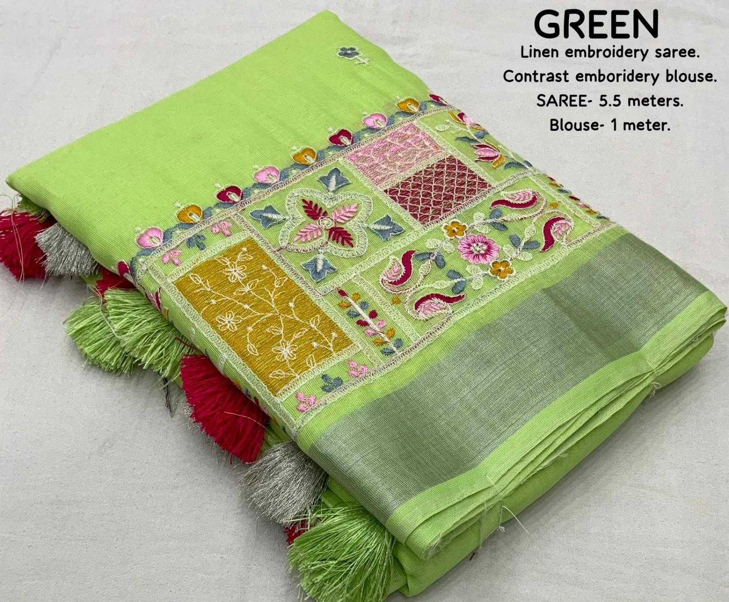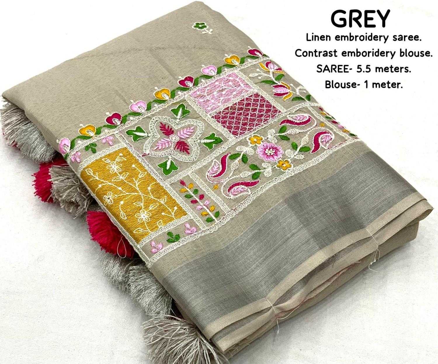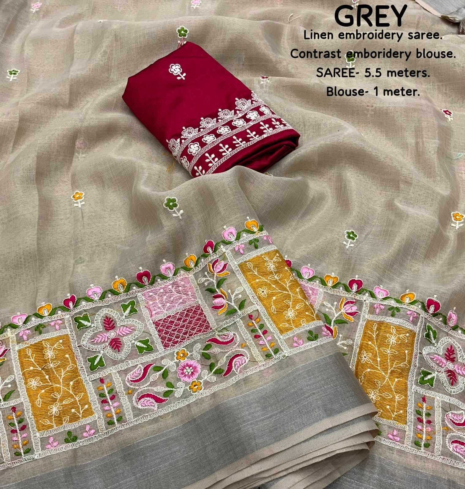 new arrivals New silver linen catalog Lucknowi linen (vol-2) Quality- soft linen saree with silver woven pattu border. Multicolour designer emboridery. Cotton tassels on pallu. Blouse- contrast phantom silk with white thread embroidered blouse. Rate- 999/- Saree- 5.5 meters. Top trusted quality |