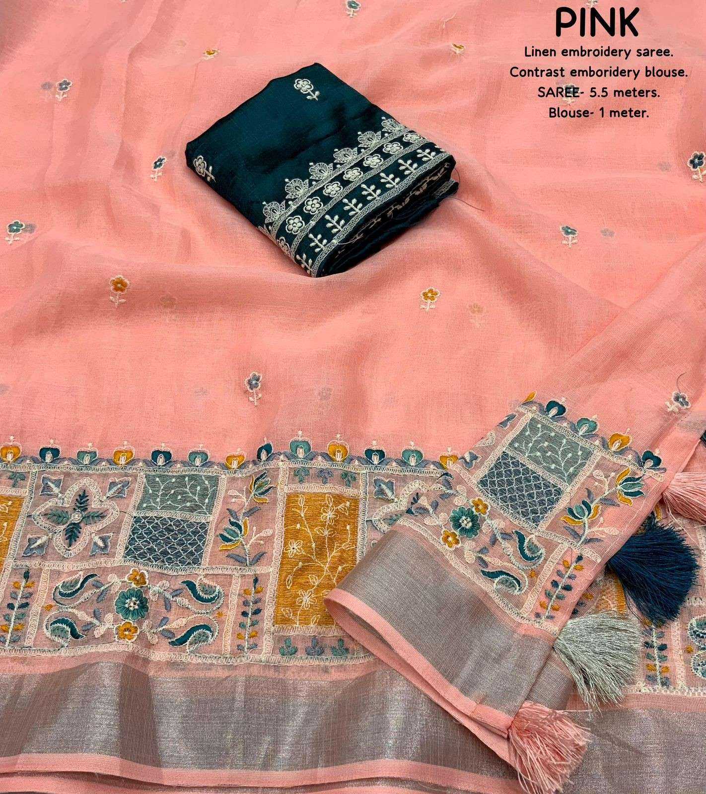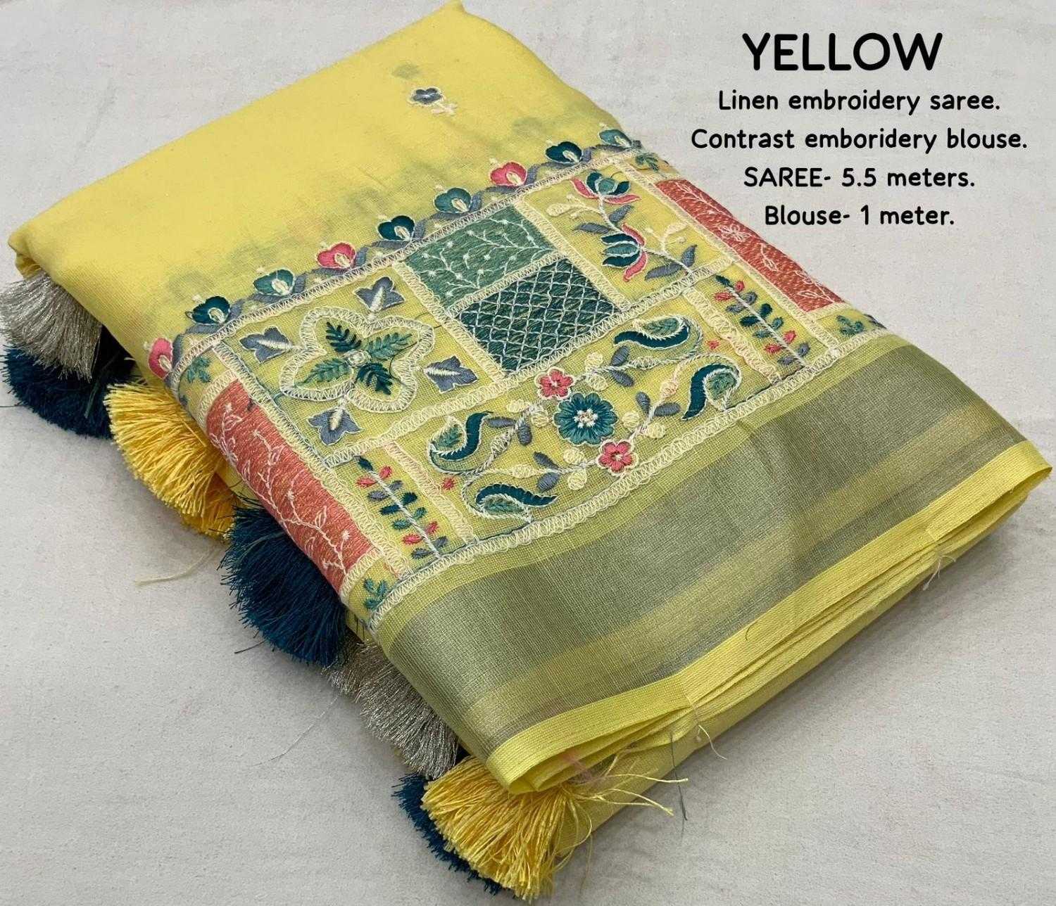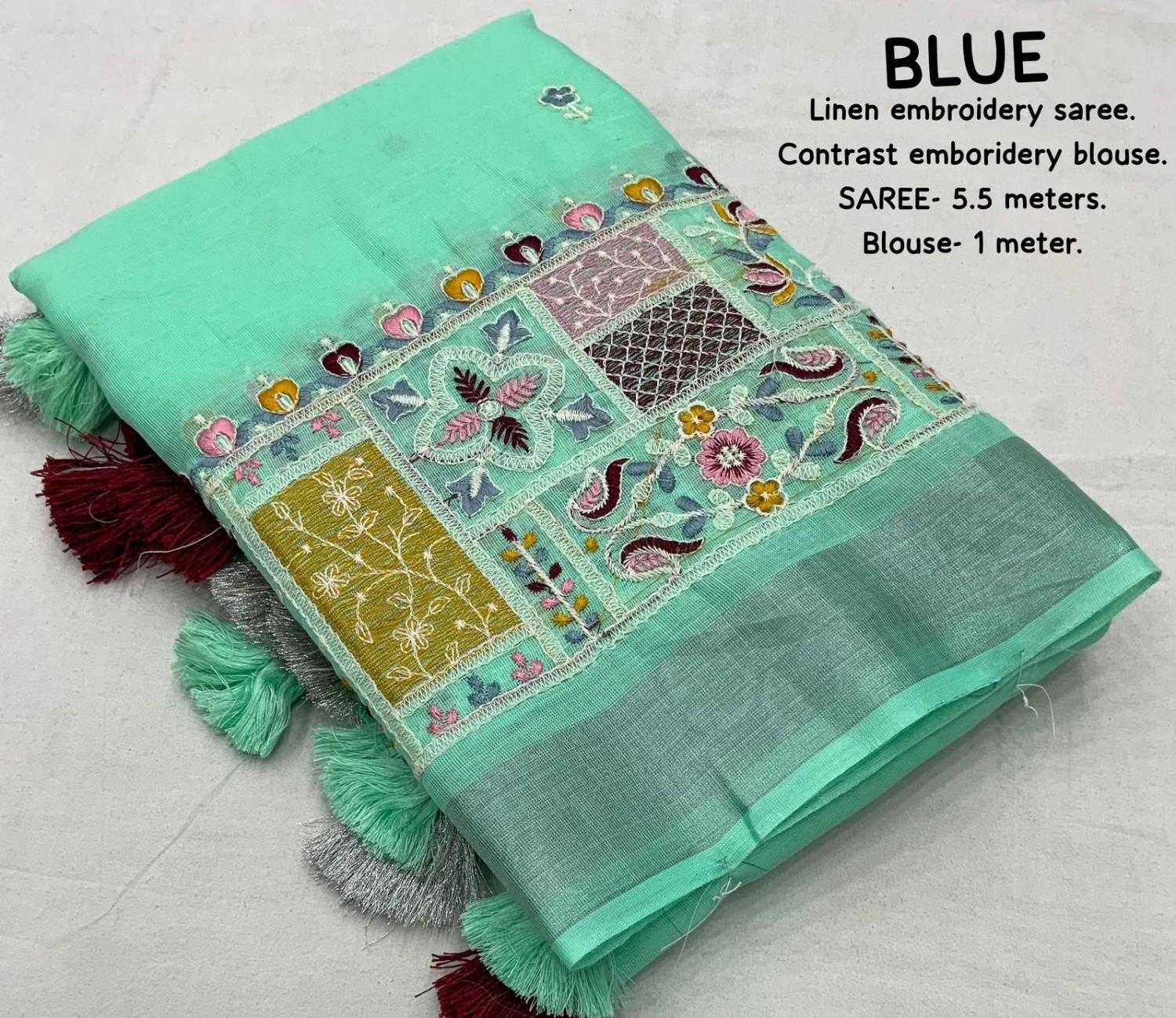 new arrivals New silver linen catalog Lucknowi linen (vol-2) Quality- soft linen saree with silver woven pattu border. Multicolour designer emboridery. Cotton tassels on pallu. Blouse- contrast phantom silk with white thread embroidered blouse. Rate- 999/- Saree- 5.5 meters. Top trusted quality |