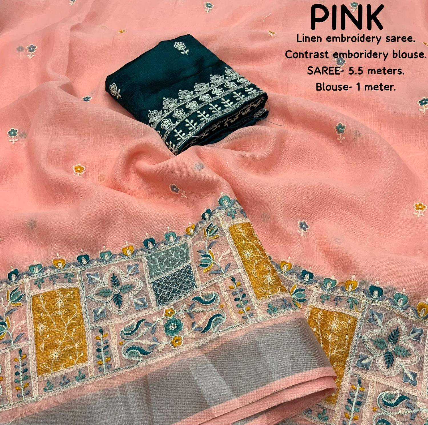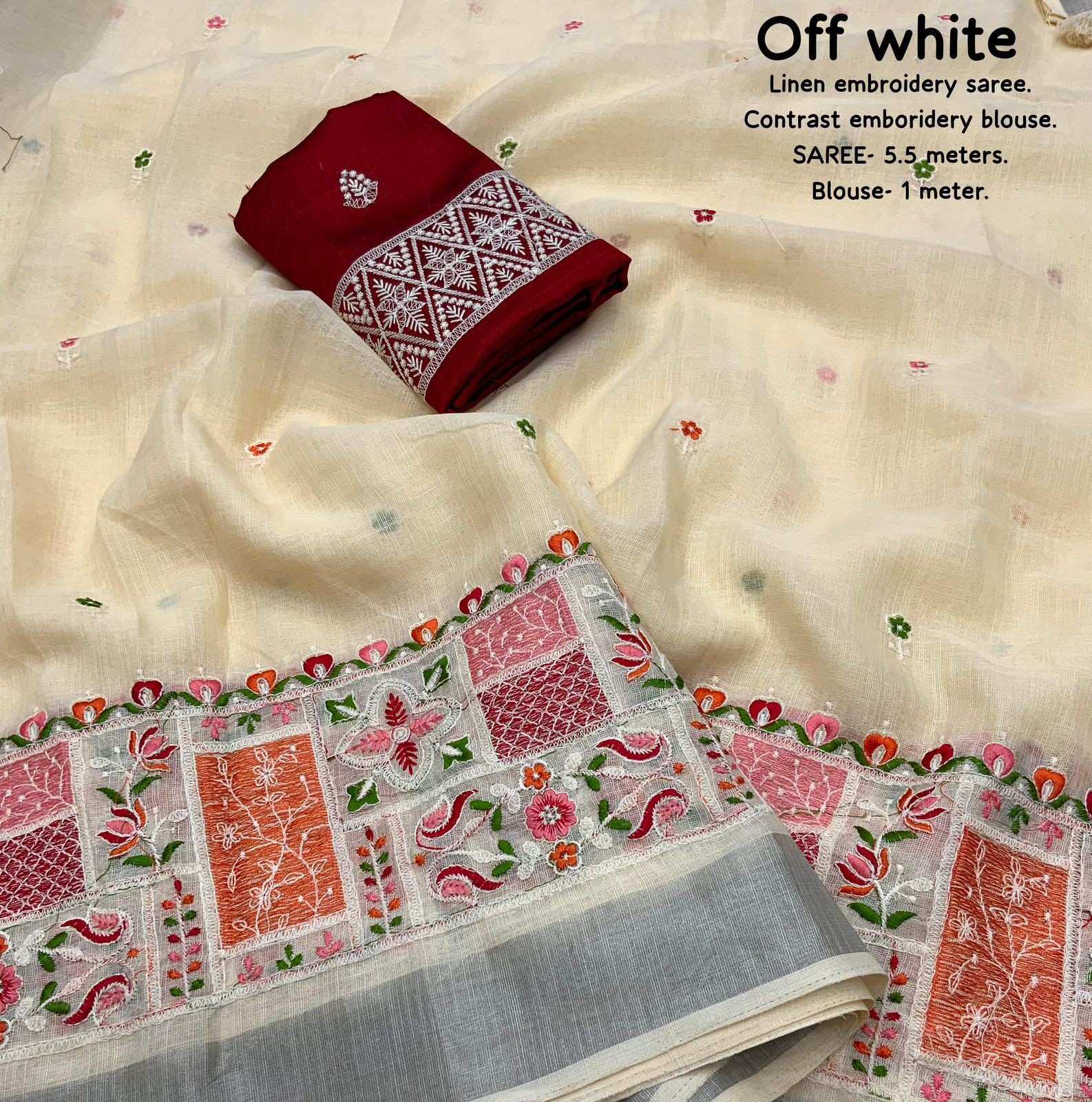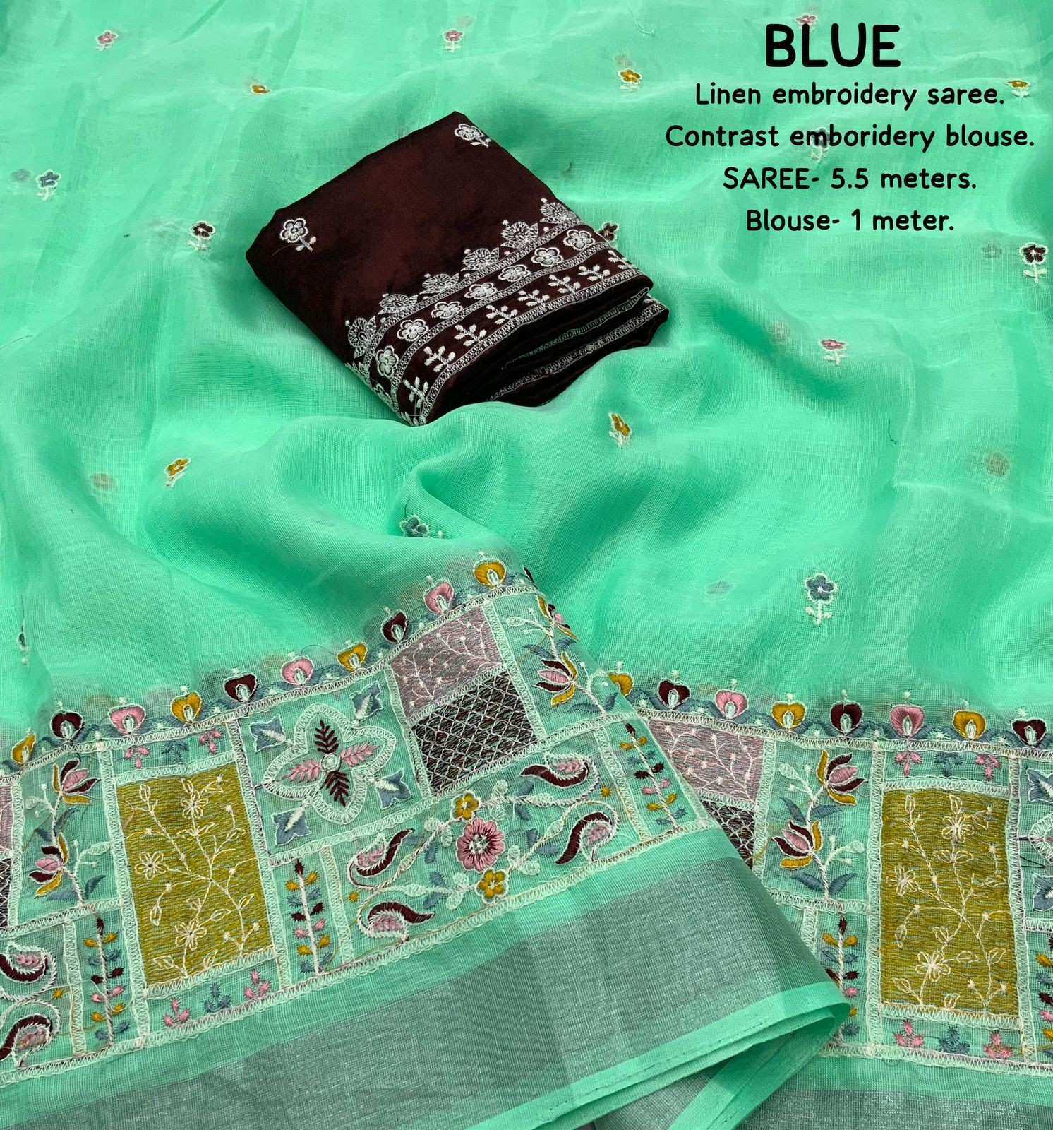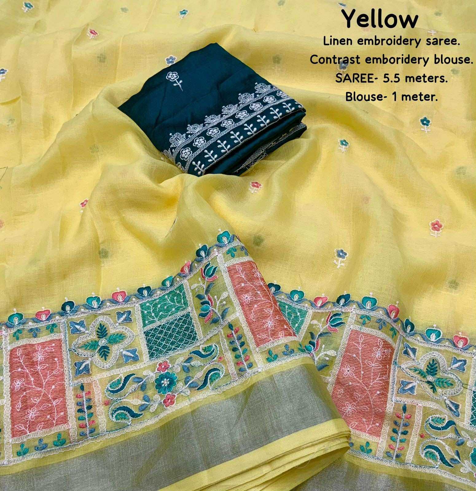 new arrivals New silver linen catalog Lucknowi linen (vol-2) Quality- soft linen saree with silver woven pattu border. Multicolour designer emboridery. Cotton tassels on pallu. Blouse- contrast phantom silk with white thread embroidered blouse. Rate- 999/- Saree- 5.5 meters. Top trusted quality |