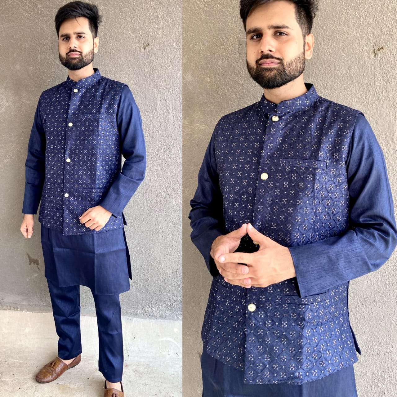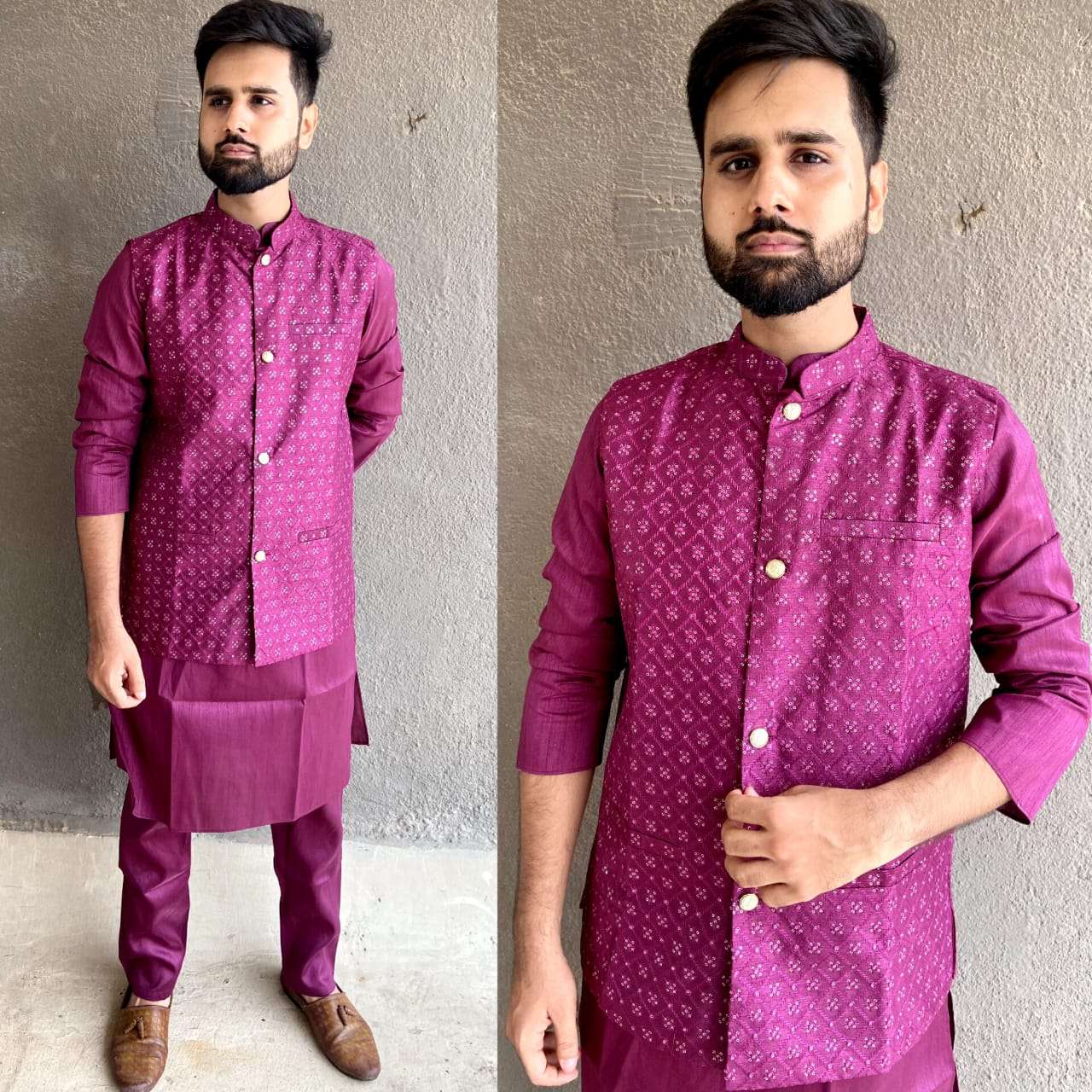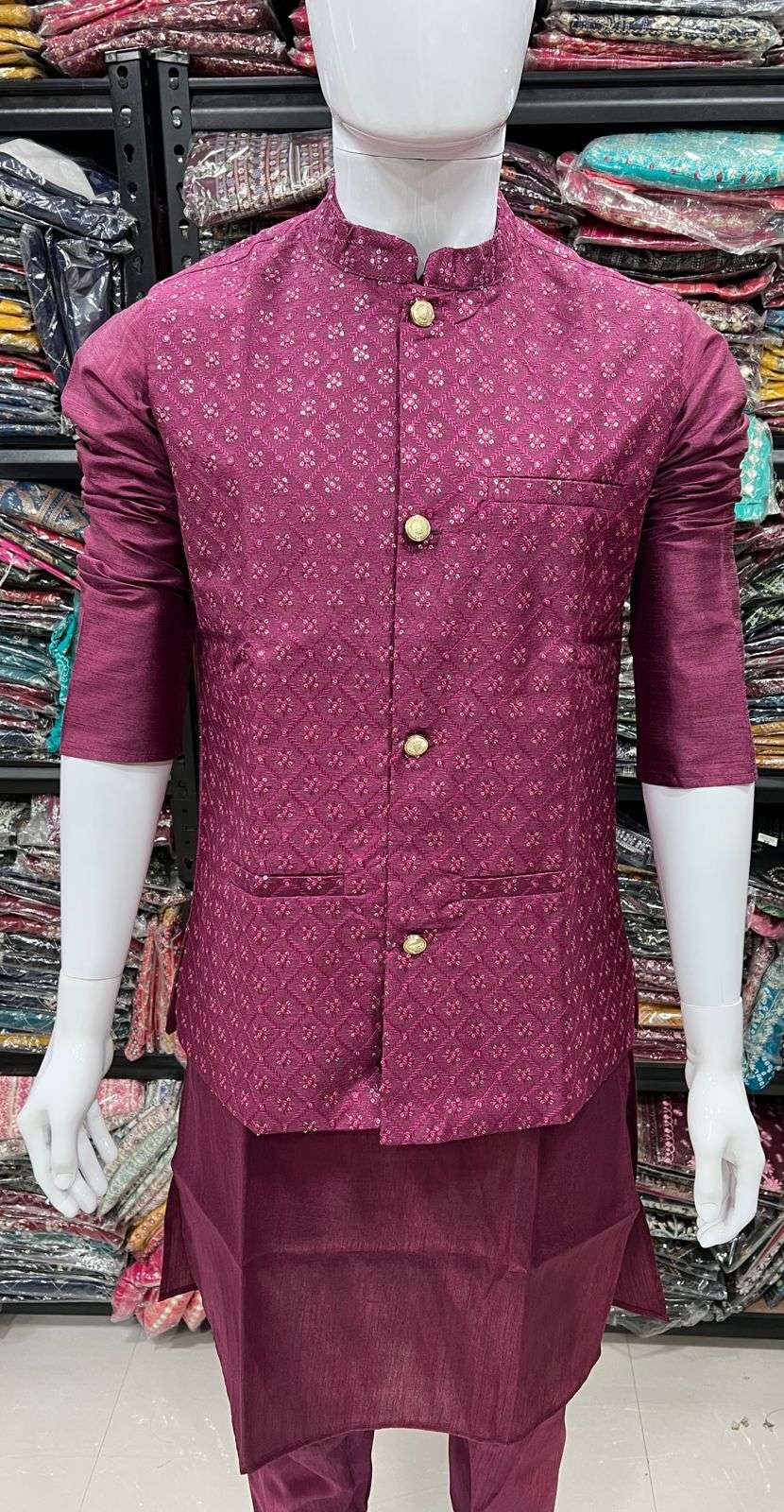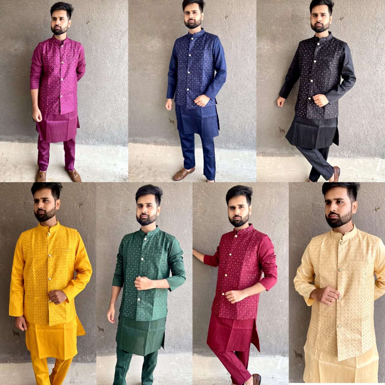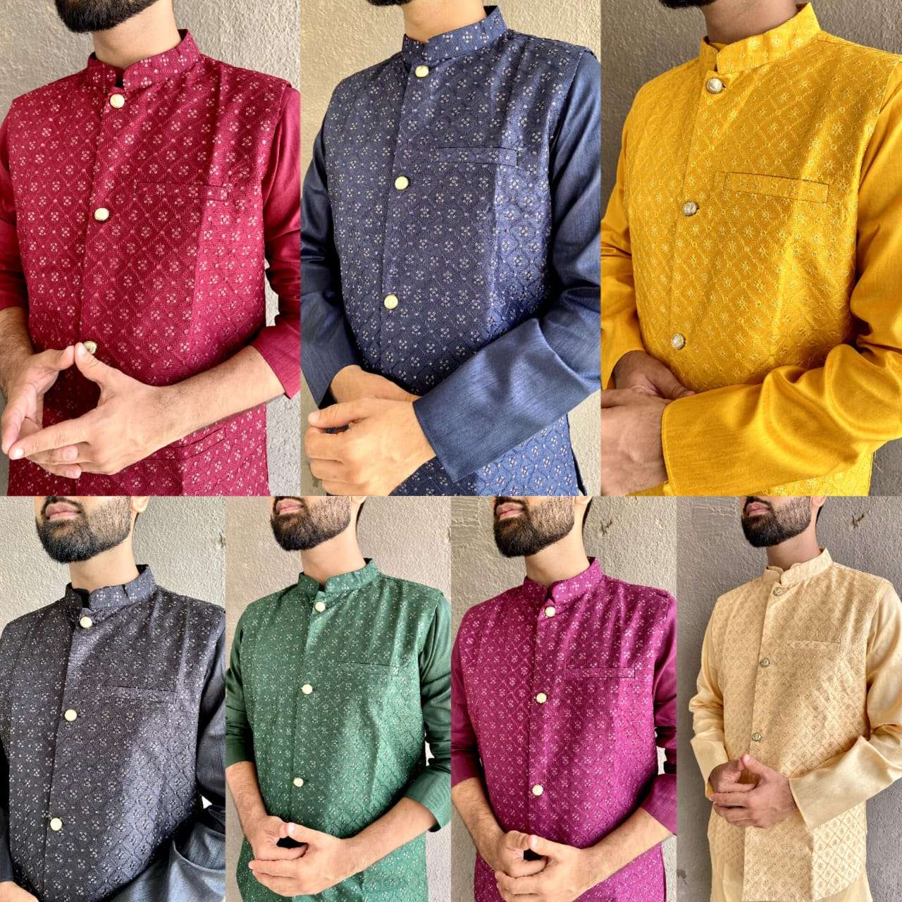 Manyavar 🤴 Kurta - Pant - Koti set Ready to Wear in best 7 Trending Color Fabric: Kurta: Heavy Banglori Silk Polo pant: Heavy Banglori Silk Koti: Heavy Banglori Silk Size: Price: 999/-rs Tailor Finish Stitching |