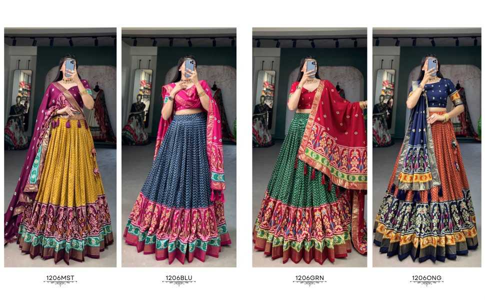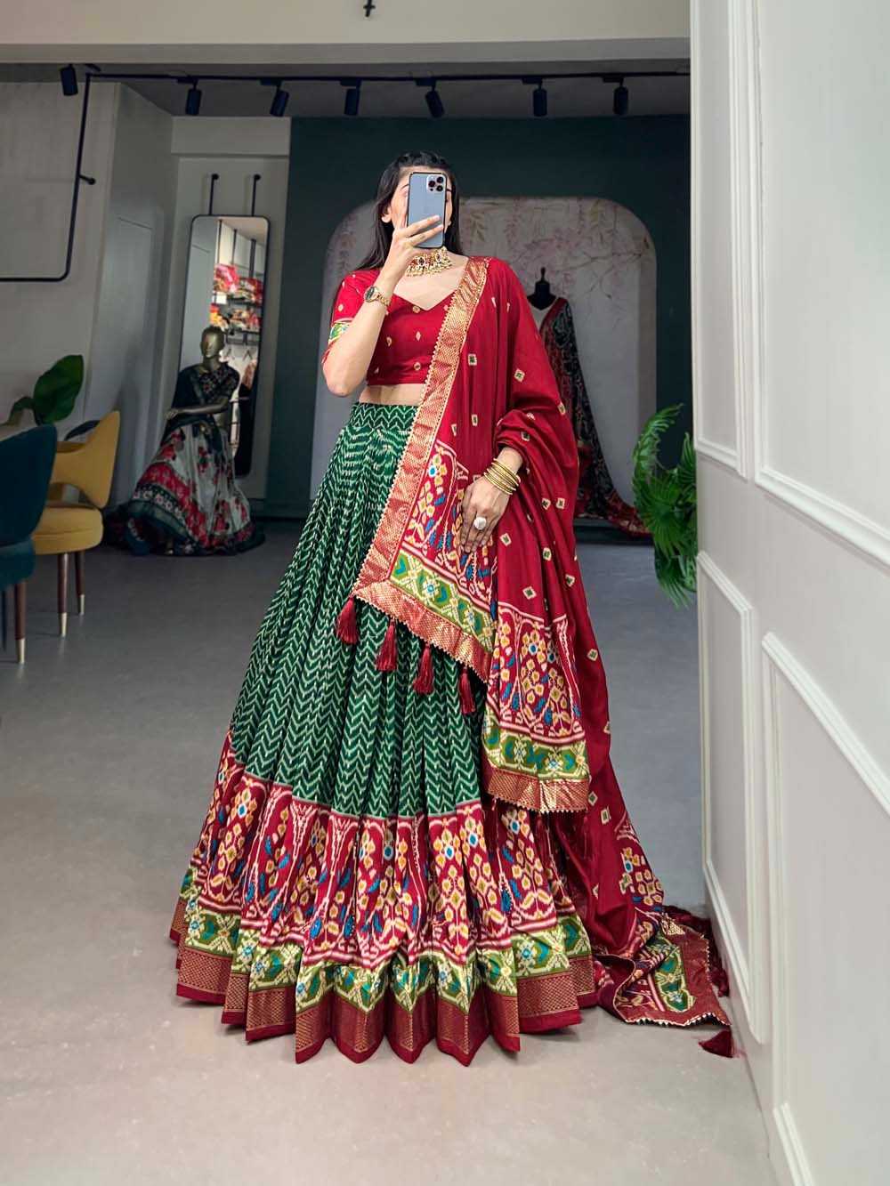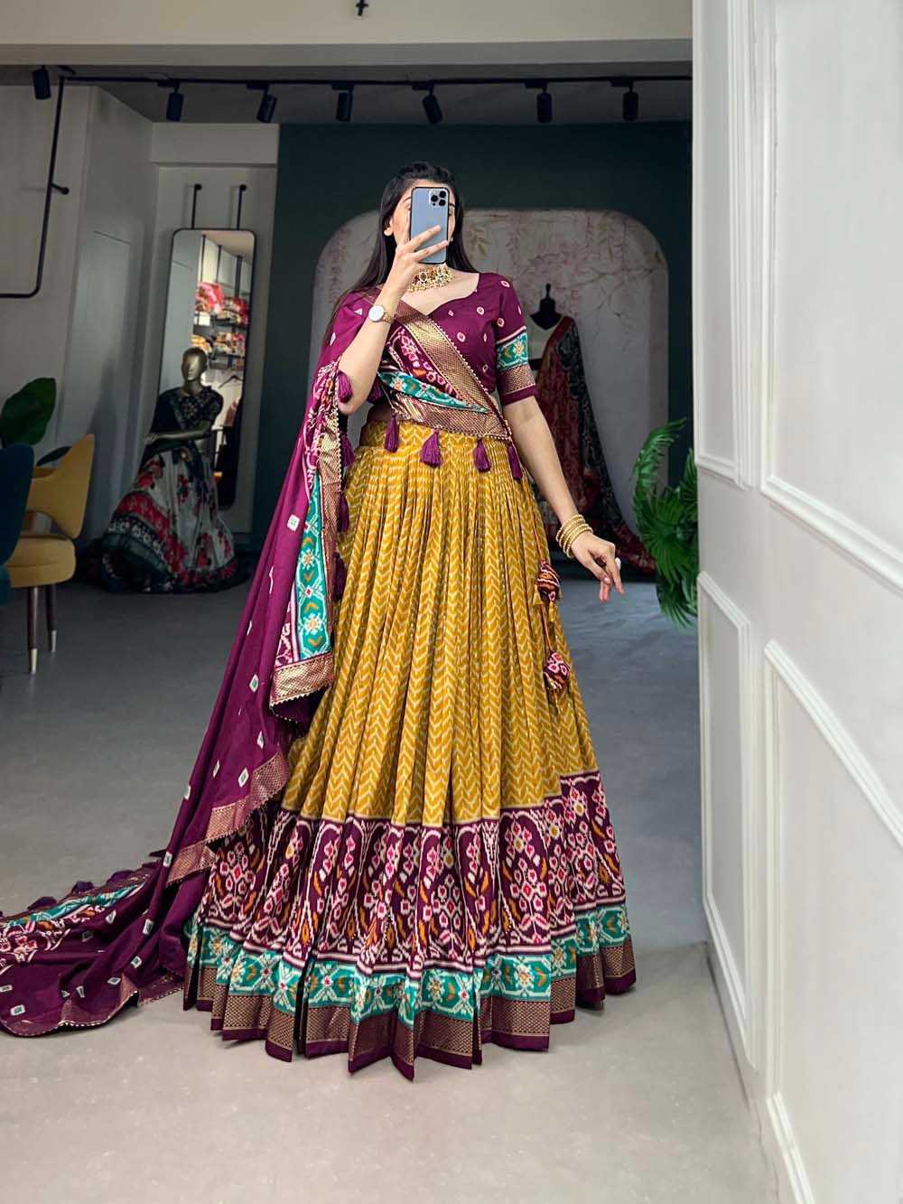 pr nidhi tussar silk patola new trendy stitch lehenga unstitch blouse dupatta
