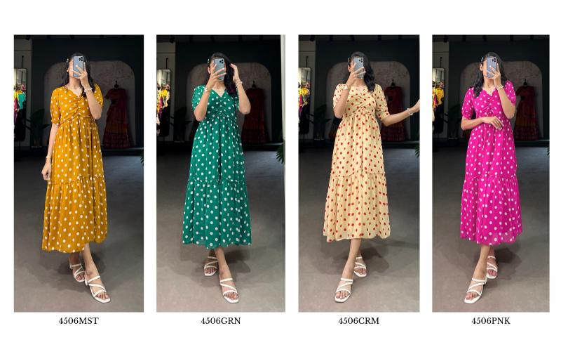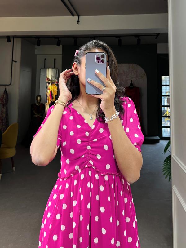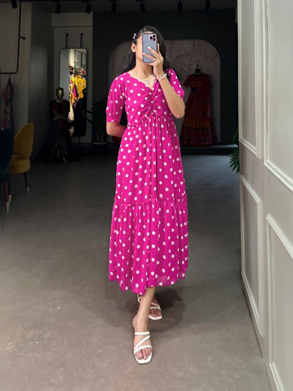 🌷Ethnic Collection🌷 Step Back in Time with Our Vintage Polka Dots Print Georgette Long Frock - The Perfect Blend of Retro Charm and Modern Elegance 👗 NNK4506PNK Frock(Stitched) Weight : 0.350 kg Rate : 549/- |