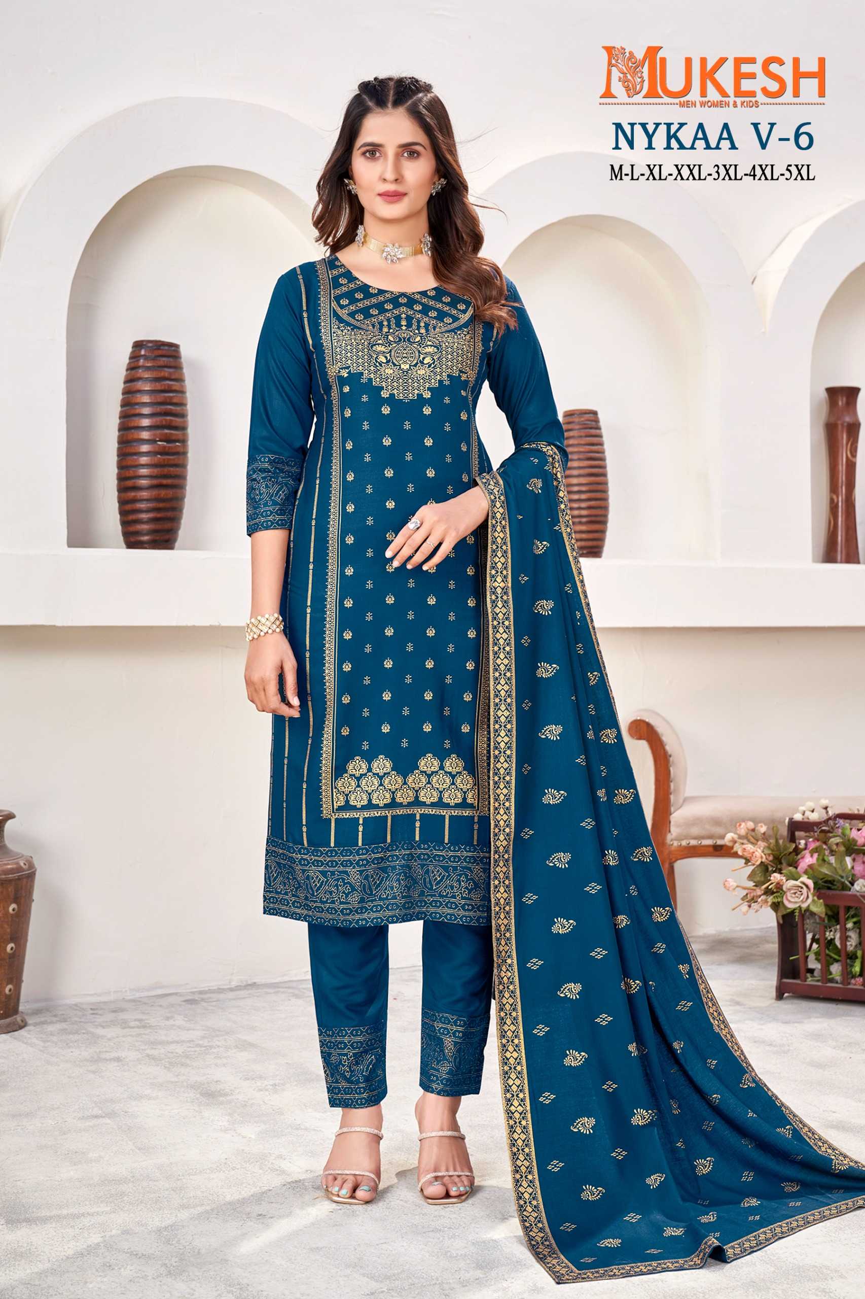 💐 NYKAA V-6💐 👗. TOP RAYON GOLD PRINT 👖 BOTTOM RAYON 🧣 DUPTTA RAYON GOLD PRINT ➖ M L XL XXL 3XL 4XL 5XL 1-DESIGN Rate : 699/- |