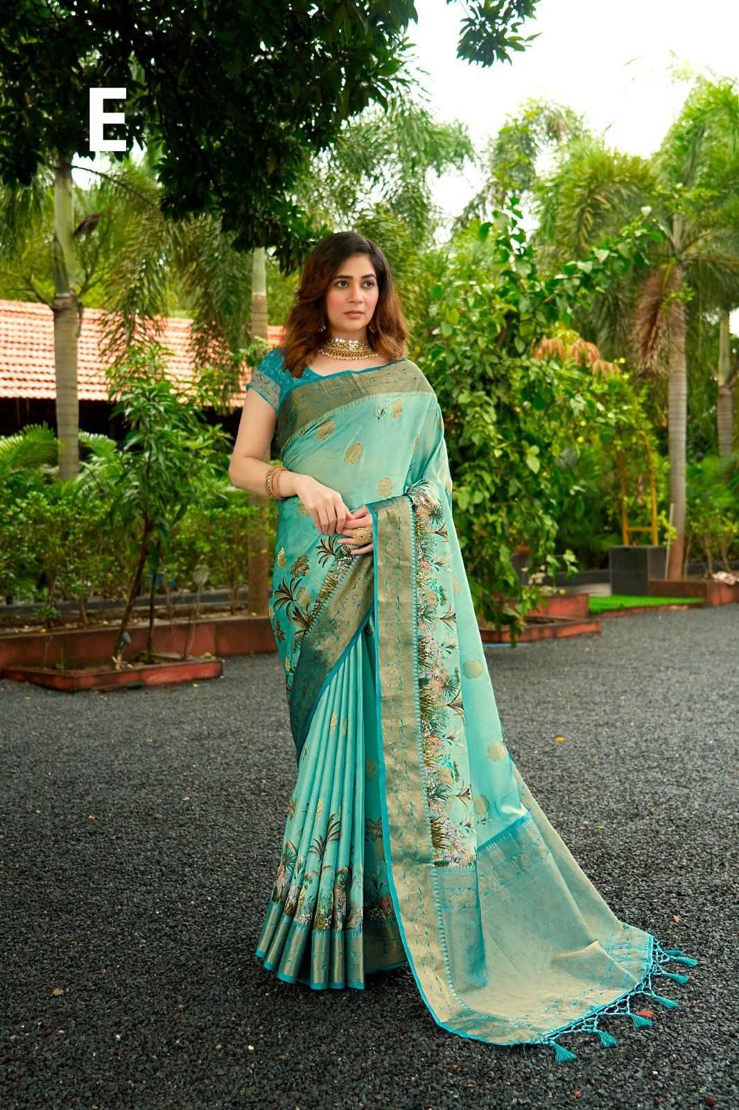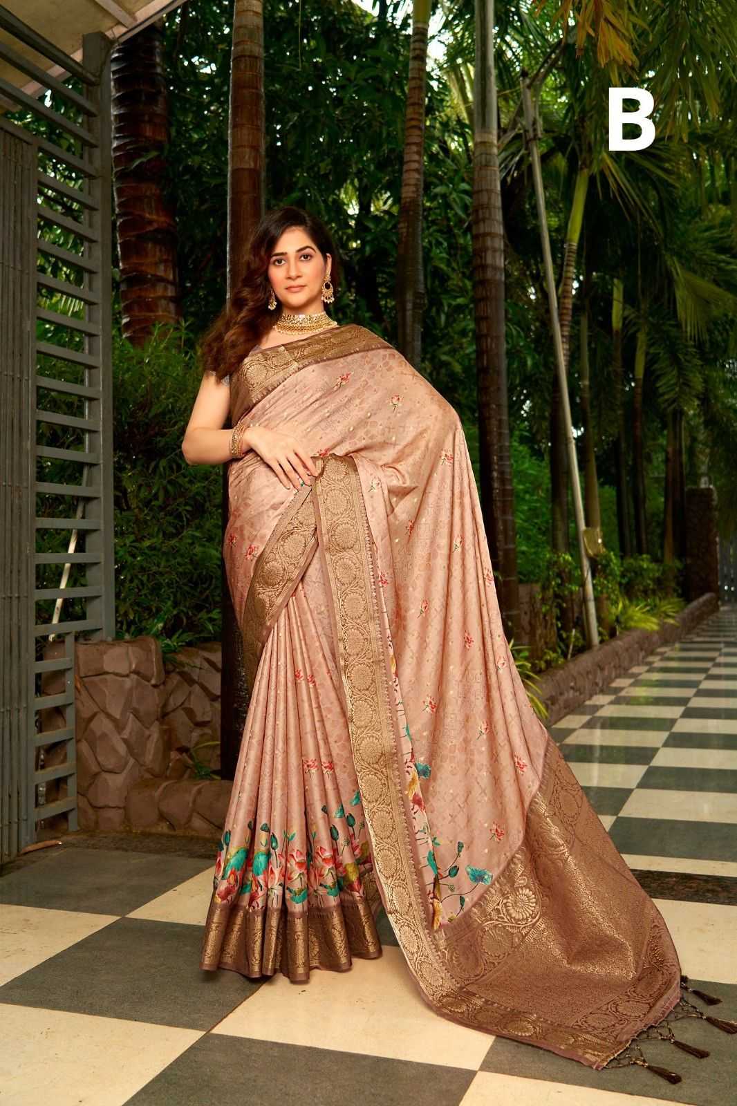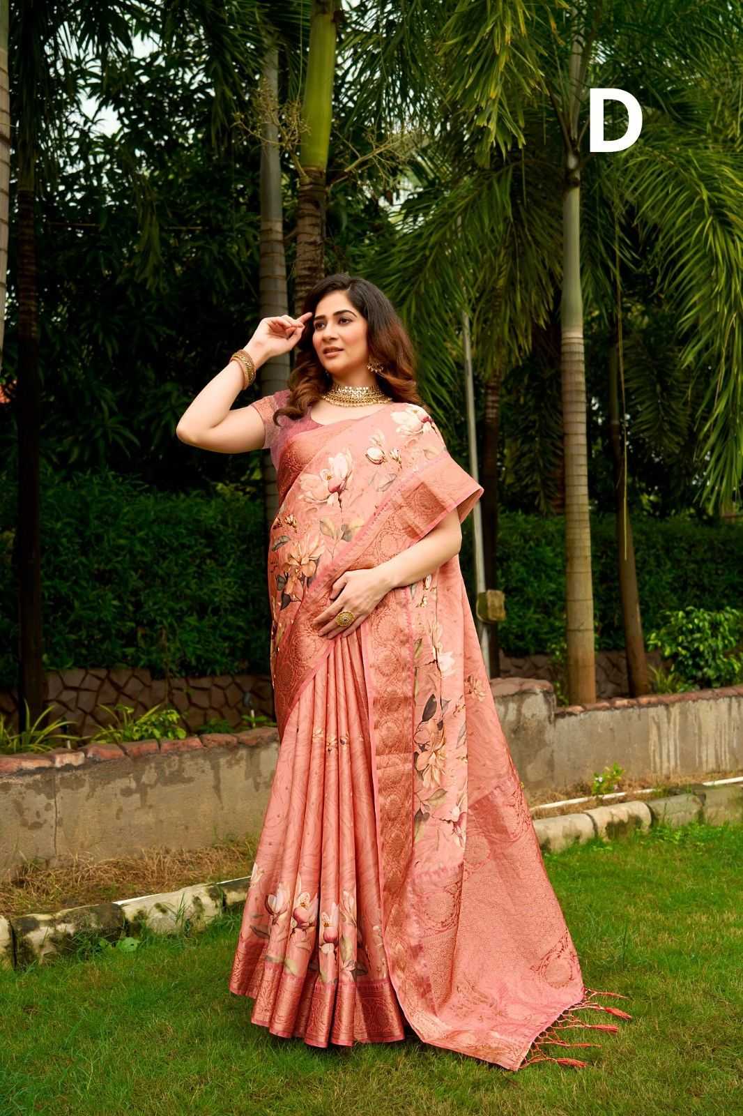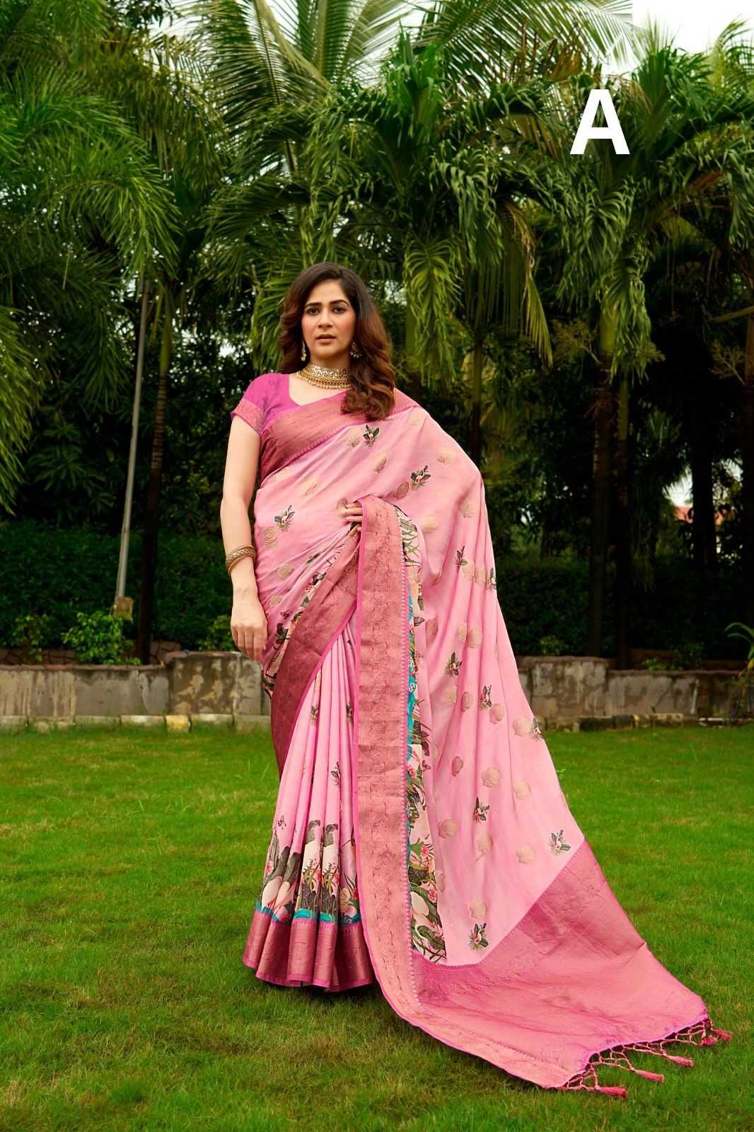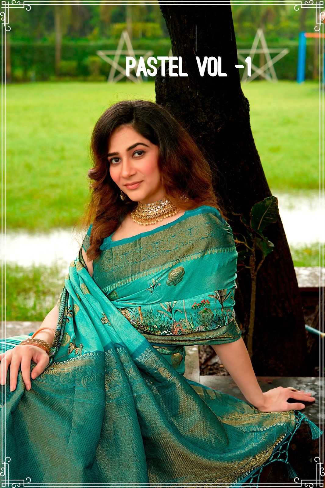 The Feminine Charm And Melodic Grace Of This Pastel Saree Add A Touch Of Sophistication And Elegance To Your Look Catalog Name : Pastel Vol -1 Series: A to H Saree Fabric : Soft Weaving Sartin Fabric With Rich Pallu & Digital Print Or Attached Tussles On Pallu Blouse Fabric : Jacquard Occasion : Festival Wear, Party Wear |
