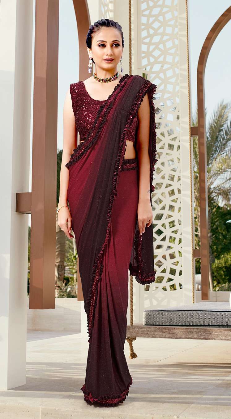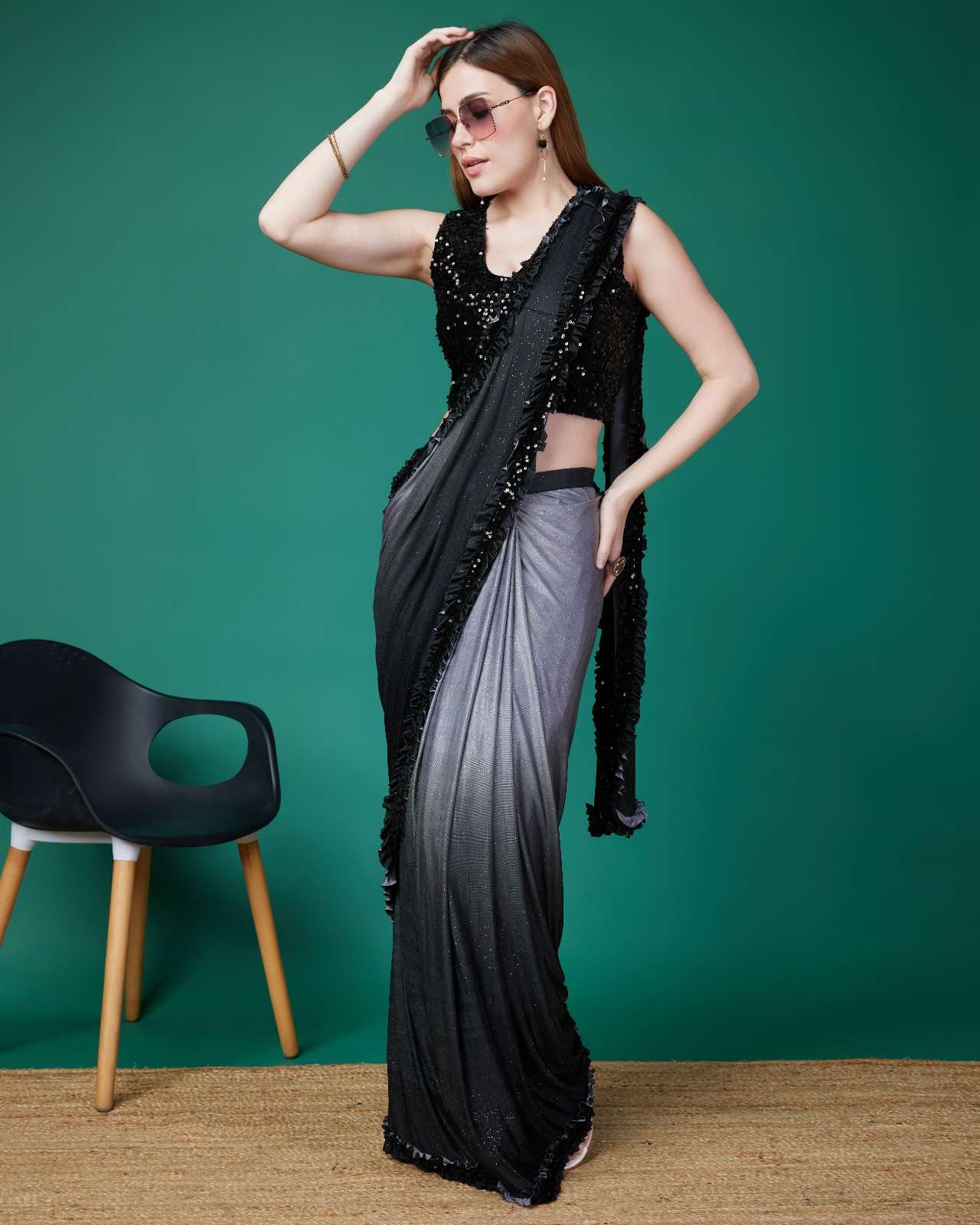 NEW DESIGN ADDED IN DRIVE LINK DESIGN NO 101714 BLOUSE IMPORTED SEQUIN WORK SAREE OMBRE IMPORTED FABRIC WITH IMPORTED SEQUIN BORDER SIZE 36 (READY) 5 COLOURS AVAILABLE RATE 1075+5% GST |