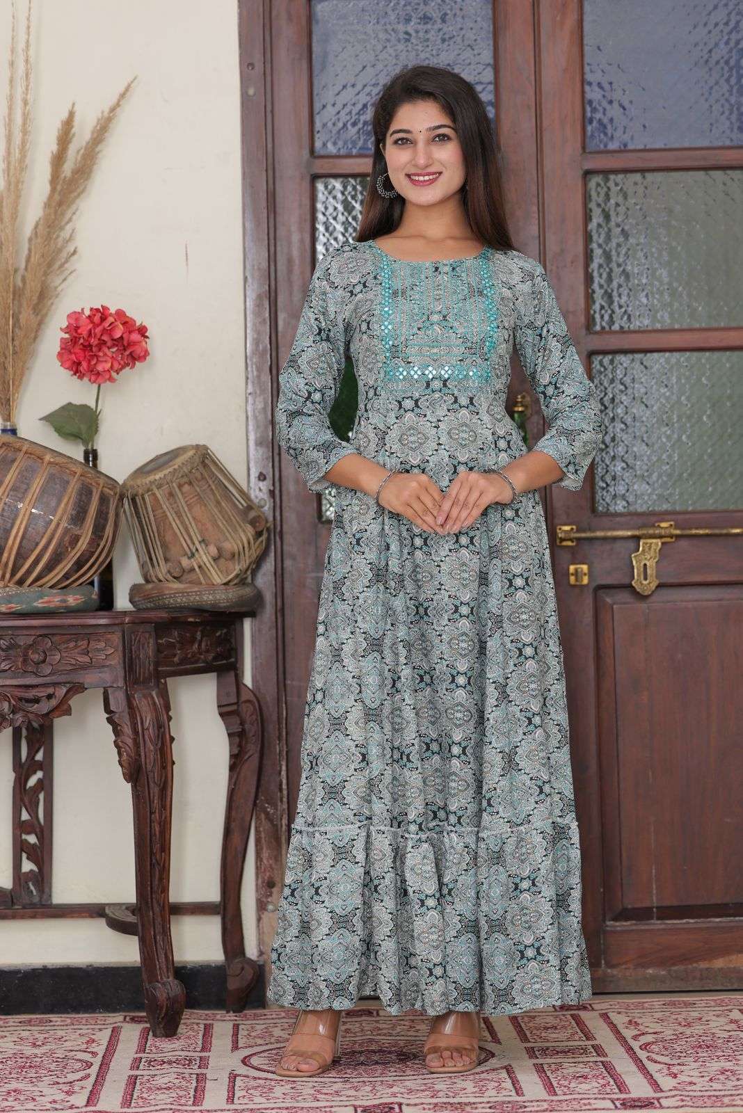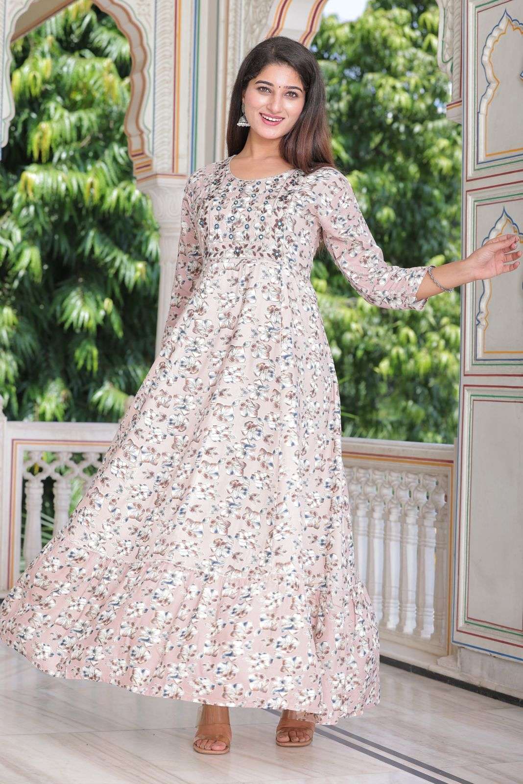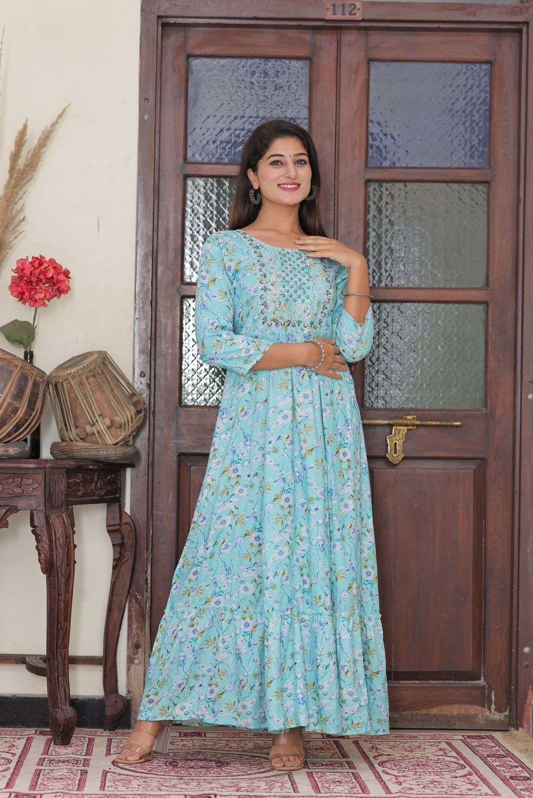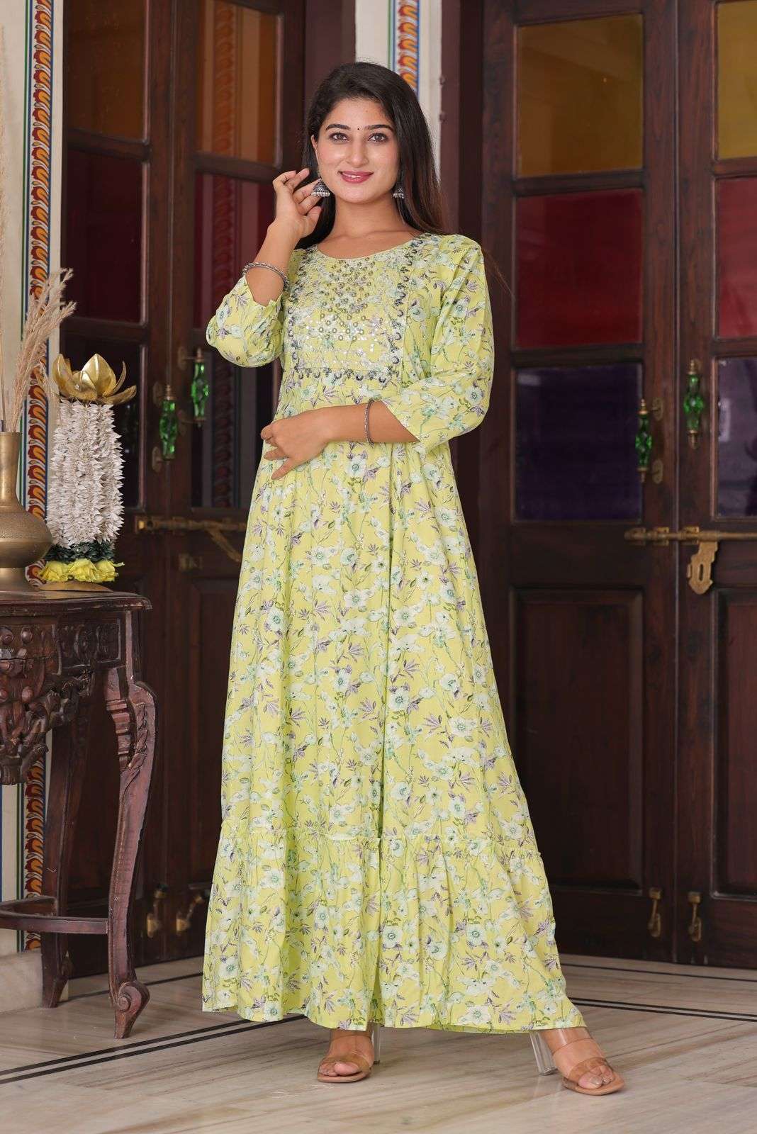 BOOK CATALOGUE PR RAYON LONG GOWN ON KRISHNA CREATION. CALL ON +91-8866778727.