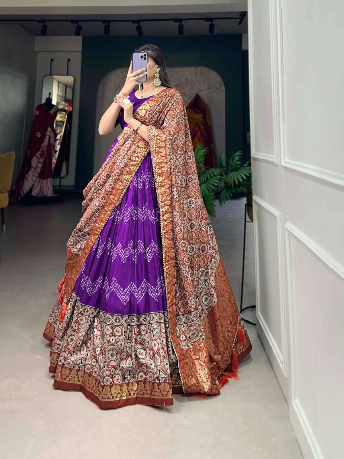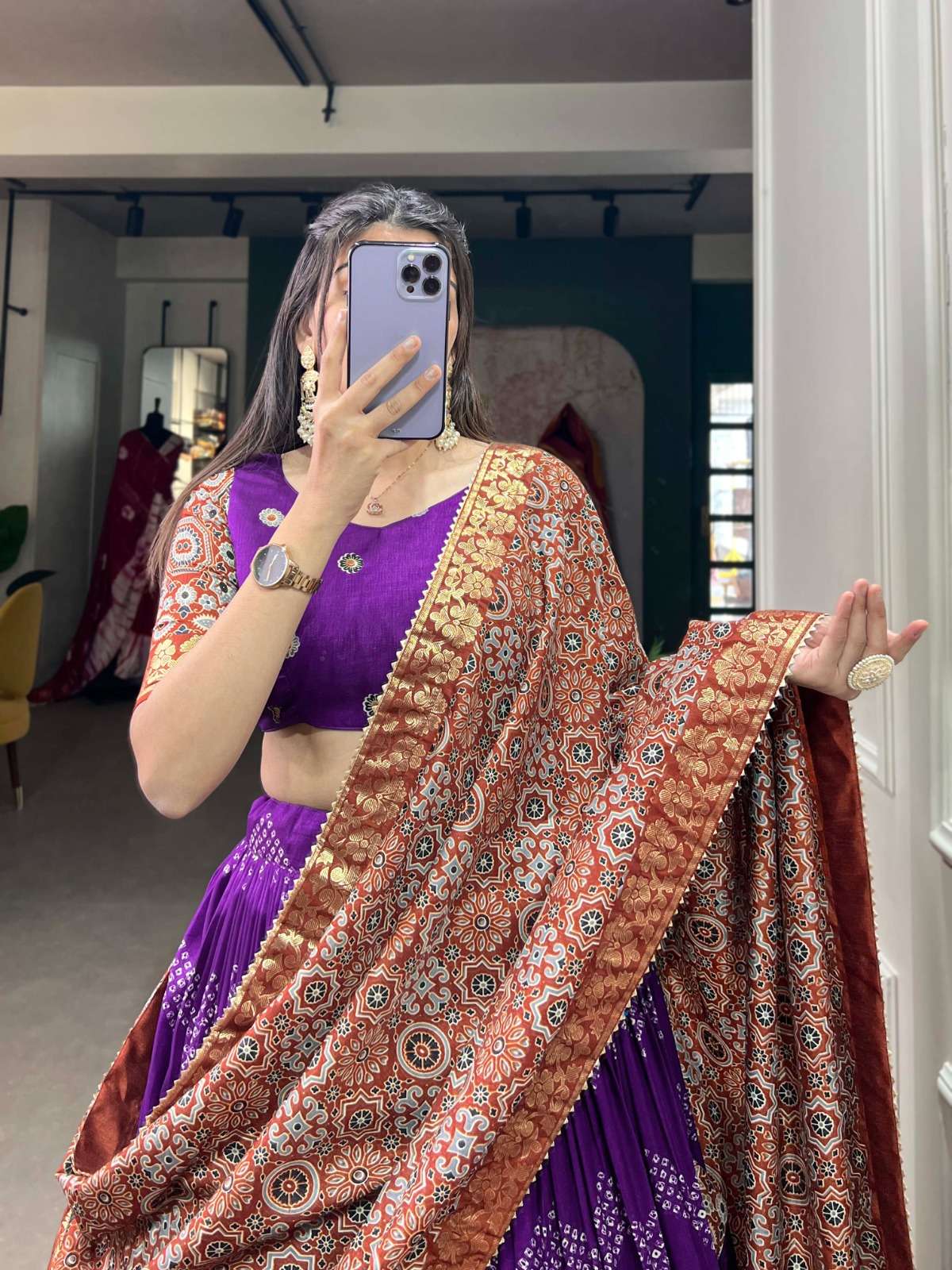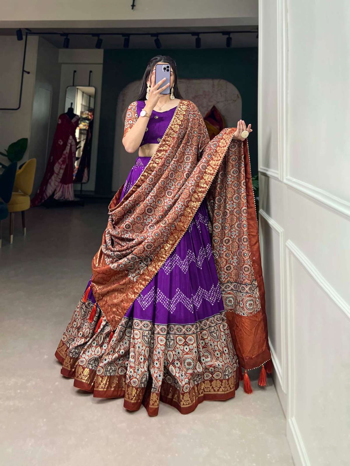 pr renuka tussar silk fashionable ajarakh print stitch lehenga unstitch blouse dupatta