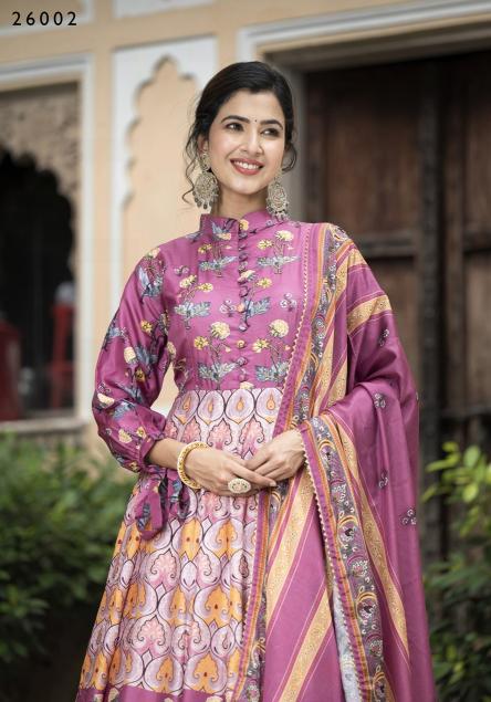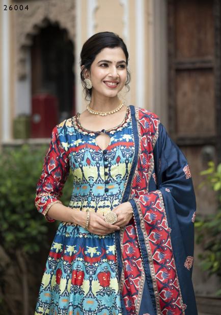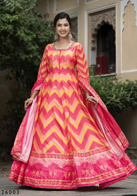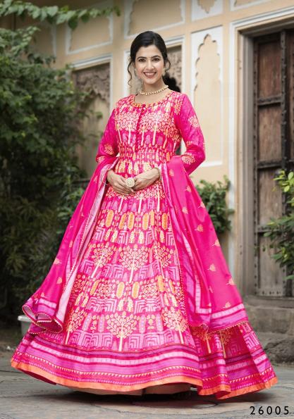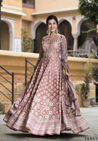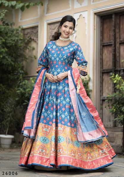 pr samanta digital printed soft dola silk readymade gown with dupatta