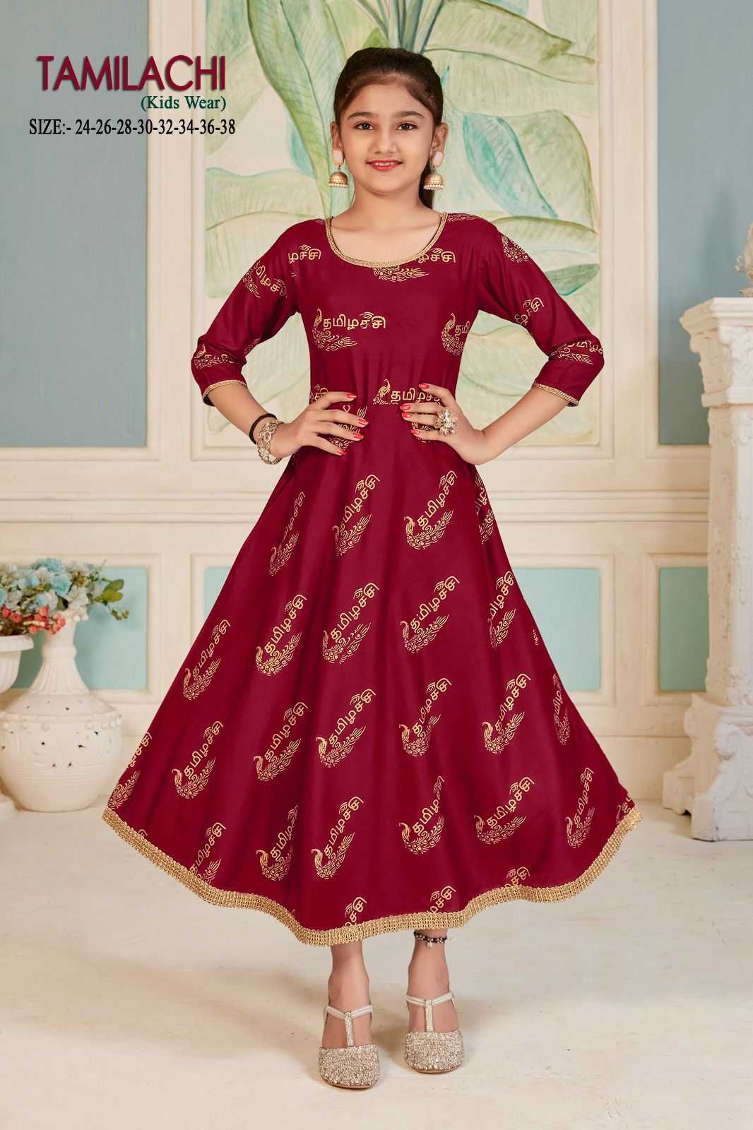 pr tamilachi readymade rayon gold print kids wear girl frock combo set