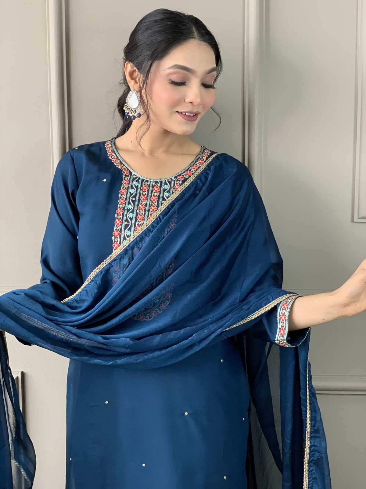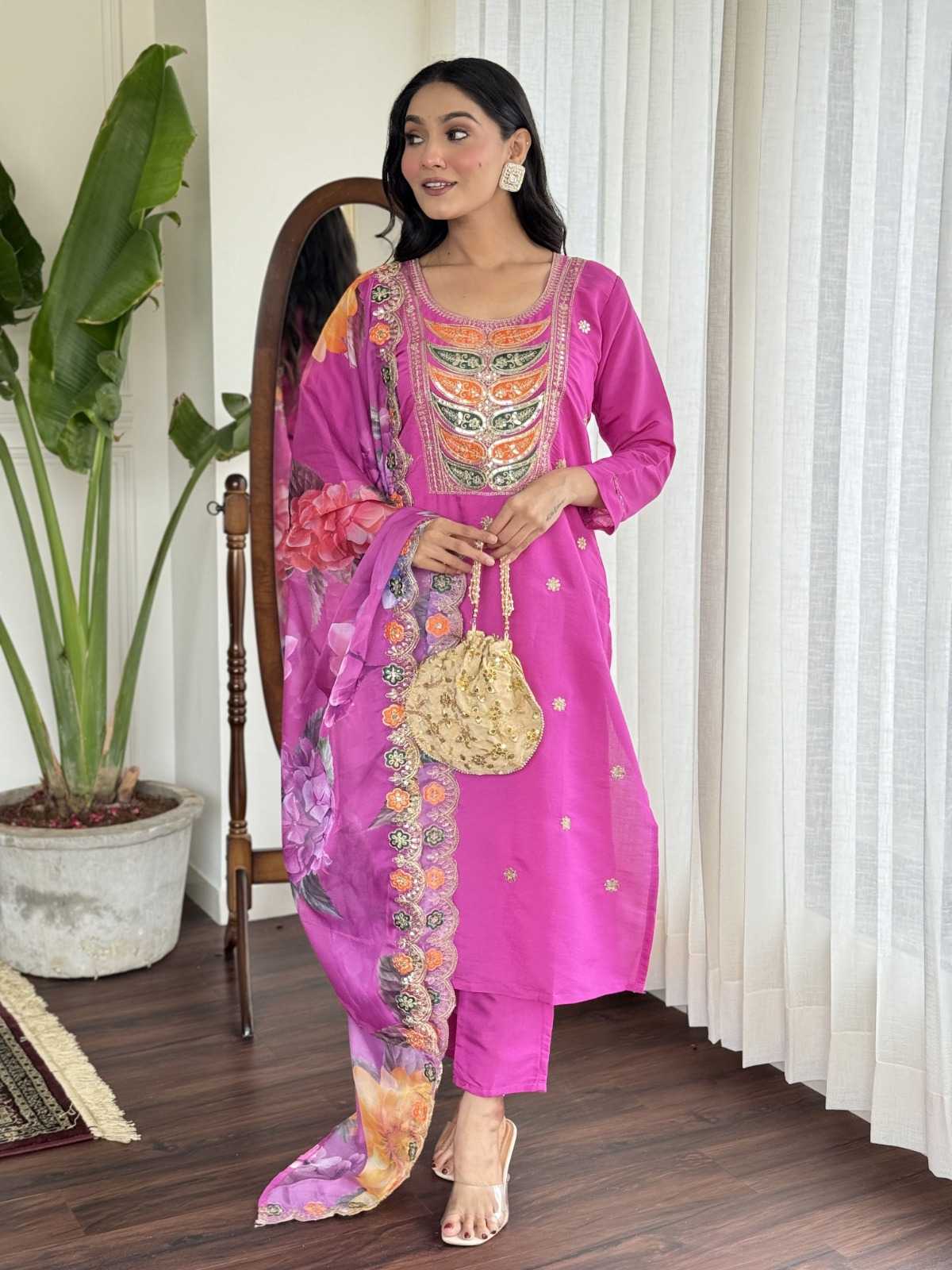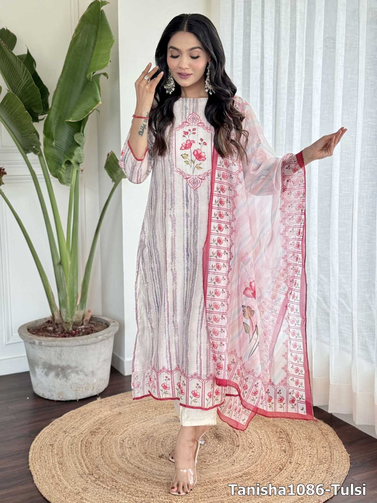 Traditional elegance Festive Kurta Set . Catalog Name: - Tanisha vol 13. Top Fabric : Viscose Chanderi Silk. Work: - Digital Print With Embroidery with Jequard and digital printed Dupatta. Size:-S(36), M(38), L(40), XL(42), XXL(44). Weight: -750 gms. GST: - 5%. Rate:- Average Rate : 905/- |