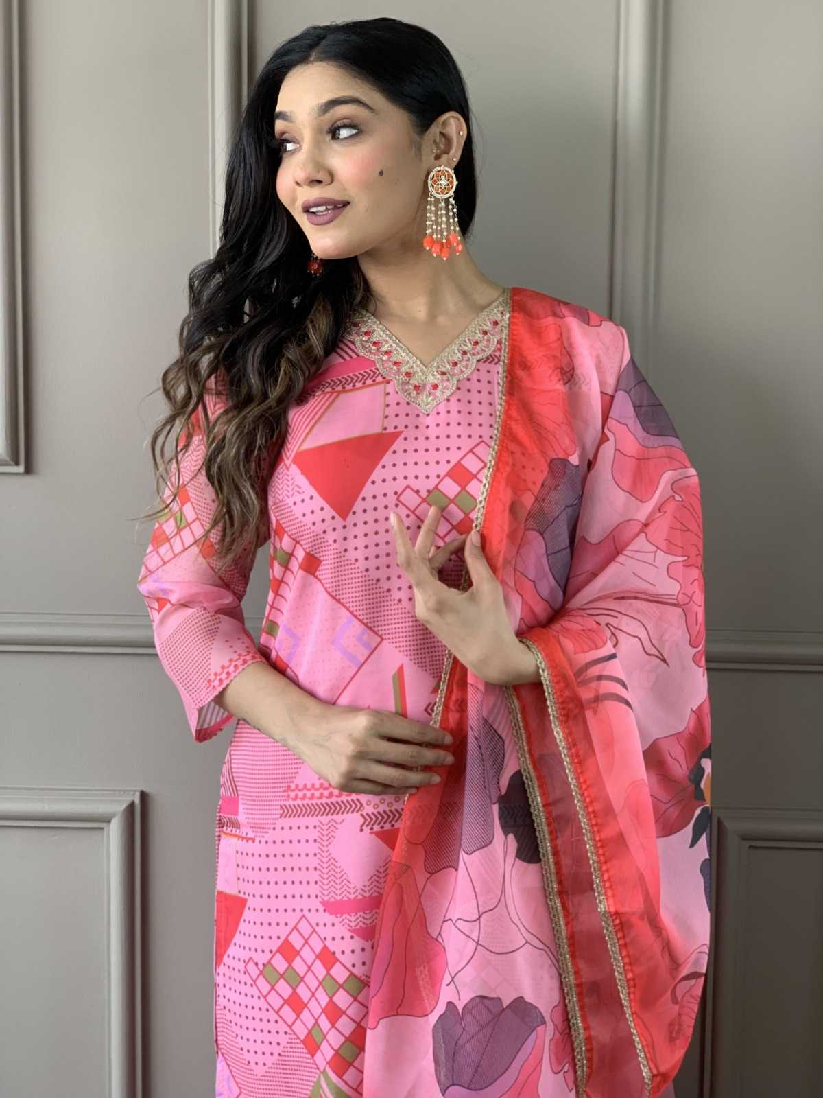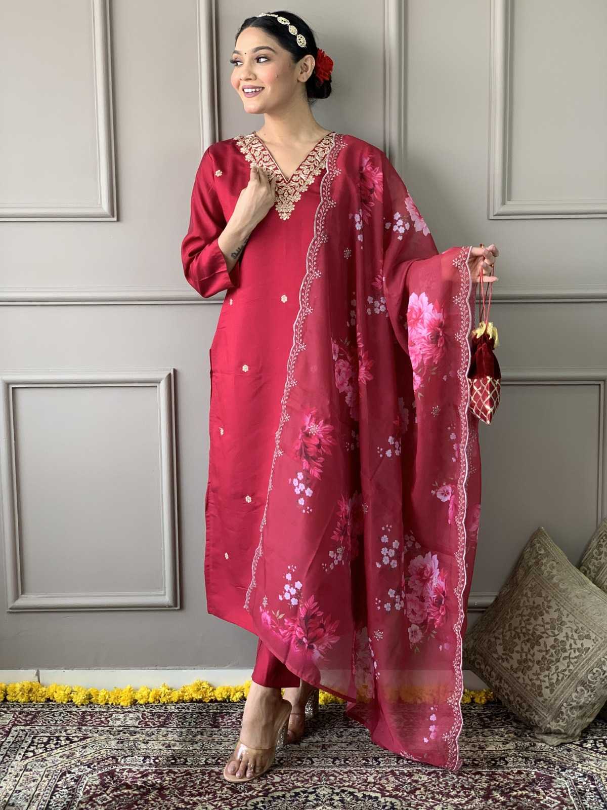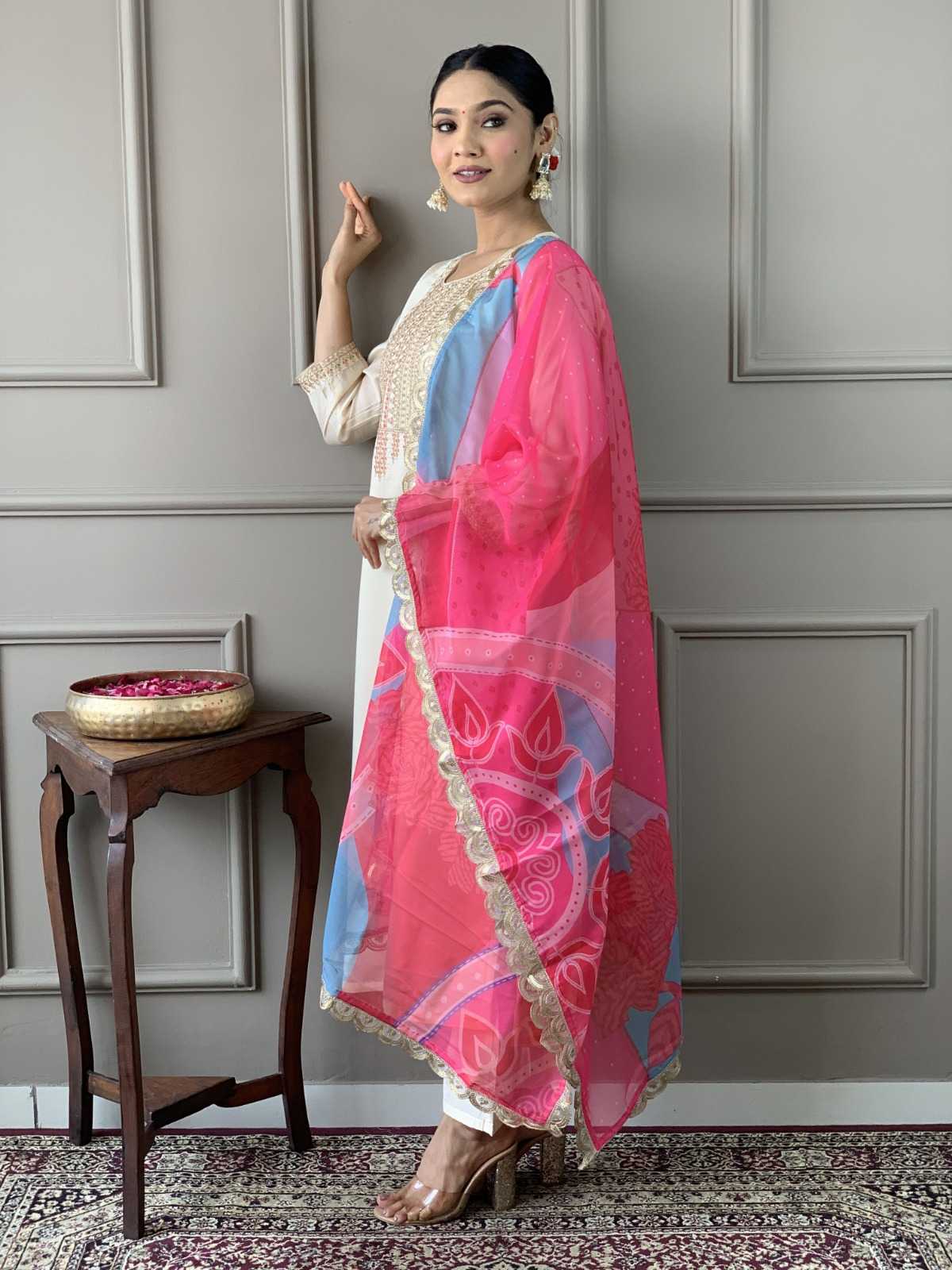 Traditional elegance Festive Kurta Set . Catalog Name: - Tanisha vol 13. Top Fabric : Viscose Chanderi Silk. Work: - Digital Print With Embroidery with Jequard and digital printed Dupatta. Size:-S(36), M(38), L(40), XL(42), XXL(44). Weight: -750 gms. GST: - 5%. Rate:- Average Rate : 905/- |