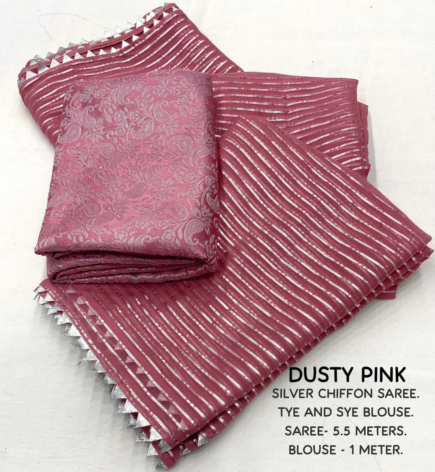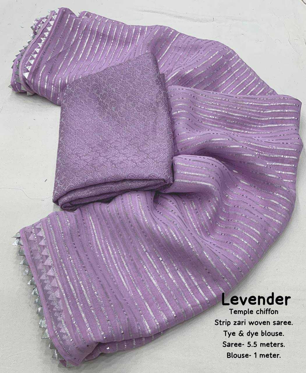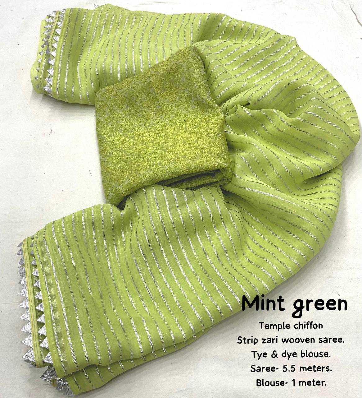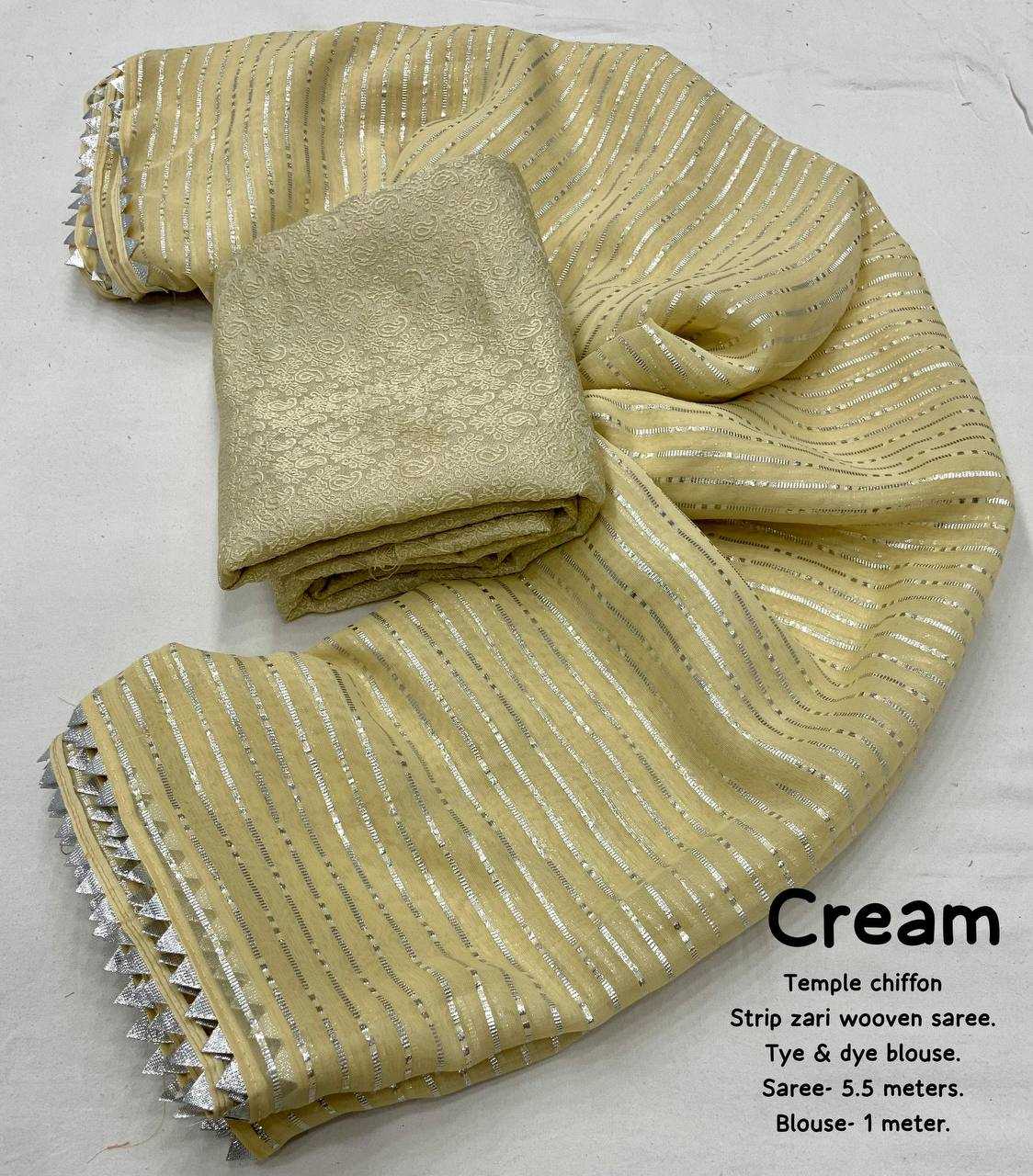 BEST SELLER TEMPLE CHIFFON (VOL-3) Quality- soft chiffon saree with silver zari weaving line in allover saree Gota patcted temple border Blouse - ton to ton tye and dye banarsi silk blouse Length- Rate - 599+ship Top trusted quality |