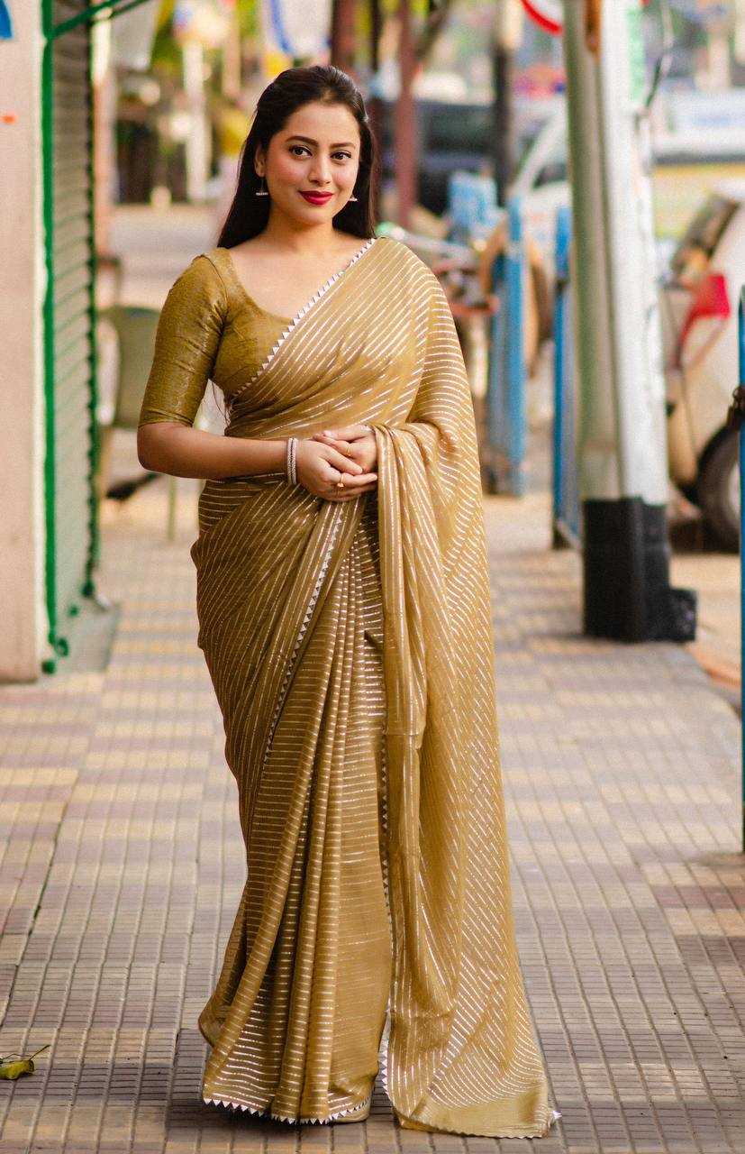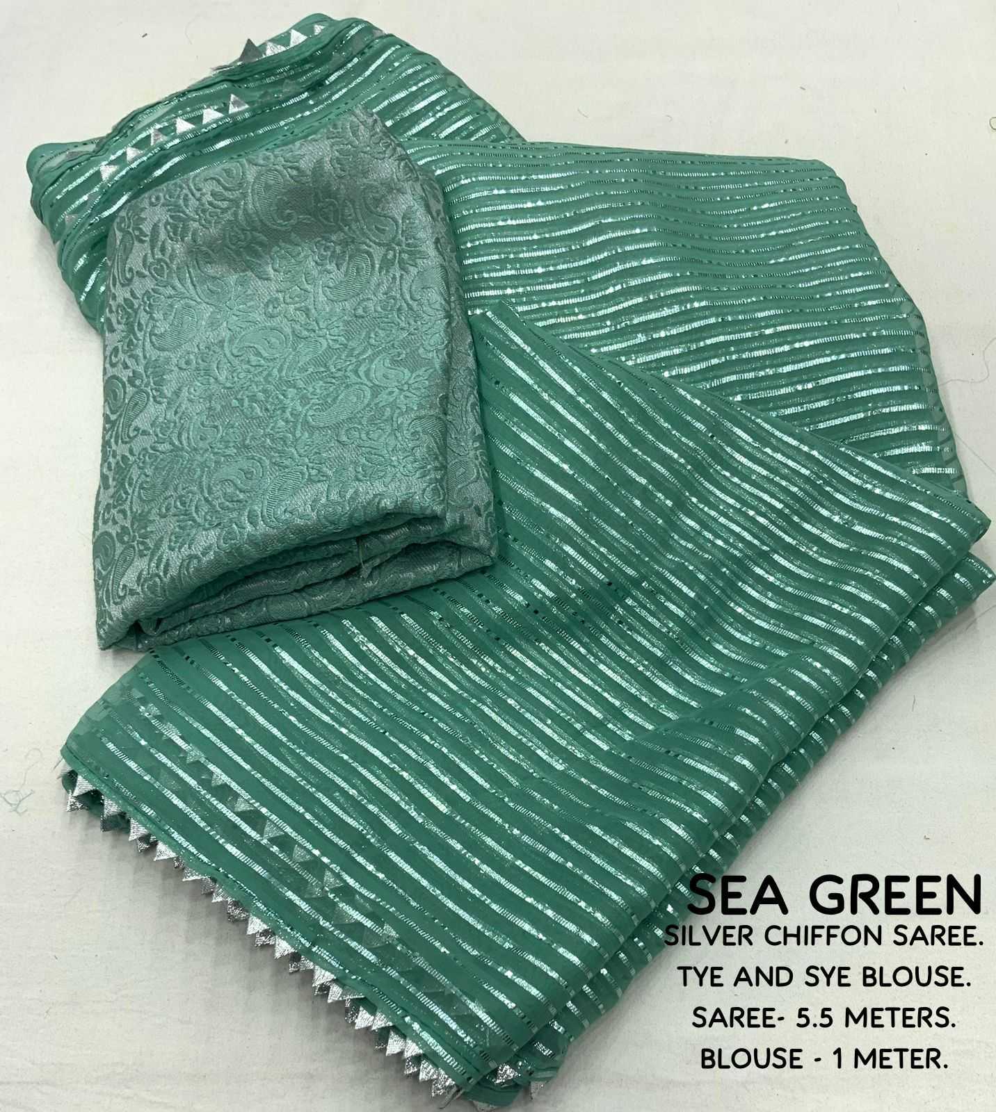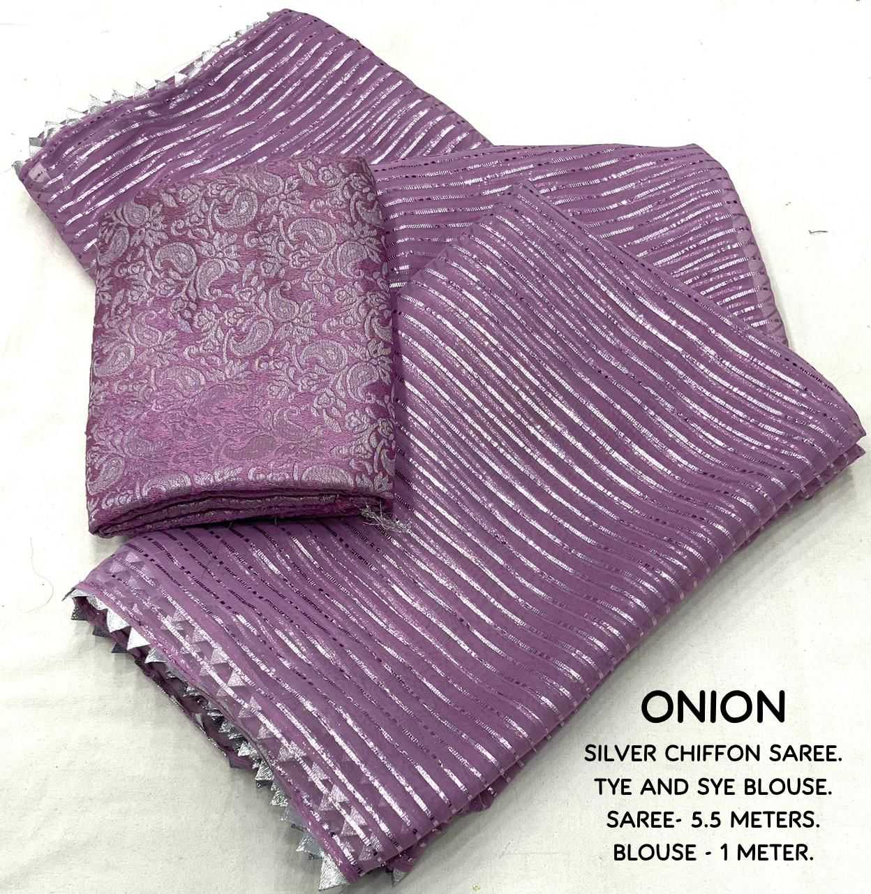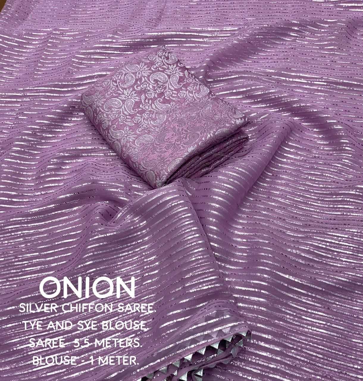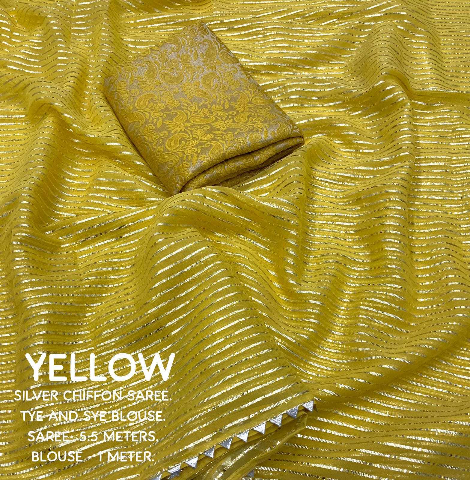 BEST SELLER TEMPLE CHIFFON (VOL-3) Quality- soft chiffon saree with silver zari weaving line in allover saree Gota patcted temple border Blouse - ton to ton tye and dye banarsi silk blouse Length- Rate - 599+ship Top trusted quality |
