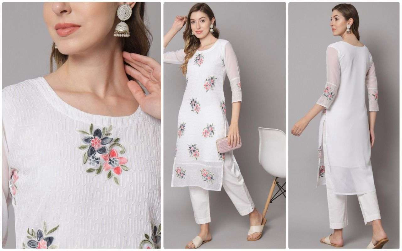 pr white flower chikankari work kurtis