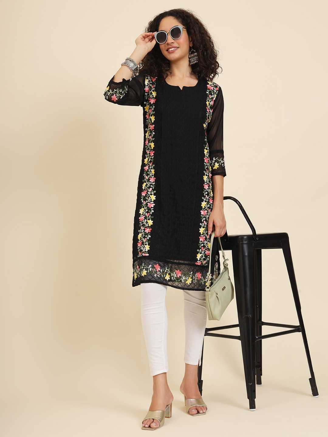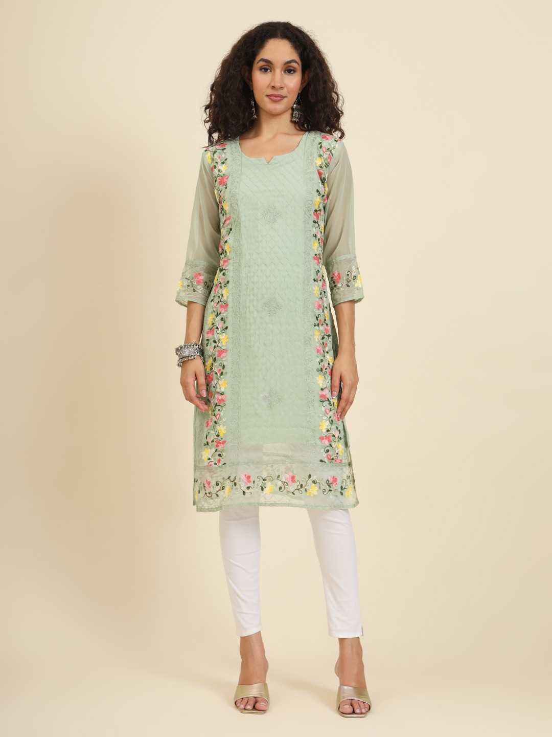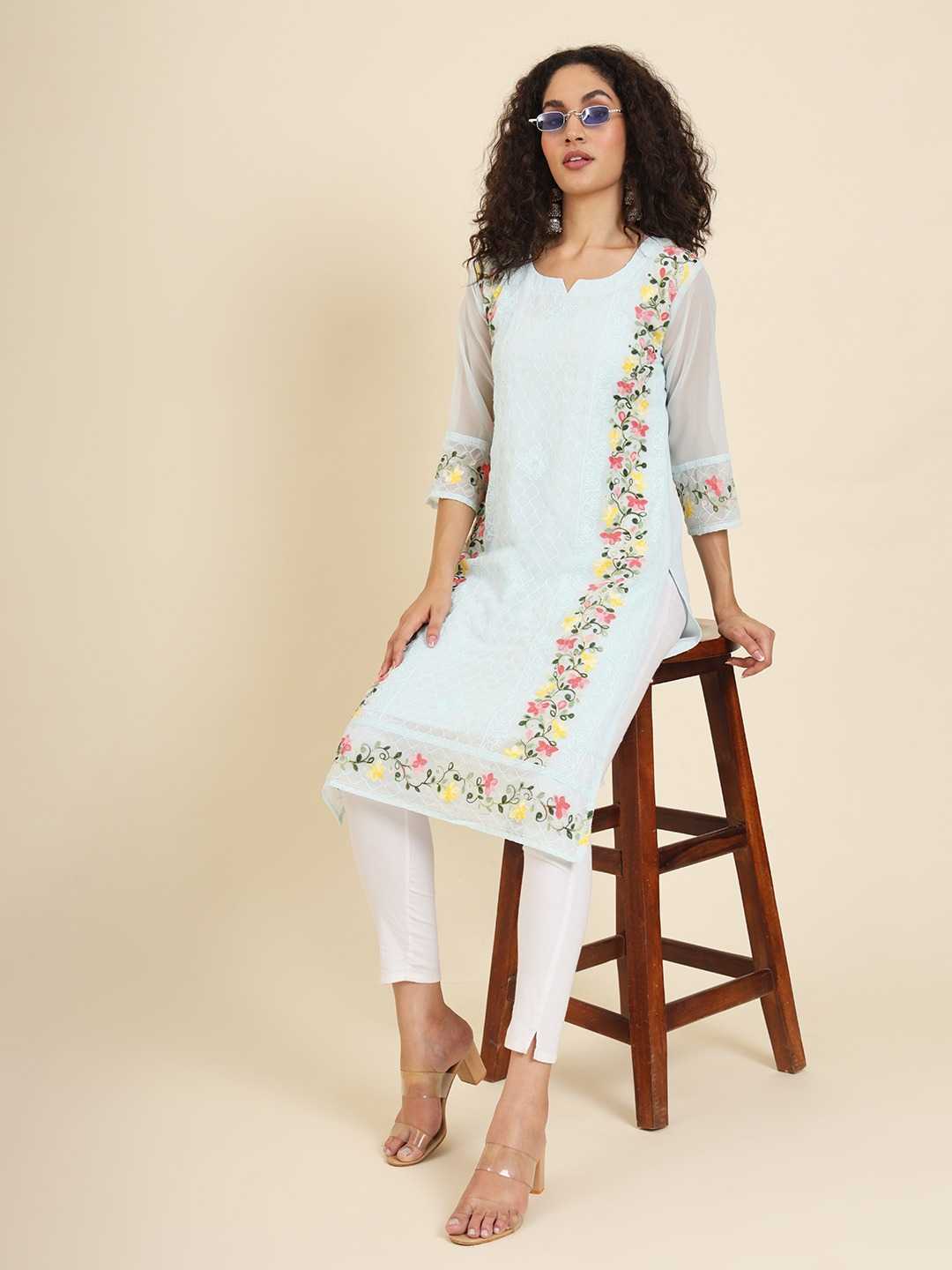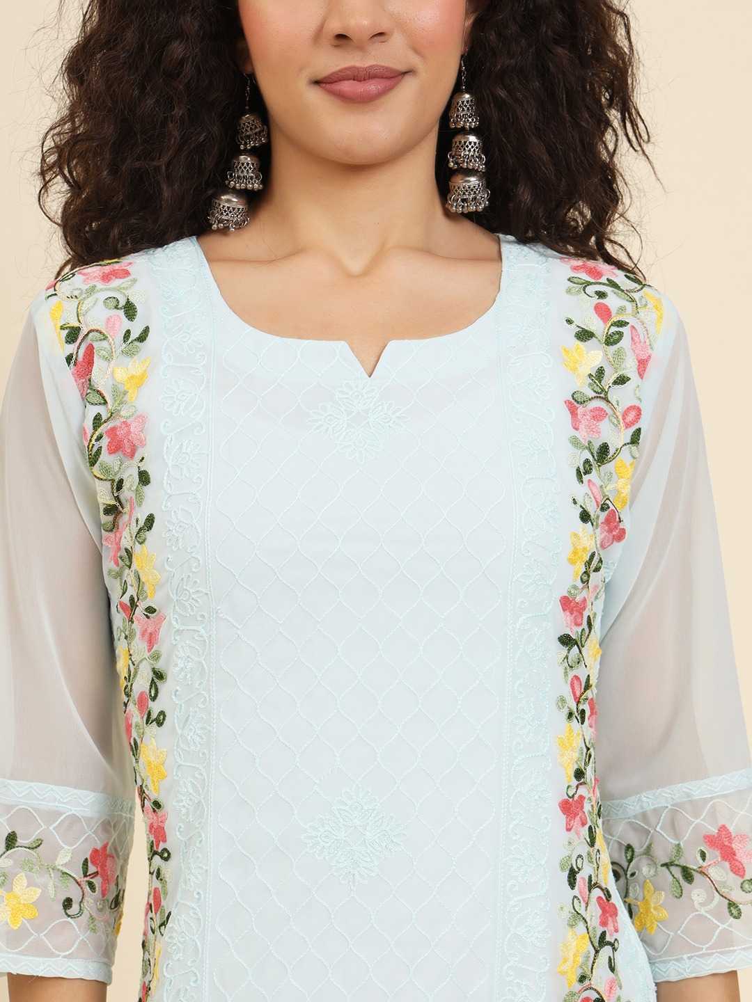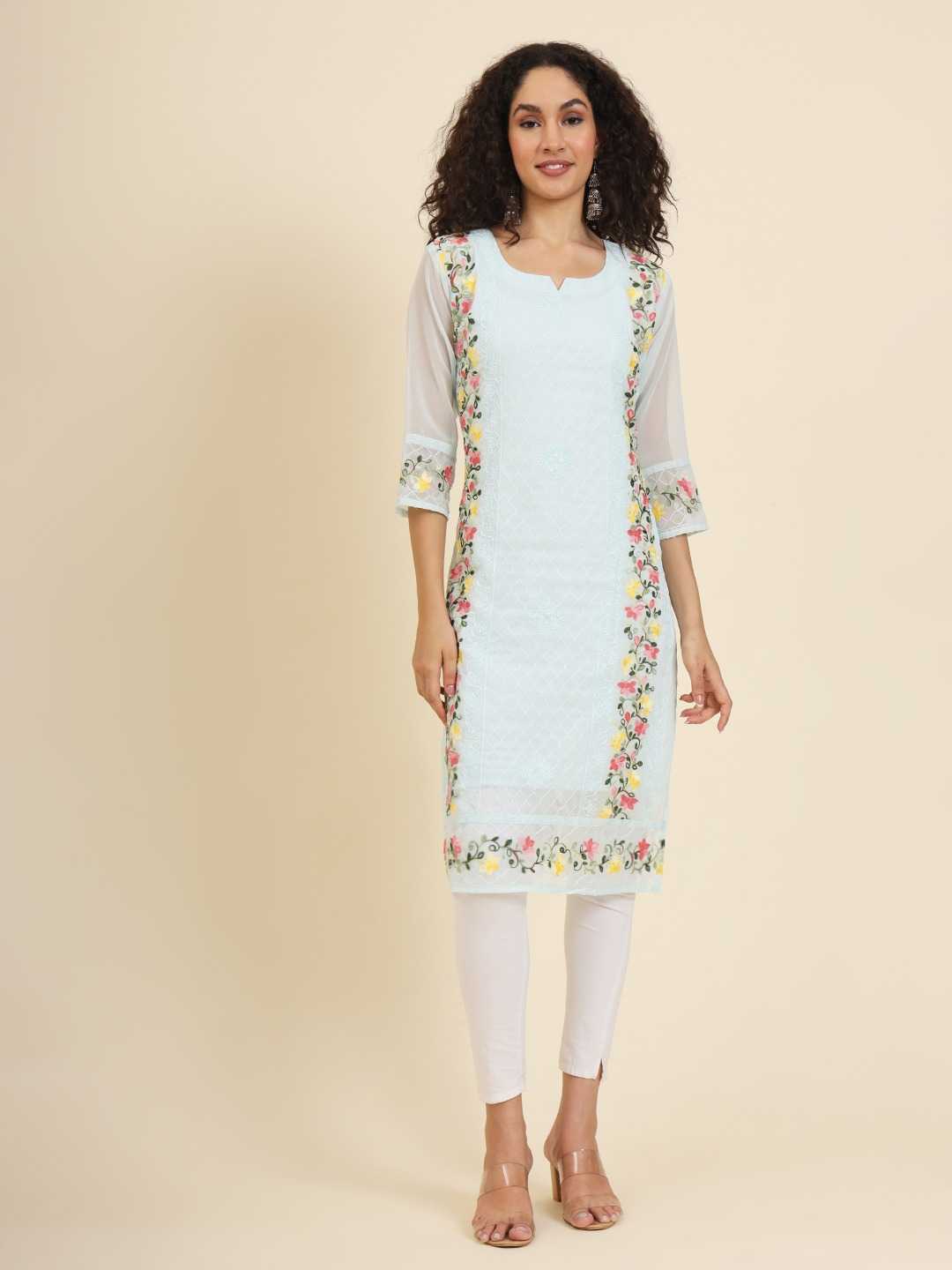 pr white flower vol 6 georgette lucknowi chickenkari full stitch kurti