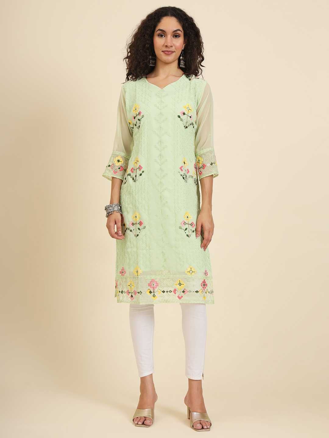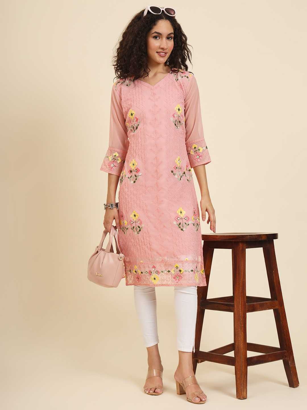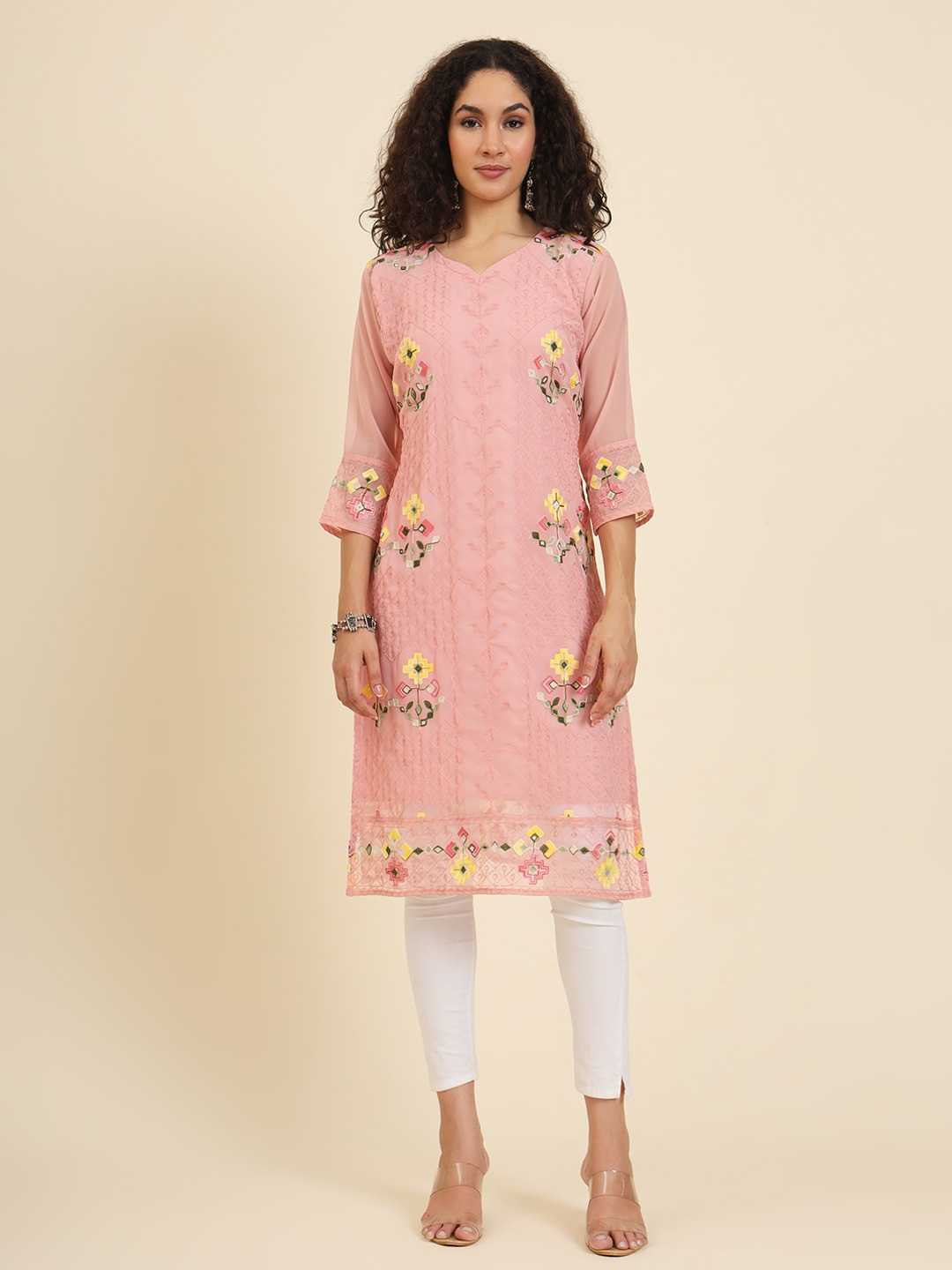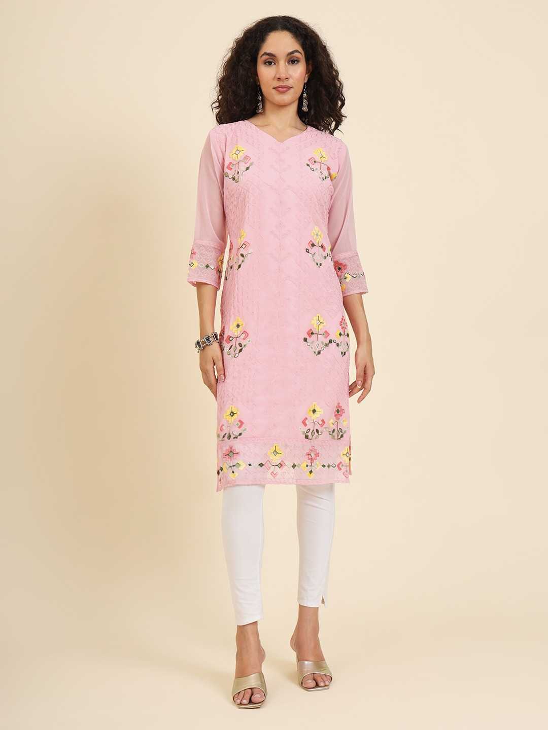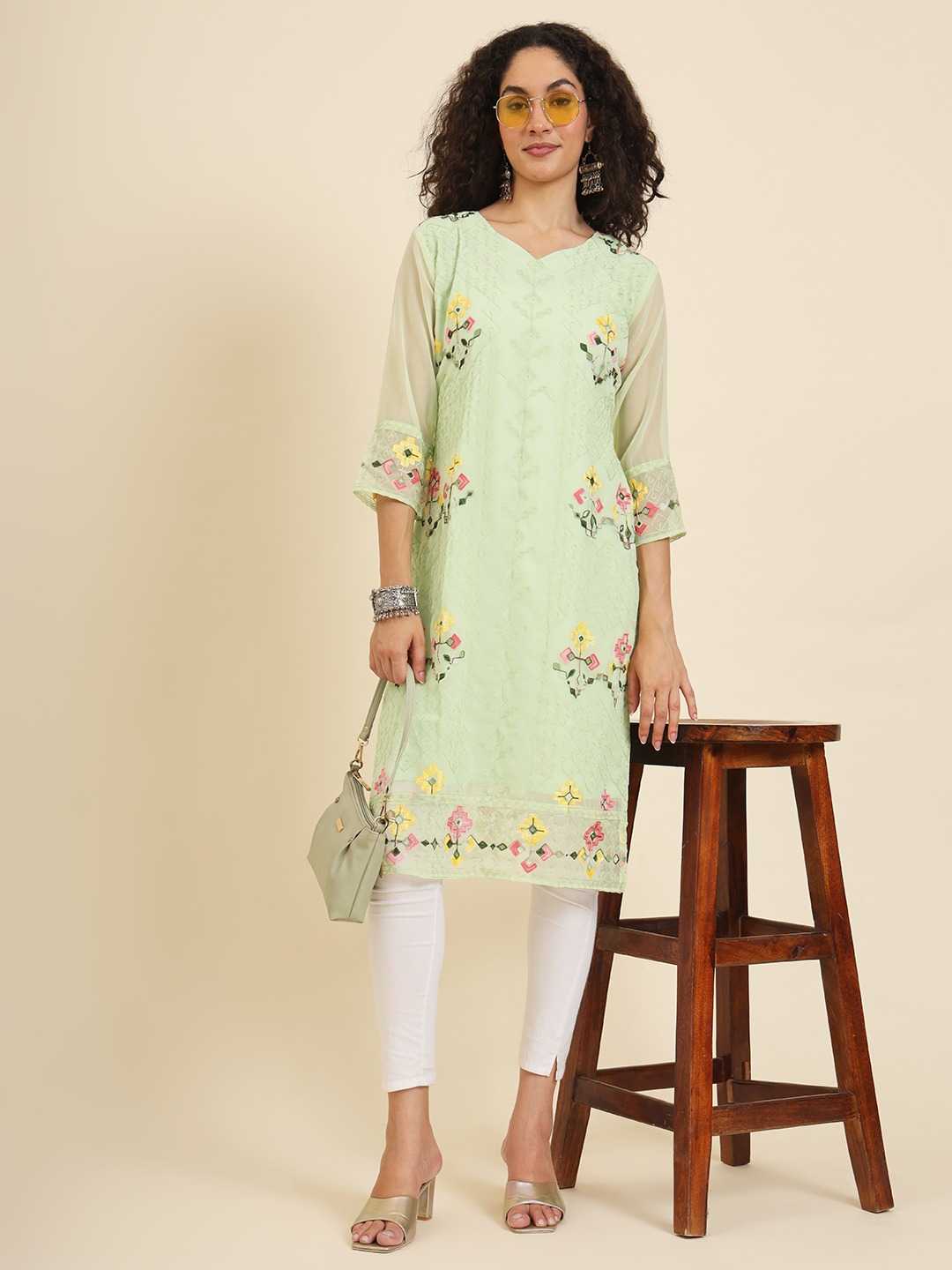 pr white flower vol 8 fancy georgette chikankari long kurti supplier