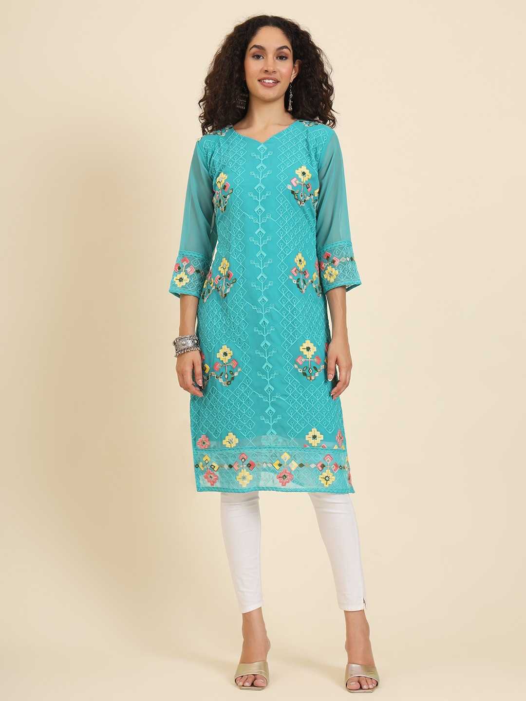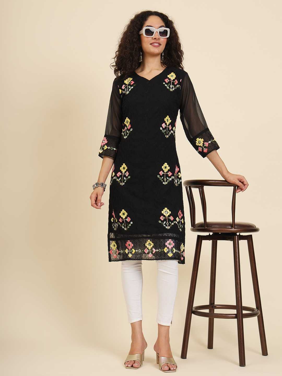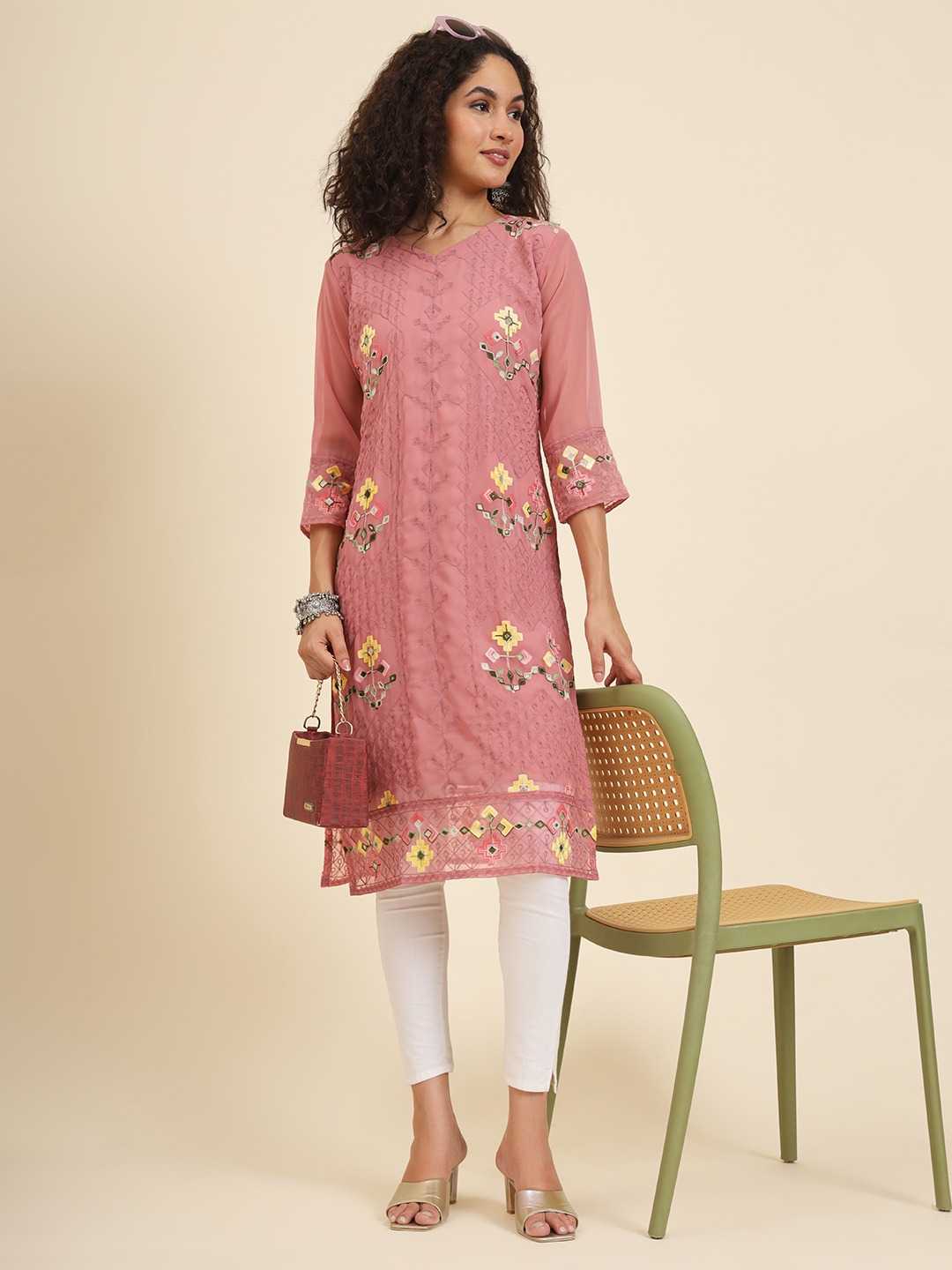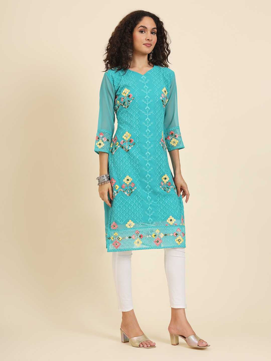 pr white flower vol 8 fancy georgette chikankari long kurti supplier
