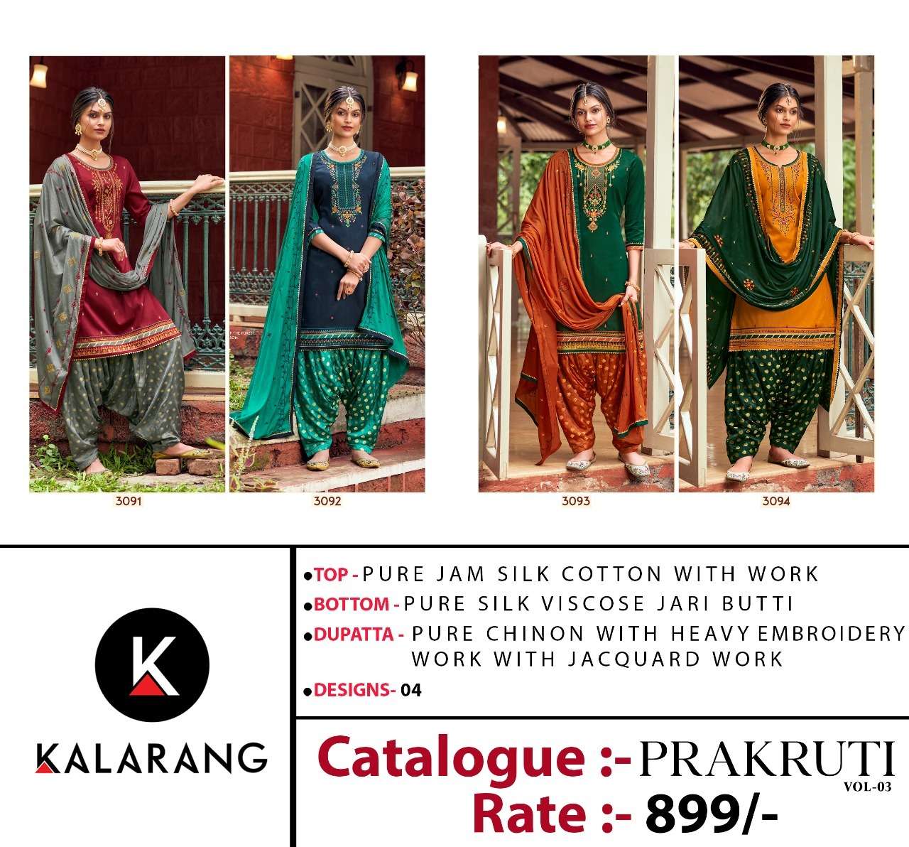 * KALARANG  has launched  Catalog name :  * PRAKRUTI VOL-3 * Fabric Details Top:- Pure Jam Silk Cotton With Work Bottom:- Pure Silk Viscose Jari Butti Dupatta:- Pure Chinon With Heavy Embroidery Work With Jacquard Work           Total Design:- 4  Rate: 899 |