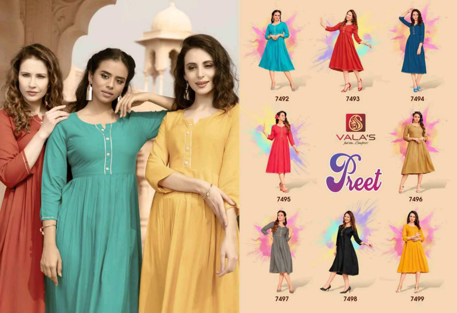 We are launching our new Kurtis Catalog Brand - VALAS . Catalog Name : PREET Fabrics - Rayon Plain Flare Kurta Leanth :- 44 Sizes - M, L, XL, XXL, 3XL * Set to set * Rate 505/- only Pc - 08 GST 5 Percent Extra. Delivery 3-4 days Book your order now . |