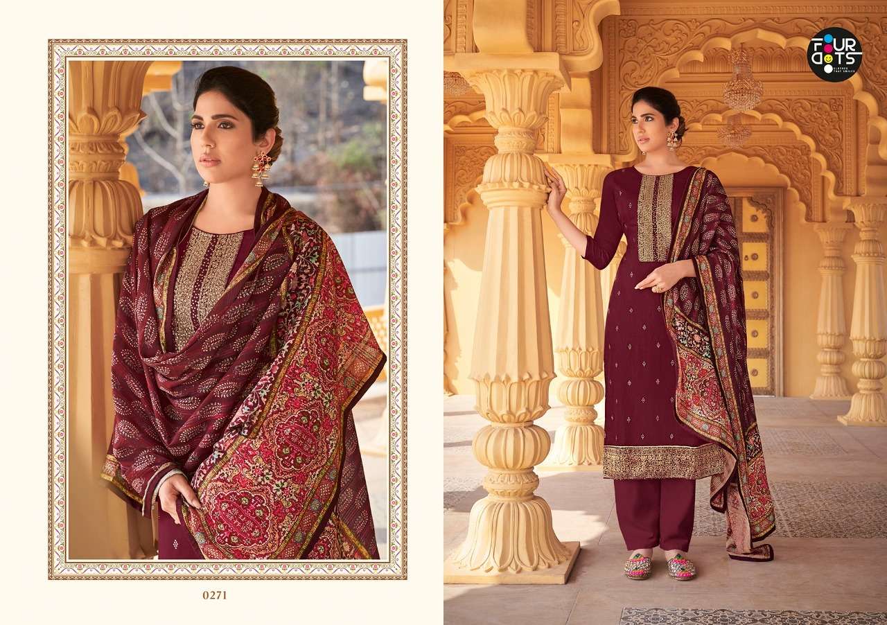 * FOURDOTS  has launched  Catalog name :  * PREYASI * Fabric Details Top:- Pure Muslin With Pure Jacquard Sequence Neck And Mukesh Work Bottom:- Dull Shantoon (Cut=4.25) Dupatta:- Pure Muslin Cross Head And 2MM Sequence Work With Digital Print           Total Design:- 4  Rate:- 1099 + GST |