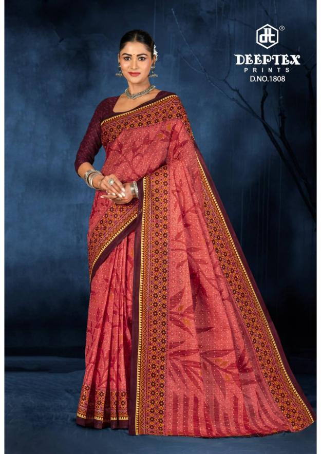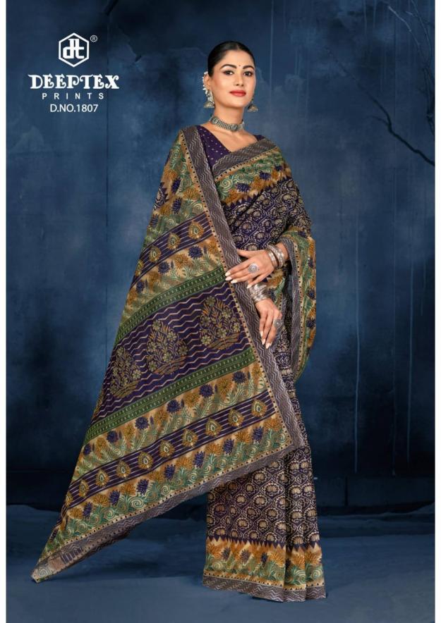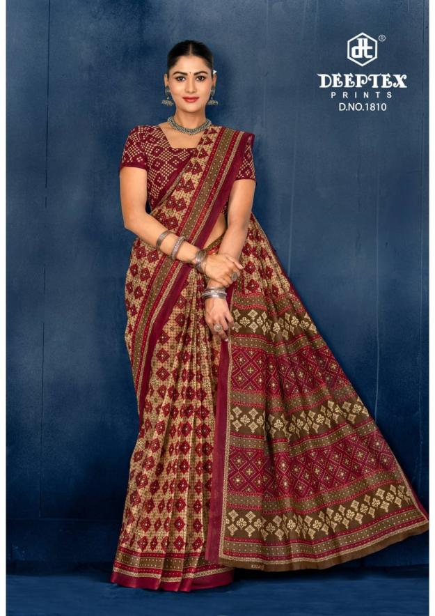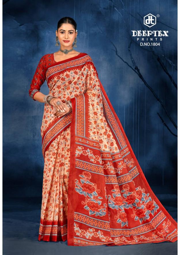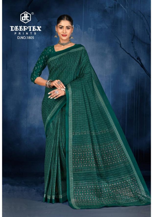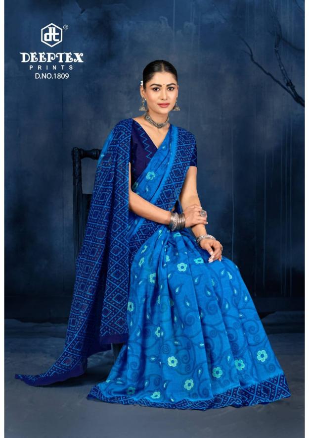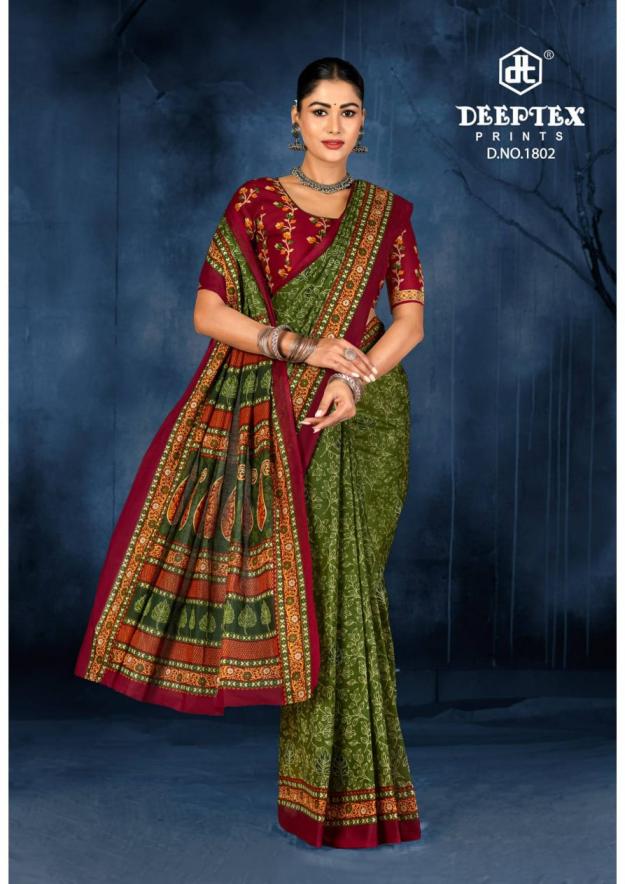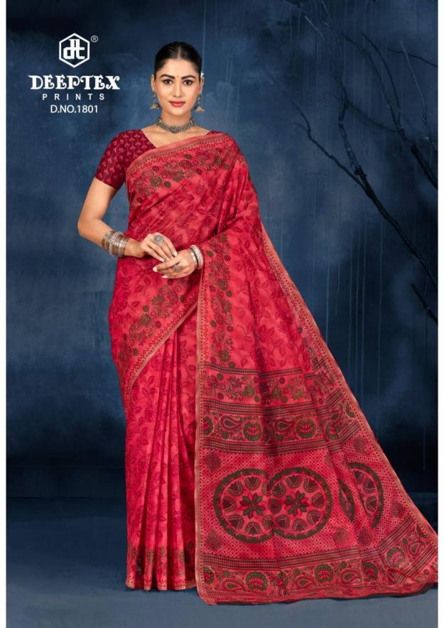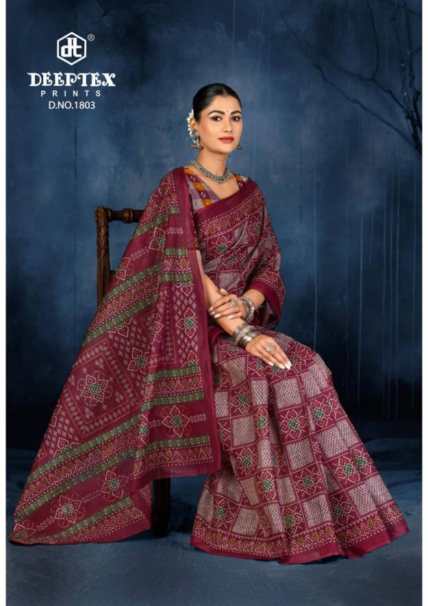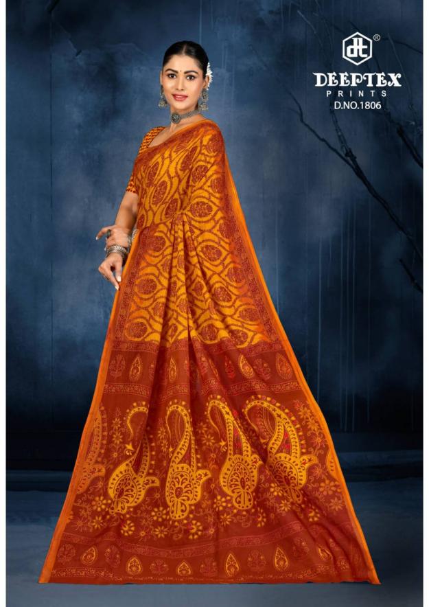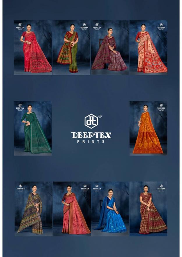 Deeptex Prints Prime Time Vol. 18 ============== Pure cotton sarees Saree With Blouse =============== Cut : 5.50 mts + 1 mts Blouse approx ================== Rate - 310/- +GST |