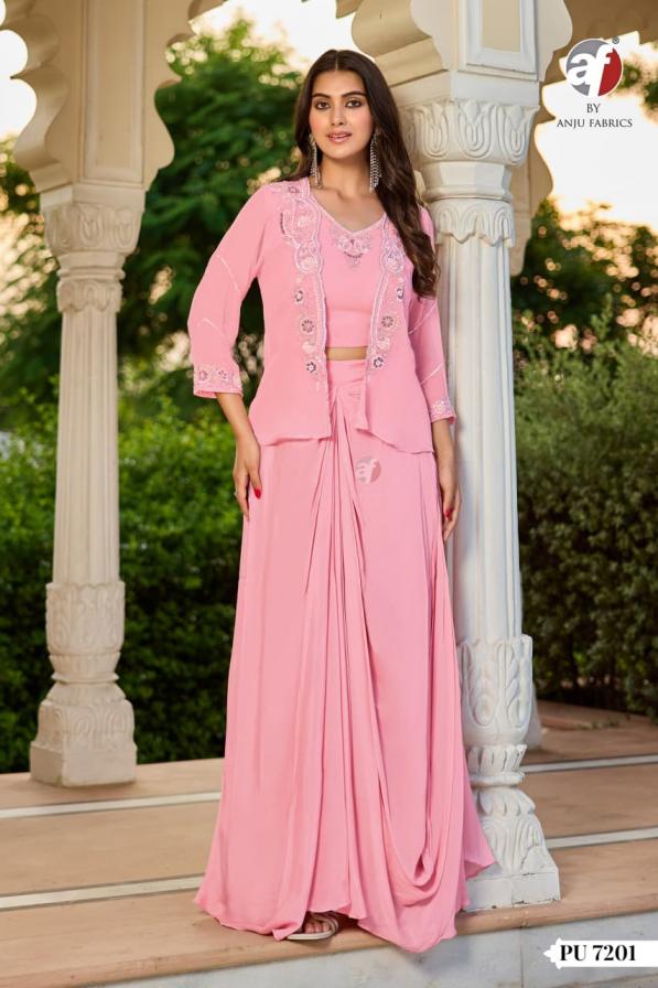 pu 7201 by anju fab chinon chiffon fully stitch combo crop top drape skirt with jacket