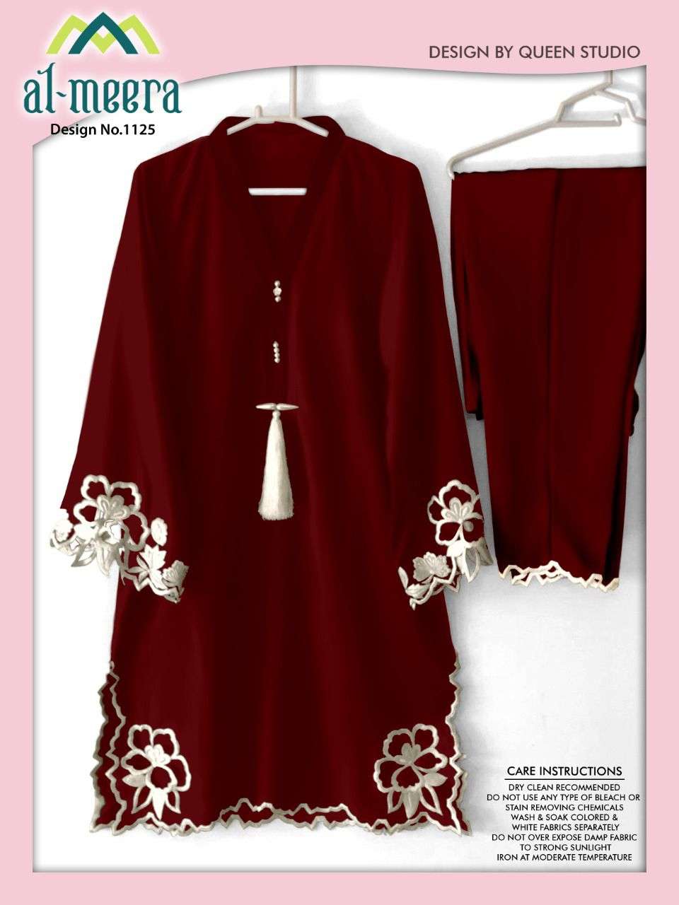AL-MEERA Â Â Â Â Â Â Â Â ( D.NO-1125 ) We are Introducing our LUXURY PRET COLLECTION To Make You Unique and Classy.. Â Â Â Â Â Â DESIGN BY QUEEN STUDIOÂ Description Sophisticated, Modern and versatile. This beautiful cut-worked dress is best option for your hangouts and get together! Details Top :- Â Reyon (14-Kgs) Bottom :- Reyon (14-Kgs) Colour :-Marun, brown, dusty green, wine, peacock blue, dusty pink. Â Â Â Â Â Â Â Size Chart Top xl size chest (42)Â Bottom xl size (36-42)Â Rate:- 999+$Â Colour may slightly vary due to light effect Pls Note New booking delivery after 5 to 7 days |