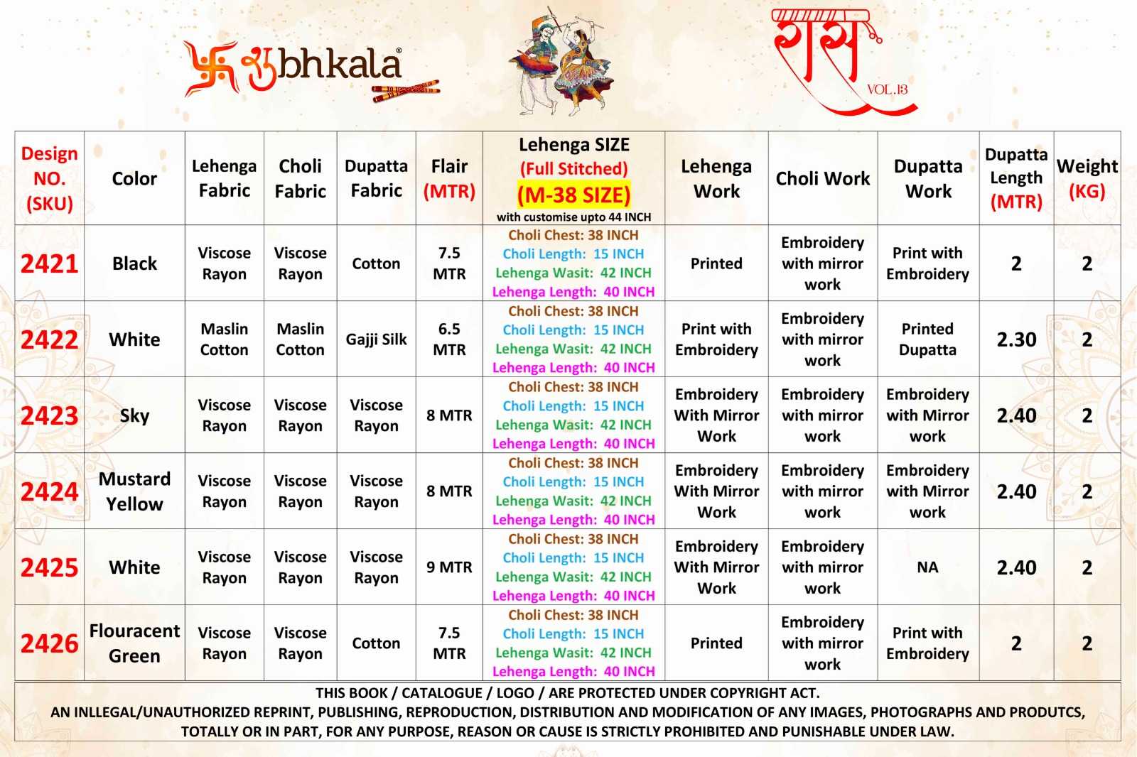 💃 SHUBHKALA - NEW NAVRATRI 2024 🕺 🤷🏻♂️ New Exclusive Festival Wear Stitched Navratri Collection Chaniya Choli Collection 🤷🏻♂️ 💰 RAAS VOL. 13 • RATE LIST 💰 2421: 3500/- Lehenga Length (Stitched): 40 INCH Length • 42 Waist. & Length: 15 INCH SIZE :- M L XL XXL AVAILABLE Real Pic Available. ✅ ⚠️ Wash & Care Instructions. ⚠️ |