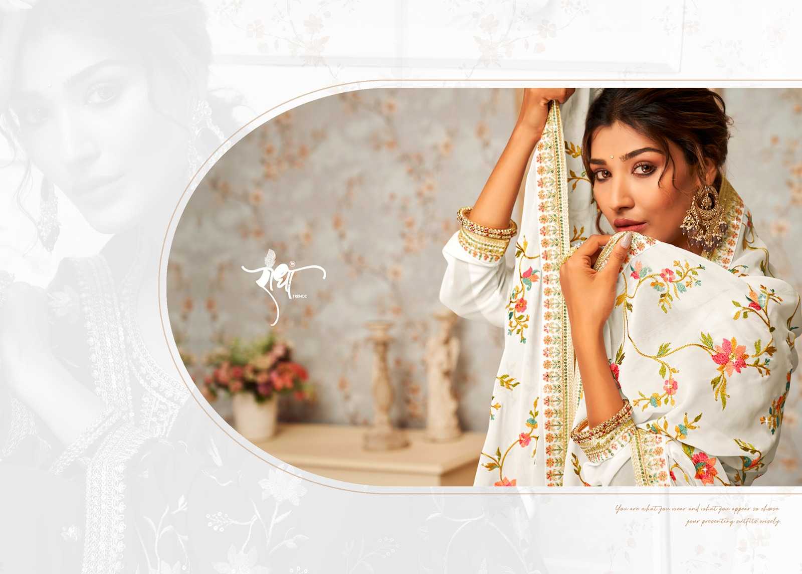 BRAND: RADHA TRENDZ CATLOG TOP: REAL GEORGETTE WITH HEAVY EMBROIDARY WORK INNER :HEAVY SANTUN BOTTOM : HEAVY SANTUN DUPATTA: HEAVY GEORGETTE WITH HEAVY EMBROIDARY WORK RATE:1895/- per pcs |