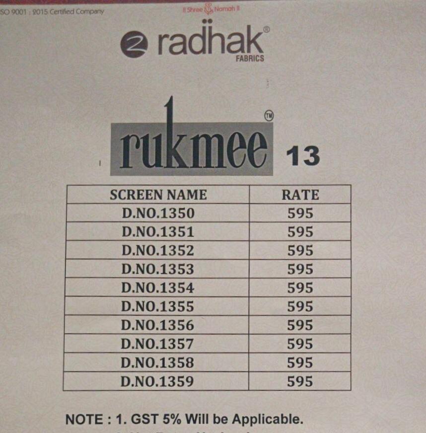 Rukmee-13 Fabrics details Rayon, Rayon dobby, Rayon slub, Viscose charcoal print, Cotton jacquard, Size - M , L , XL , XXL & 3XL . Set to set. GST 5 Percent Extra. * Delivery 7 days * |