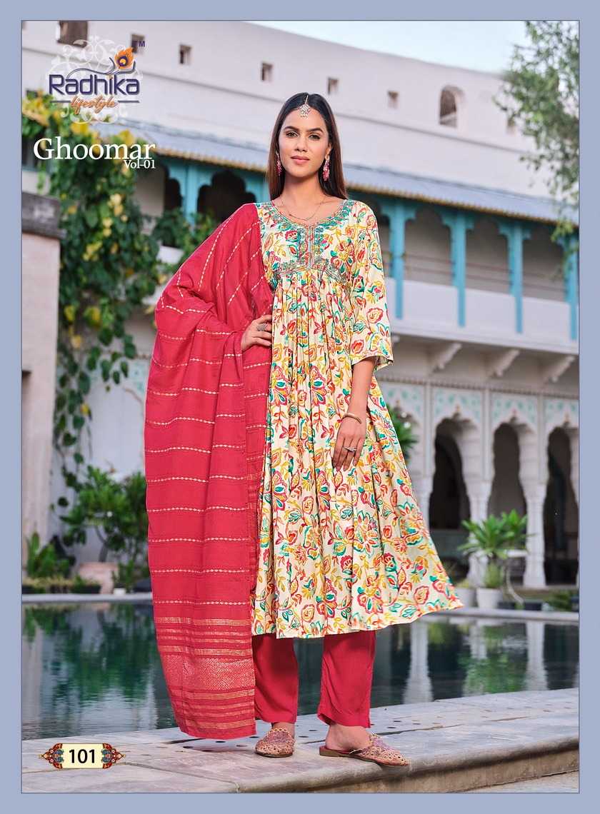 radhika lifestyle ghoomar vol 1 festive wear readymade alia style gown with pant and muslin jacquard dupatta