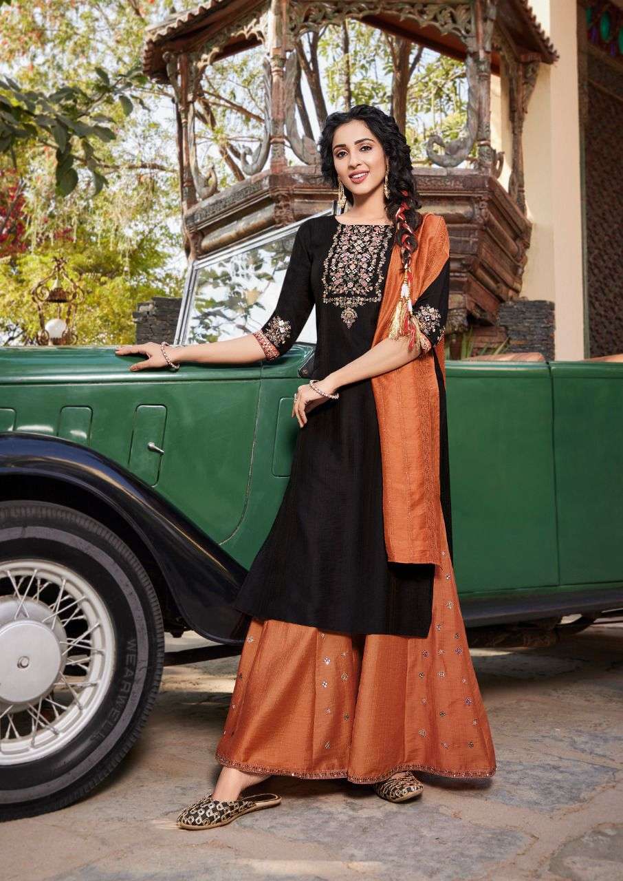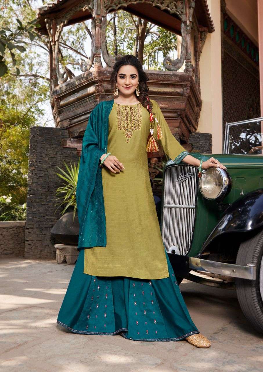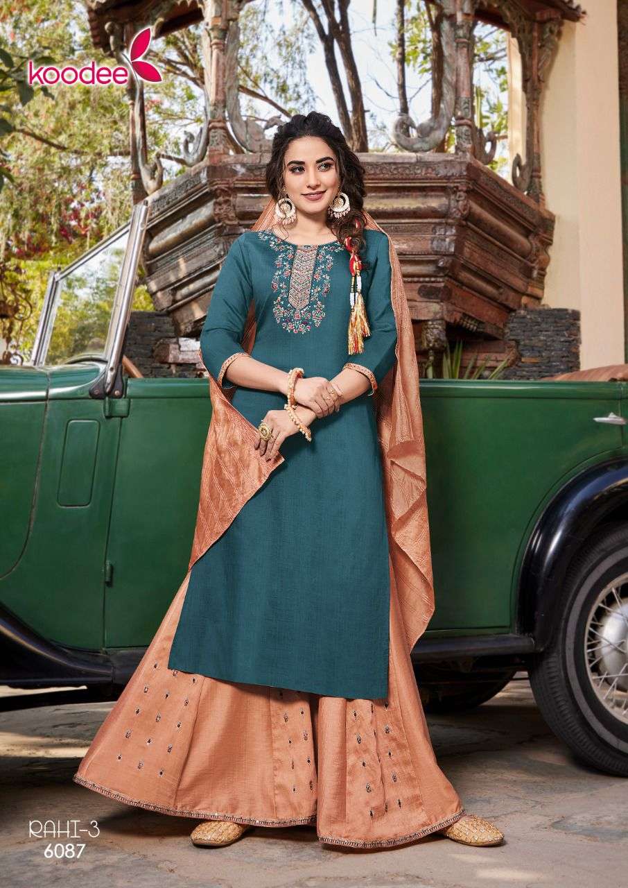 👉 Kurti With Sharara Brand Koodee Such a comfy Kurti Sharara With Dupatta Sets! Brand Name : KOODEE Catalog : Rahi-3 Designs : 6 Fabric:- Bottom :- Viscose Slub (Kali Embroidery Work) (2.50 Mtr Flair) Duppata :- Pure Nylon Viscose Work: Embroidery + Khatli Work Size : S(36),M(38), L(40), XL(42), 2XL(44), 3XL(46) Ready to Ship |