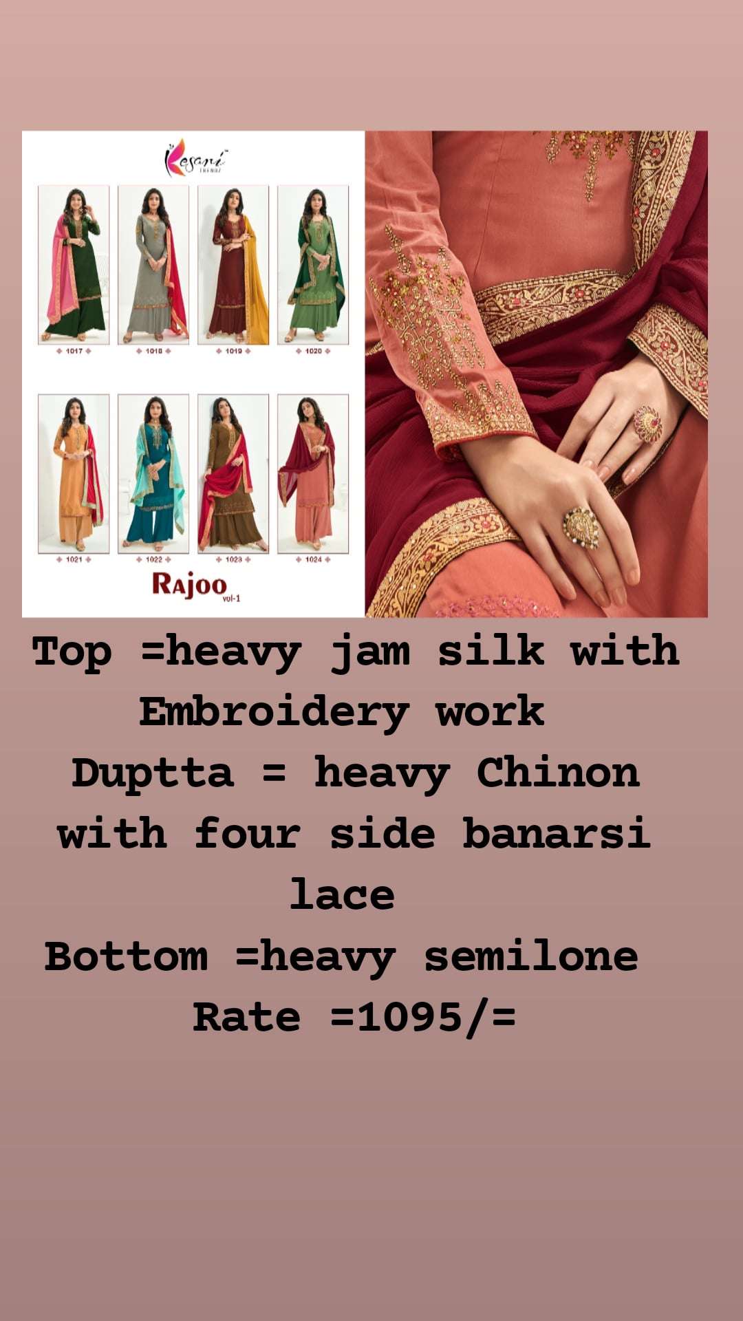 rajoo by kesari trendz jam silk embroidery party wear suits wholesaler
