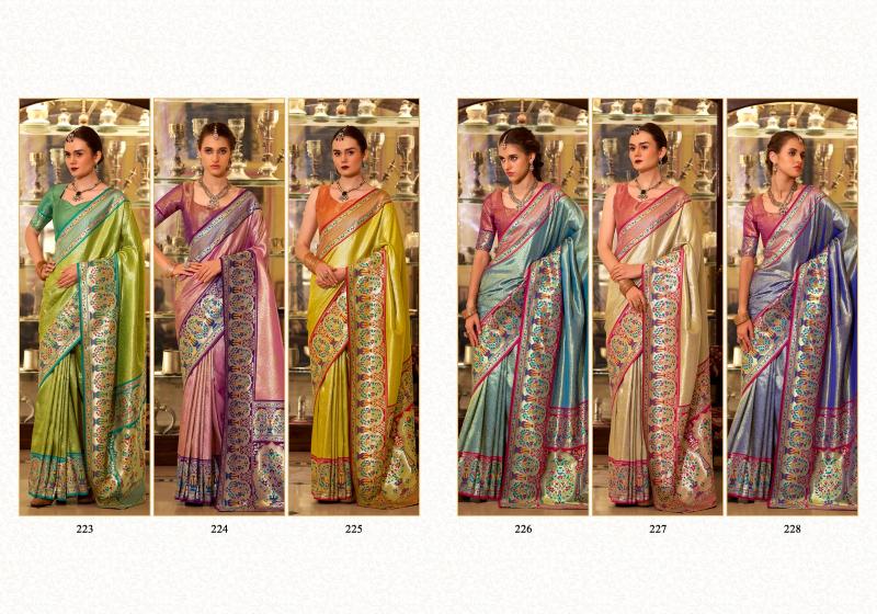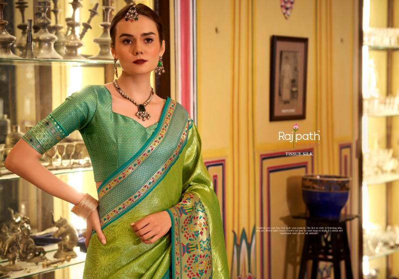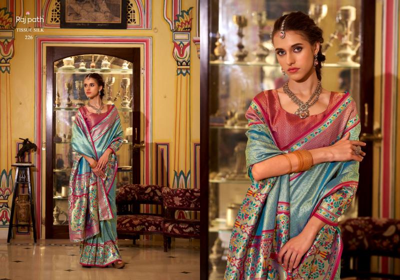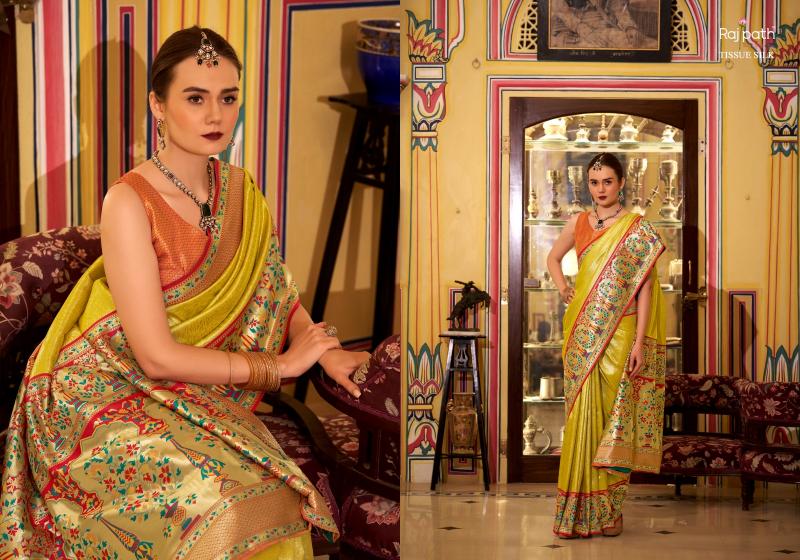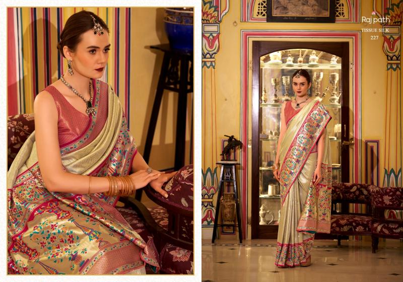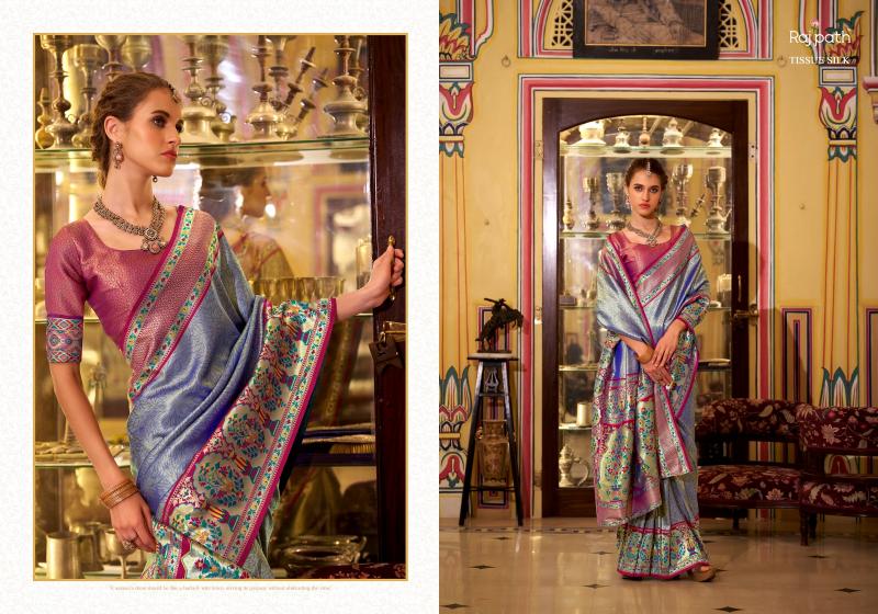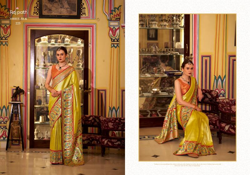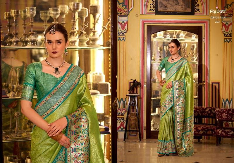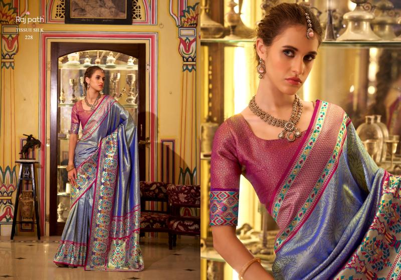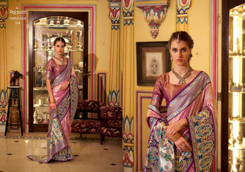 Elegance personified Soft Tissue meets vibrant Colour creating a stunning combinations sophisticated charm on silk, perfect for making a statement Saree Brand - Rajpath Catalog Name -Virashat Silk Series :-223 to 228 Rate : 1895/- +5%GST Fabric: Soft Tissue Silk With Weaving Work Saree Blouse: Soft Tissue Silk Occasion: Party Wear, Festival Wear |