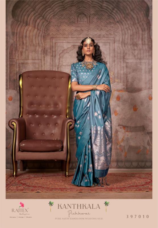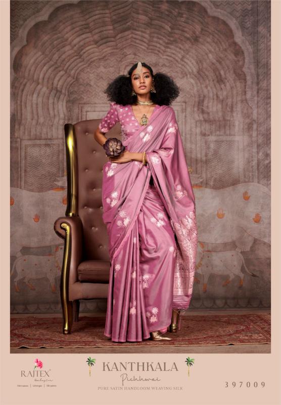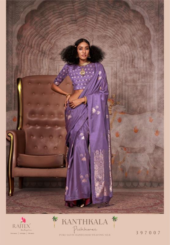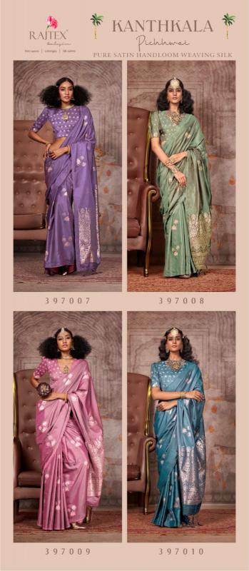 BRAND : RAJTEX CATALOGUE NAME:-KANTHKALA - PICHWAI (DUSTY) SERIES : 397007 To 397010 FABRIC DETAILS:-︎PURE SATIN HANDLOOM WEAVING SILK WITH BANARASI ZAR BLOUSE : BROCADE BLOUSE* RATE:- 1415/- OCCATION : PARTY WEAR, FESTIVAL WEAR |