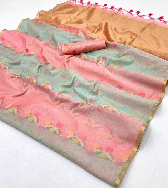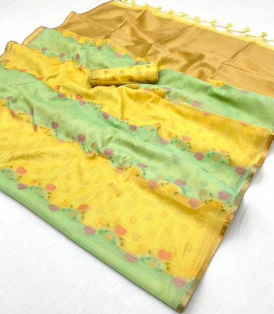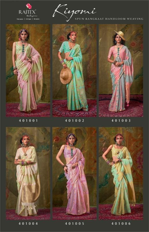 Brand : Rajtex Catalog Name : Kiyomi Silk Series : 401001 To 401006 Saree Fabric : Pure Spun Rangkaat Weaving With Heavy Pallu Saree With Pure Tussles Blouse Fabric : Pure Spun Rangkaat Weaving Fabric Occasion : Party Wear, Uniform Wear |