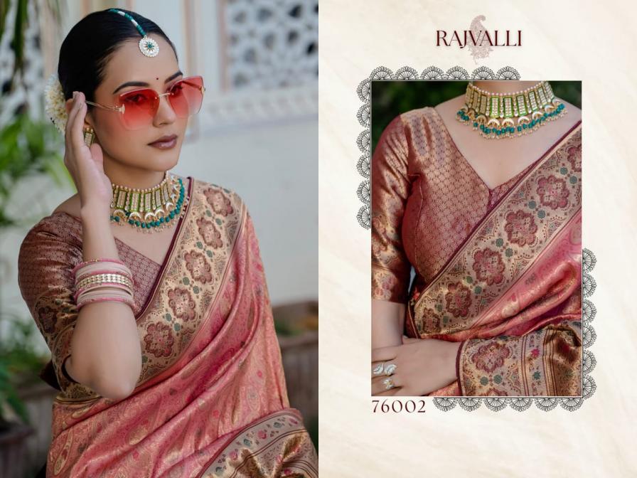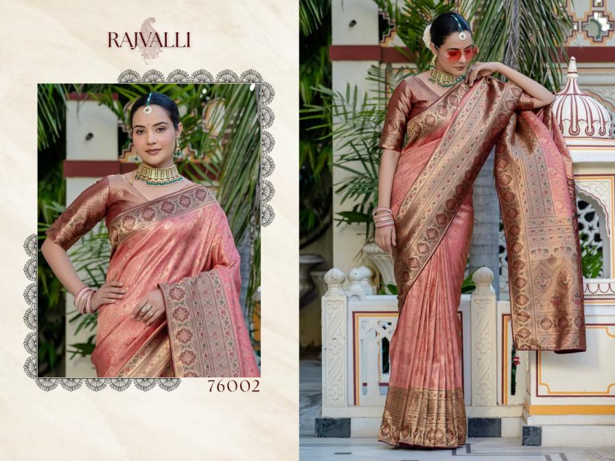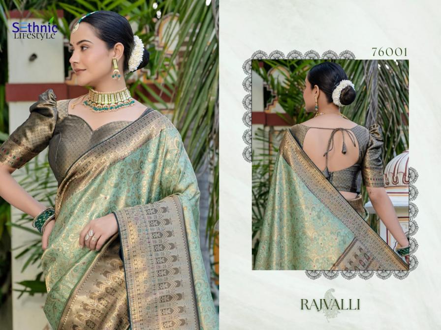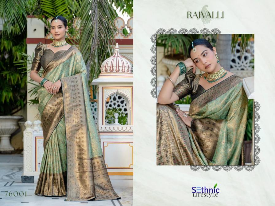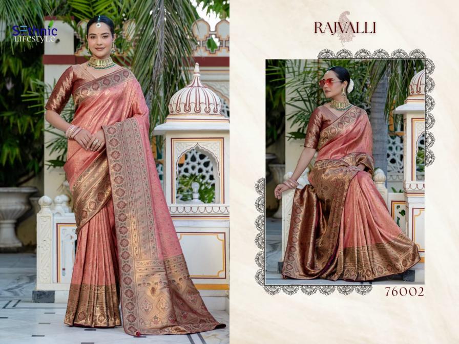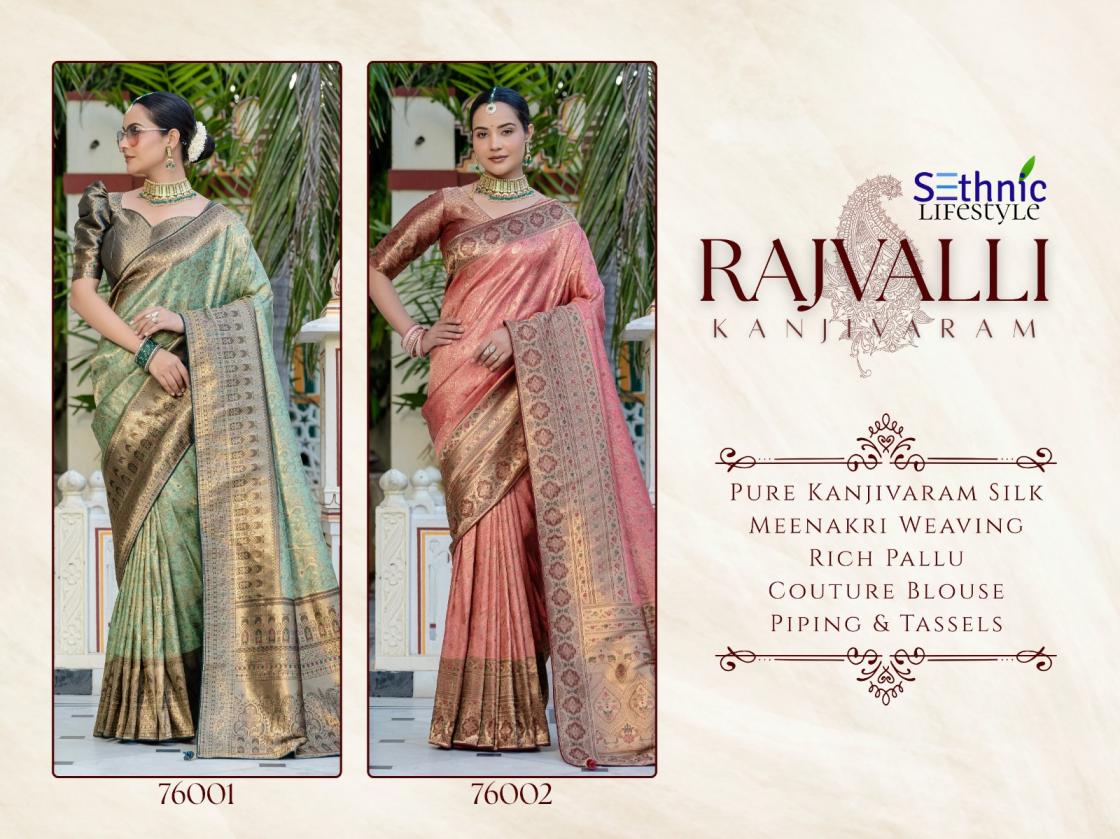 Brand : Sethnic Lifestyle Catalog Name : Rajvalli Series : 76001 TO 76002 Saree Fabric : Kanjivaram Silk Work : Woven — Soft Zari & Meenakari Woven (Jaal & Kairi Pattern) all over Saree, Patta & Pallu Blouse : Rich Meenakari Woven Blouse Embellishment : Premium Piping & Hand Knotted Tassels Rate : 2195/- +5% Gst Occasion: Party Wear ,Festival Wear |