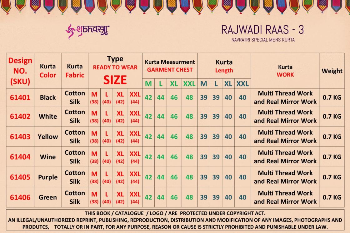 🕺 SHUBHVASTRA - NEW KURTA COLLOCTION 2025 🕺 🤷🏻♂️ New Exclusive Festival Mens Wear Kurta Collection 🤷🏻♂️ 💰 RAJWADI RAAS - 3 • RATE LIST (KURTA) 💰 61401: 620/- PANT (BOTTOM) SIZE : M, L, XL, XXL Real Pic Available. ✅ ⚠️ Wash & Care Instructions. ⚠️ |