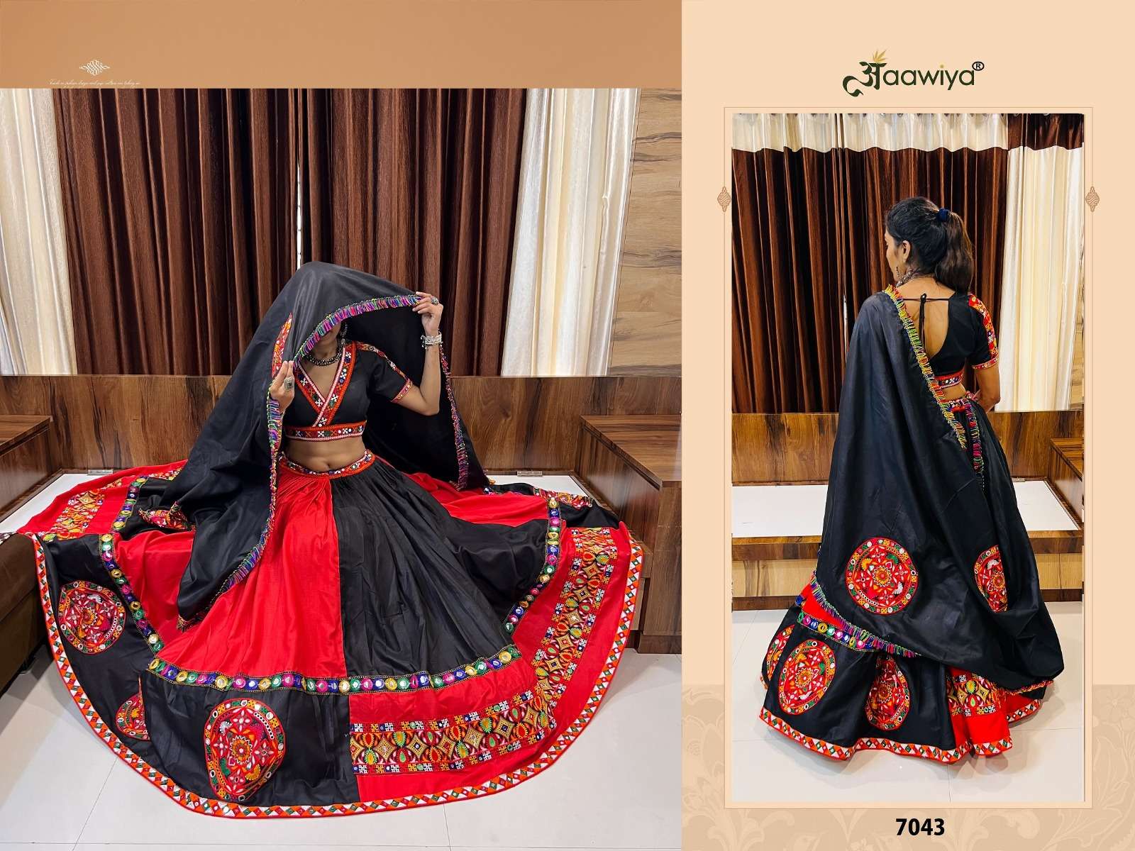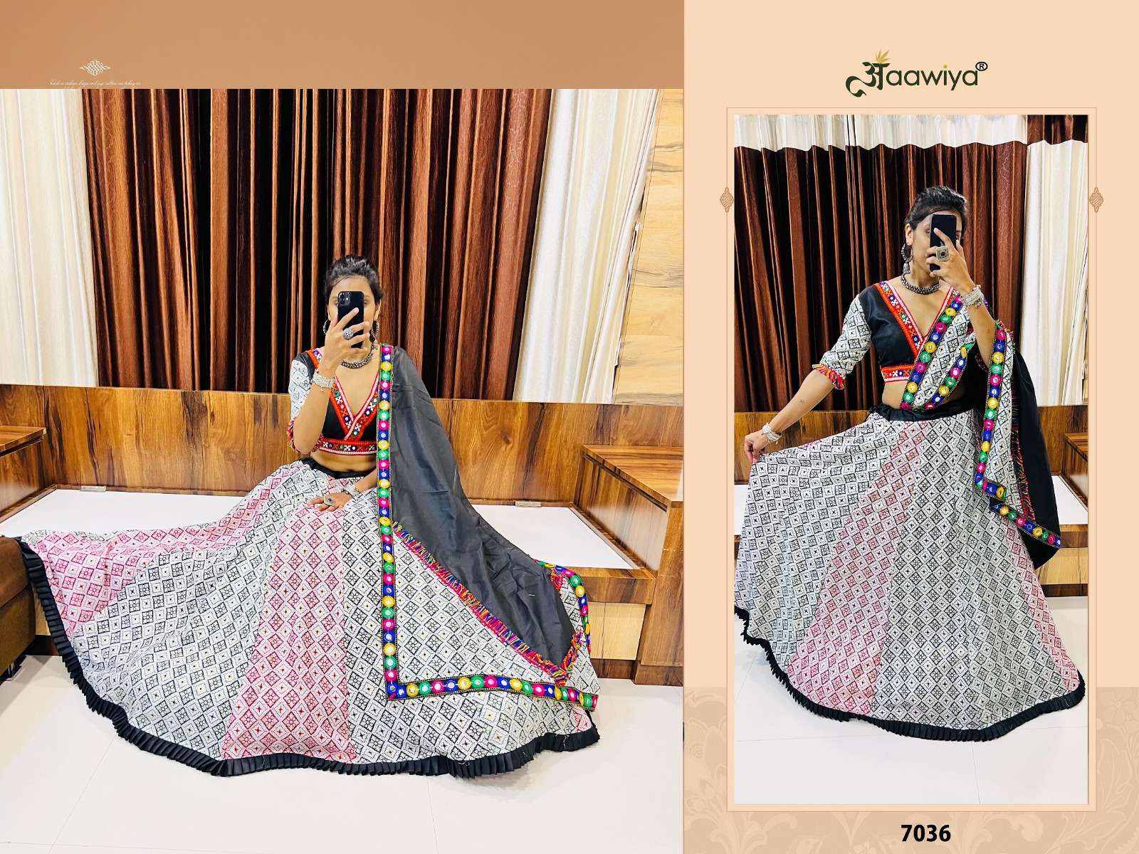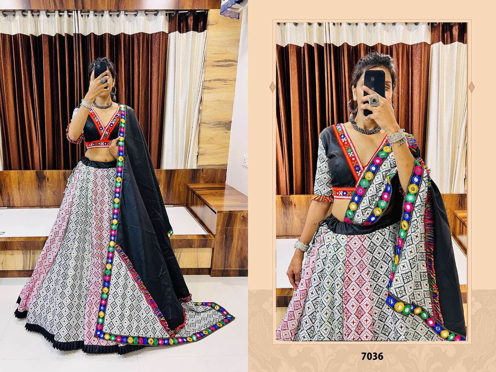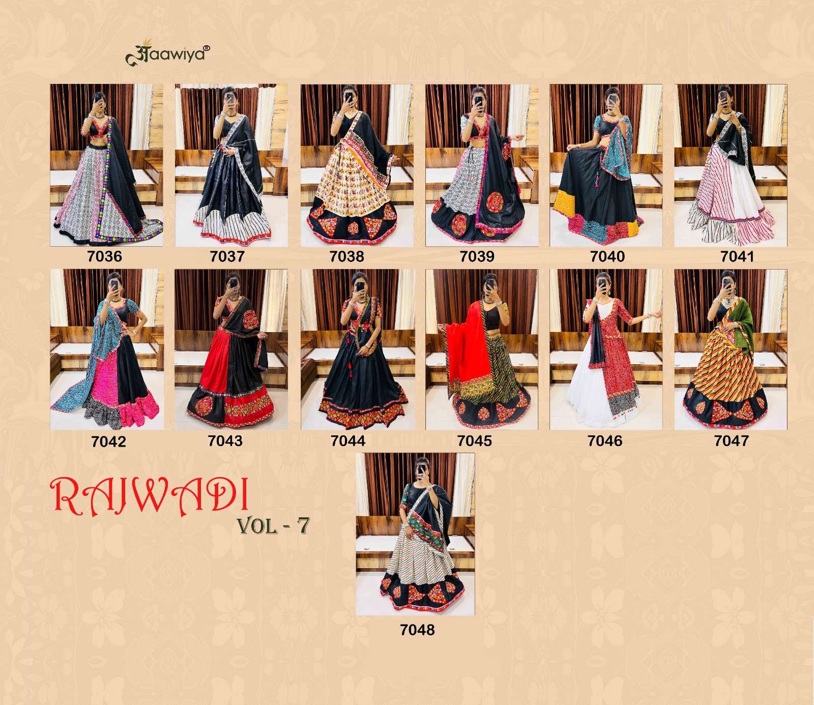 AAWIYA NAVRATRI SPECIAL TRADITIONAL CHANIYA CHOLI COLLECTION 2023 🥁🥢🥢 RAJWADI VOL -7 💐 ORIGINAL PRODUCT 💐 DESIGN NO. 7036 – 2350/- (5.5MTR FLAIR) GST EXTRA 12% LEHENGA: (STITCHED) BLOUSE: (STITCHED) DUPATTA PACKAGE CONTAIN: LEHENGA, BLOUSE, DUPATTA |
