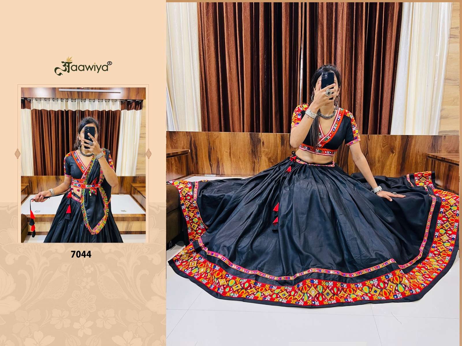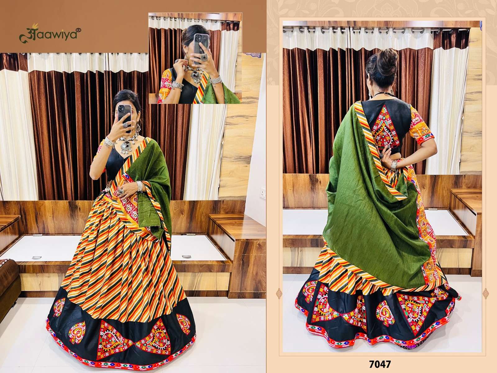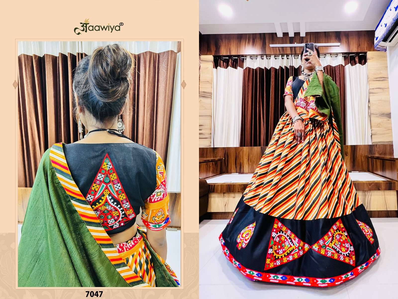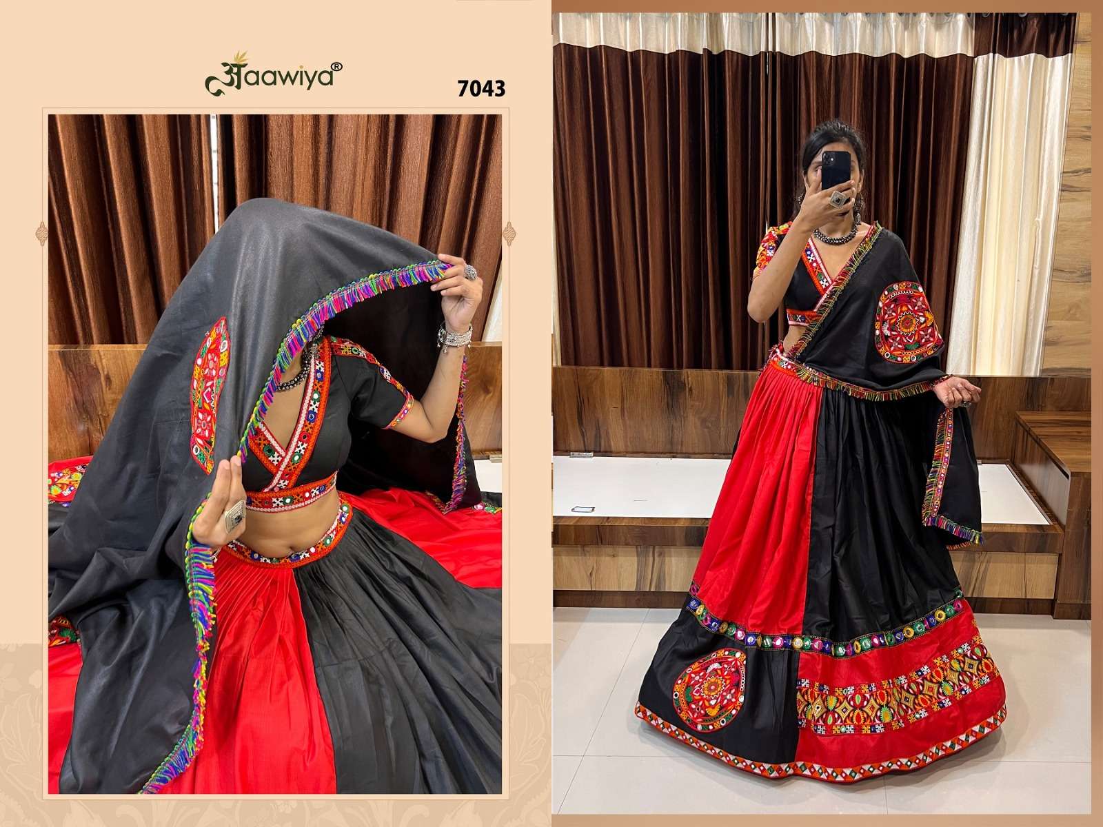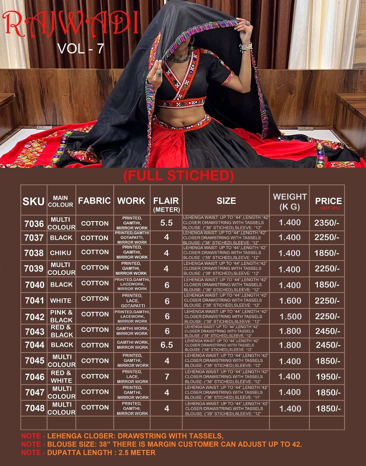 AAWIYA NAVRATRI SPECIAL TRADITIONAL CHANIYA CHOLI COLLECTION 2023 🥁🥢🥢 RAJWADI VOL -7 💐 ORIGINAL PRODUCT 💐 DESIGN NO. 7036 – 2350/- (5.5MTR FLAIR) GST EXTRA 12% LEHENGA: (STITCHED) BLOUSE: (STITCHED) DUPATTA PACKAGE CONTAIN: LEHENGA, BLOUSE, DUPATTA |