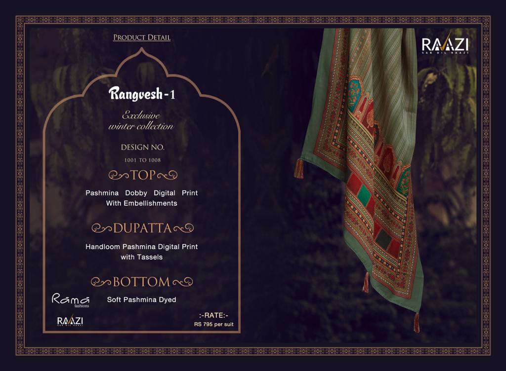 Rama Fashion By Raazi Presents Rangvesh Vol 1 Pashmina Digital Print Salwar Suits Collections