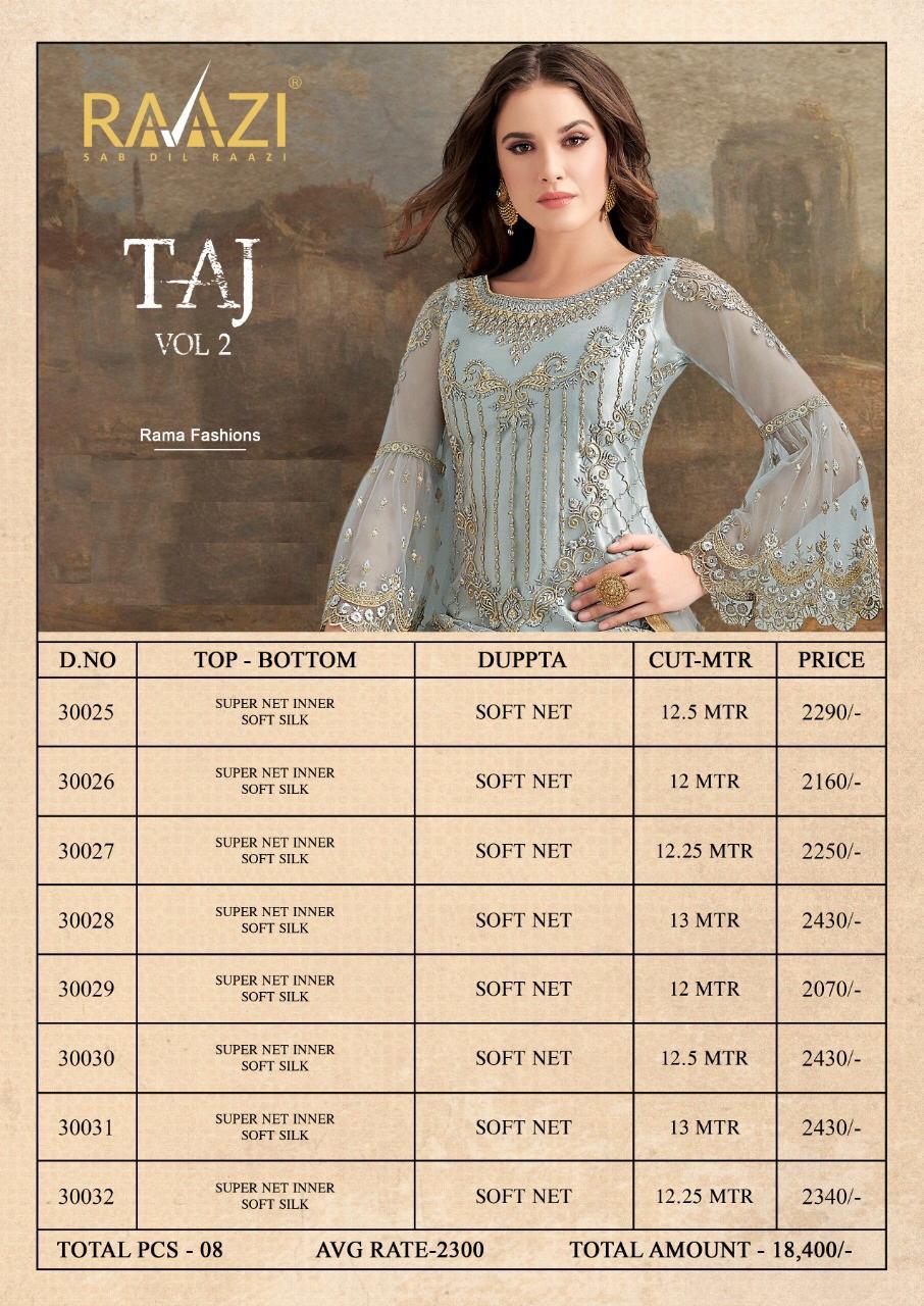 Brand - RAMA FASHIONS . Catlog name - RAAZI Taj vol -2. Series -30025 to 30032 GST 5 Percent Extra Delivery 3-4 days |