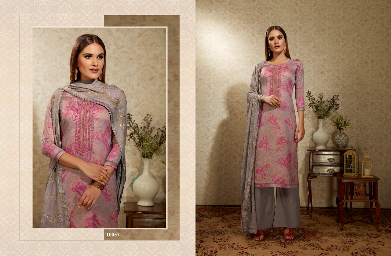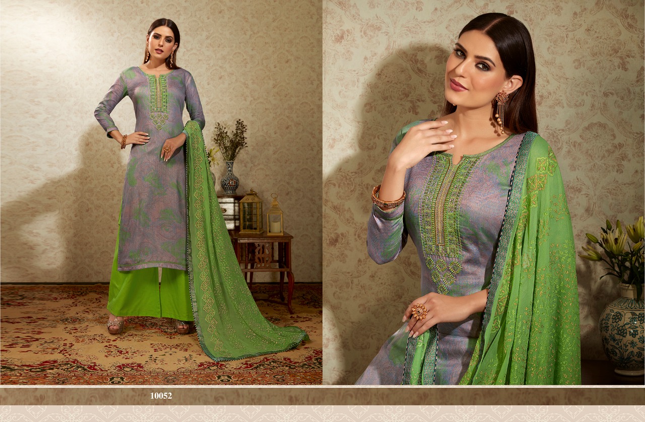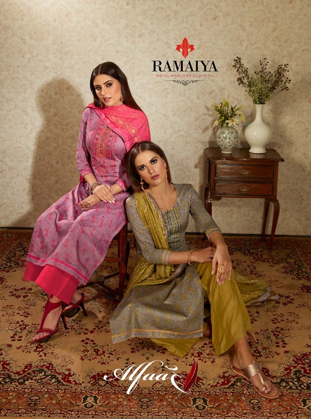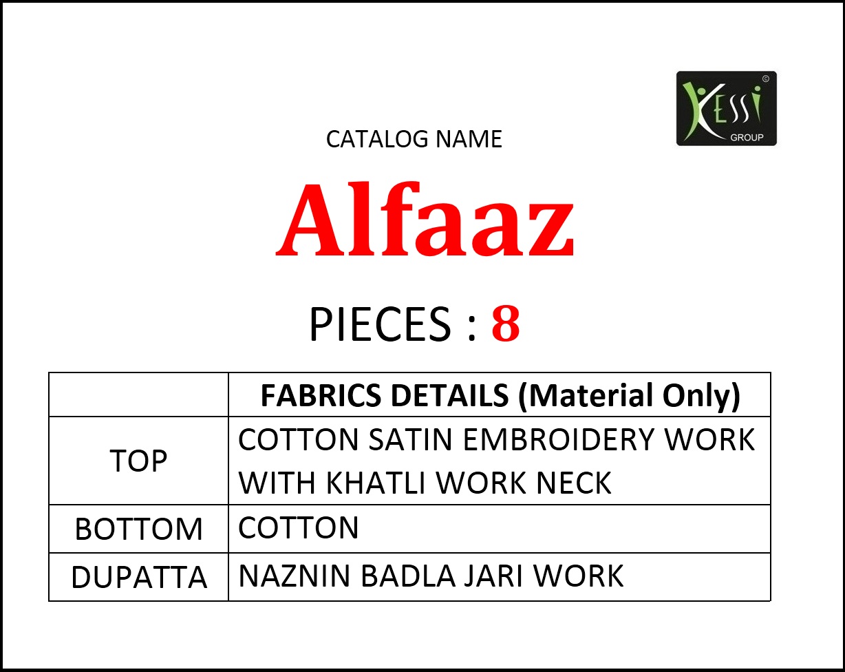 Ramaiya (Kessi Fabrics Pvt. Ltd.) has launched Catalog name : Alfaaz Fabric Details ▪Top:- COTTON SATIN EMBROIDERY WORK WITH KHATLI WORK NECK ▪Bottom:- COTTON ▪Dupatta:- NAZNIN BADLA JARI WORK ▪Total Design:- 8 Rate ~ 749/-₹ |