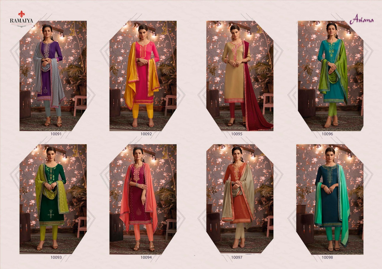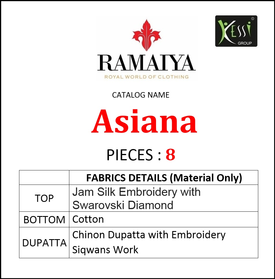 Ramaiya (Kessi Fabrics Pvt. Ltd.) has launched Catalog name : *Asiana * Fabric Details ▪Top:- Jam Silk Embroidery with Swarovski Diamond ▪Bottom:- Cotton ▪Dupatta:- Chinon Dupatta with Embroidery Siqwans Work ▪Total Design:- 8 Rate 799 |