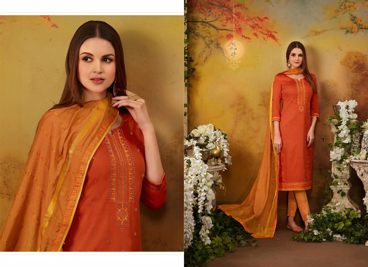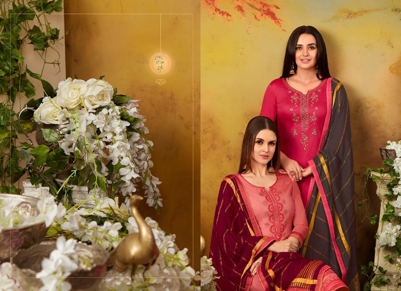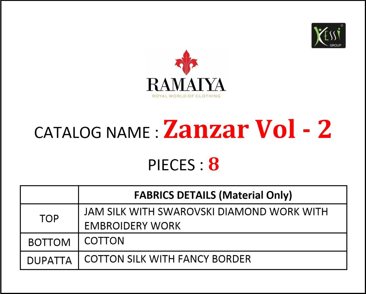Ramaiya (Kessi Fabrics Pvt. Ltd.) has launched Catalog name : Zanzar Vol - 2 Fabric Details âªTop:- JAM SILK WITH SWAROVSKI DIAMOND WORK WITH EMBROIDERY WORK âªBottom:- Cotton âªDupatta:- COTTON SILK WITH FANCY BORDER âªTotal Design:- 8 Rate - 799/- Set to set . GST 5 Percent Extra â°Dispatching 5 to 6 days later |